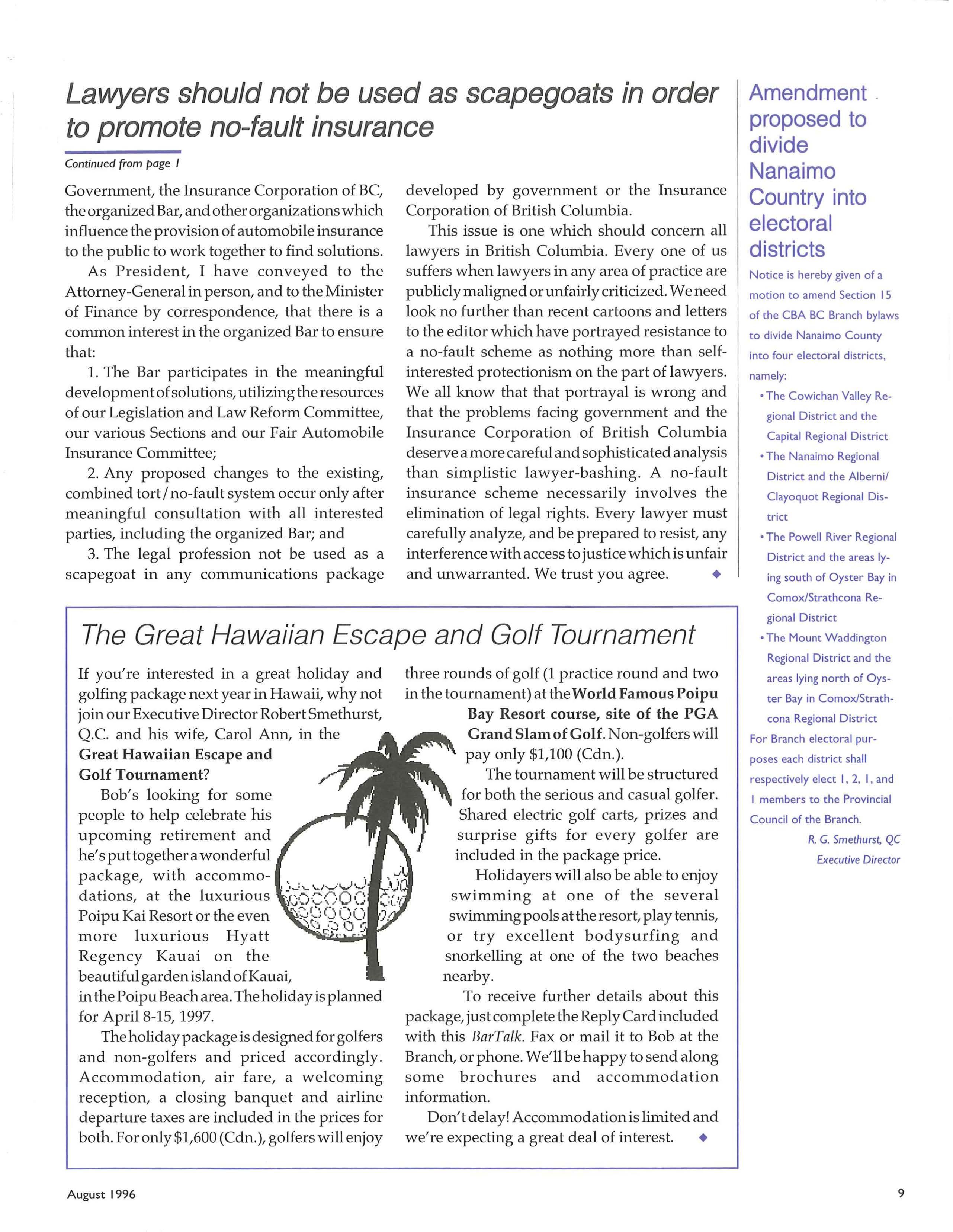 To date, the Branch has chosen to maintain a low profile, leaving it to the Trial Lawyers Association of BC to mobilize the energies of our mutual members to address the subject in the public forum. Elsewhere in this issue, you will find an article by Jim Murphy, President of the Trial Lawyers of BC. Also, background information from the Trial Lawyers regarding the merit of no-fault insurance has been enclosed with this edition of BarTalk This information is provided to educate our members on the merits of the tort system and the experience of other jurisdictions where no-fault schemes are in place.
