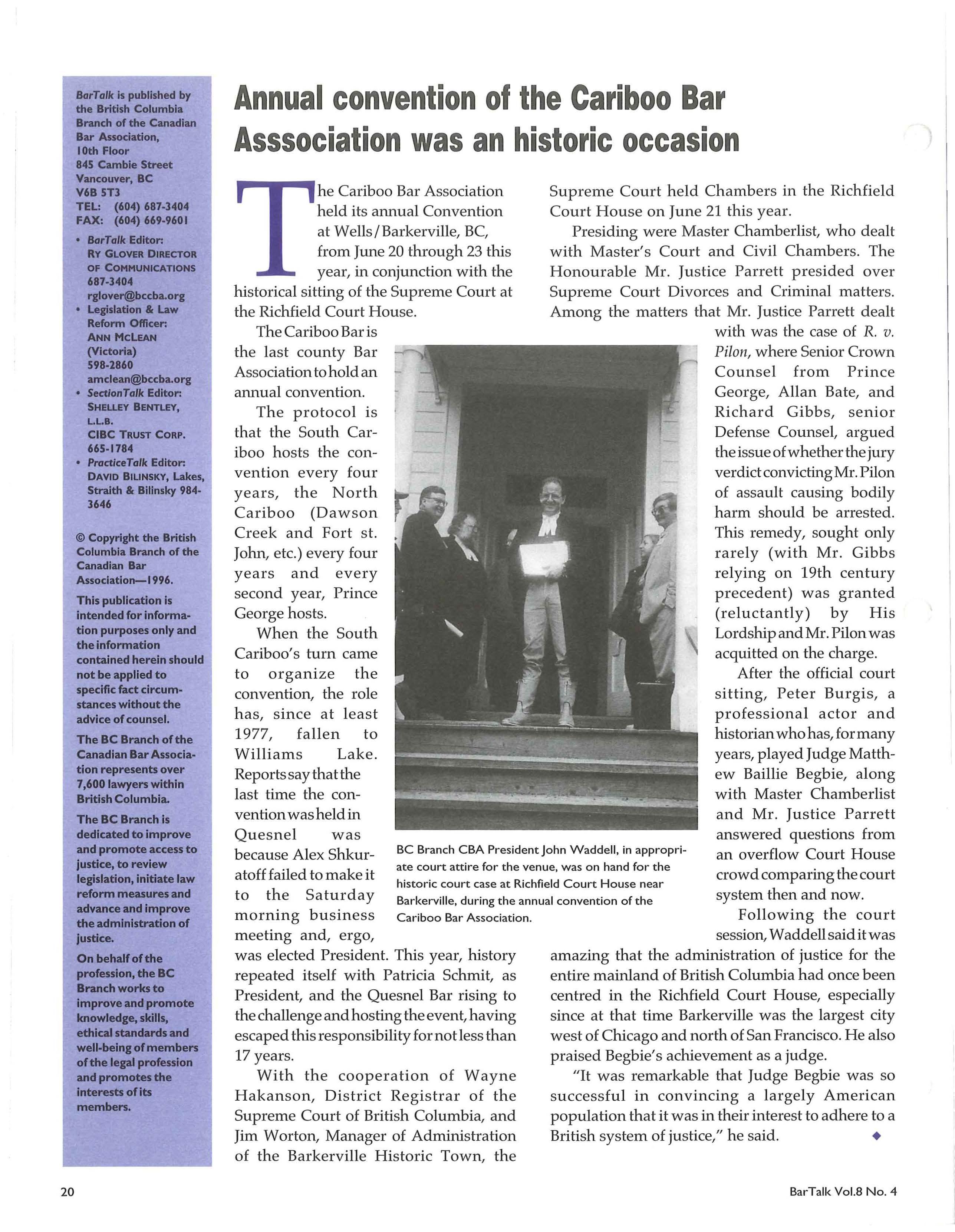 he Cariboo Bar Association held its annual Convention at Wells/Barkerville, BC, from June 20 through 23 this year, in conjunction with the historical sitting of the Supreme Court at the Richfield Court House