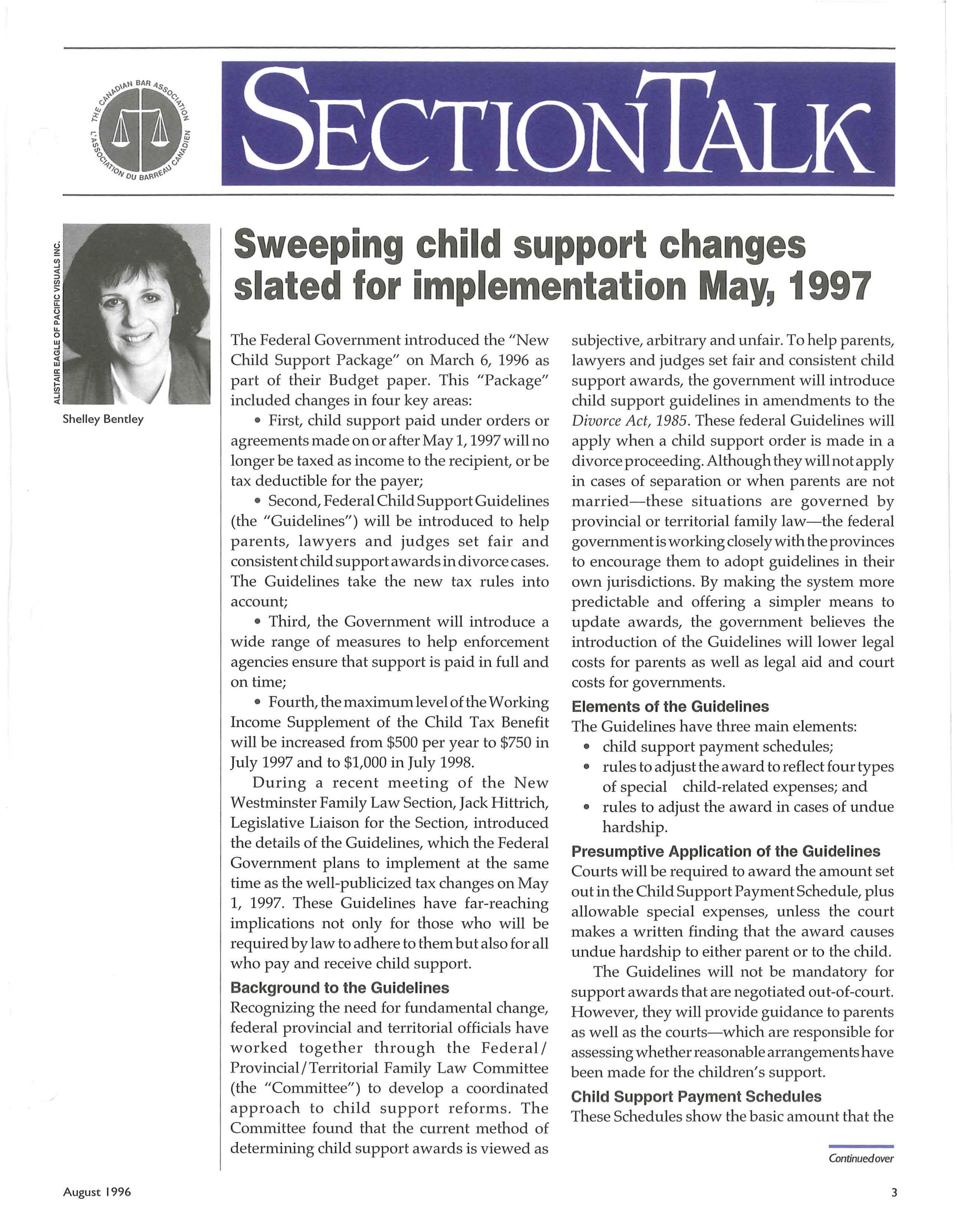 During a recent meeting of the New Westminster Family Law Section, Jack Hittrich, Legislative Liaison for the Section, introduced the details of the Guidelines, which the Federal Government plans to implement at the same time as the well-publicized tax changes on May 1, 1997. These Guidelines have far-reaching implications not only for those who will be required by law to adhere to them but also for all who pay and receive child support.