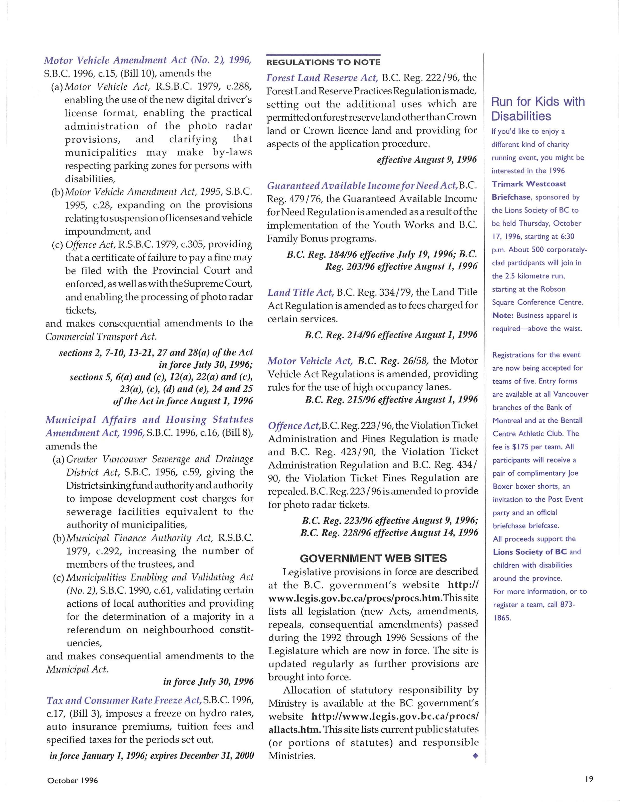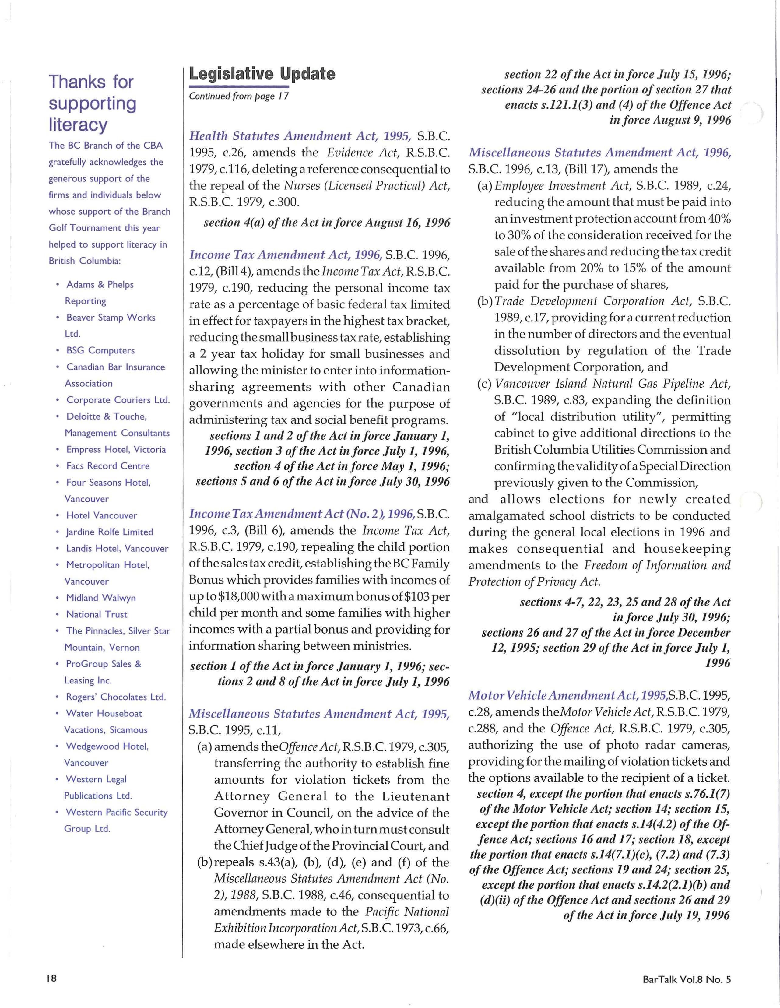 Legislative provisions in force are described at the B.C. government's website http:// www.legis.gov.bc.ca/procs/procs.htm.This site lists all legislation (new Acts, amendments, repeals, consequential amendments) passed during the 1992 through 1996 Sessions of the Legislature which are now in force. The site is updated regularly as further provisions are brought into force.