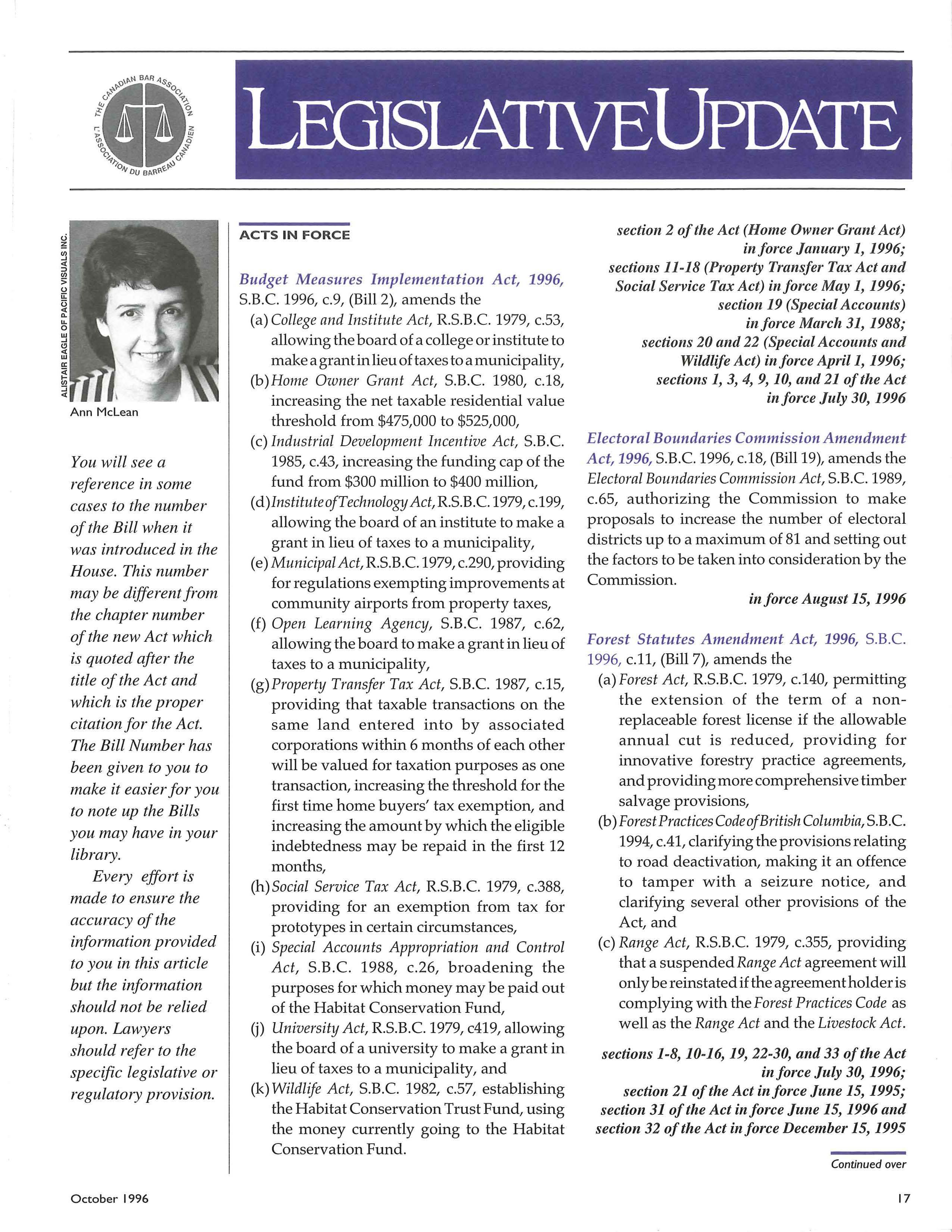 • Legislation & Law Reform Officer: ANN MCLEAN (Victoria) 598-2860 amclean@bccba.org