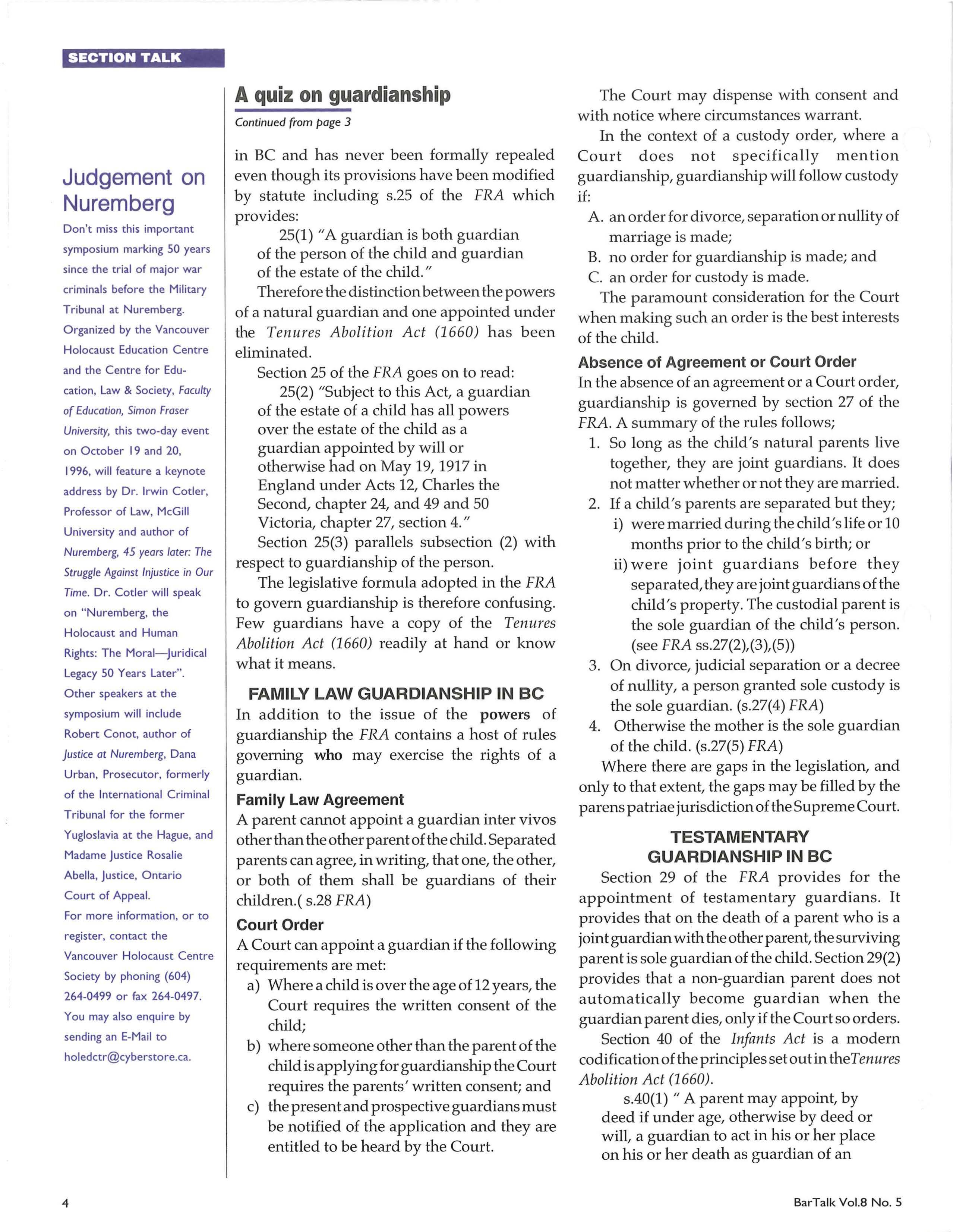 In a recent Wills and Trusts Subsection meeting ManJ Hamilton and Catherine Branch discussed the complex law of guardianship. TheJj provided these answers to questions commonly arising in practice. Could you advise your client about them?