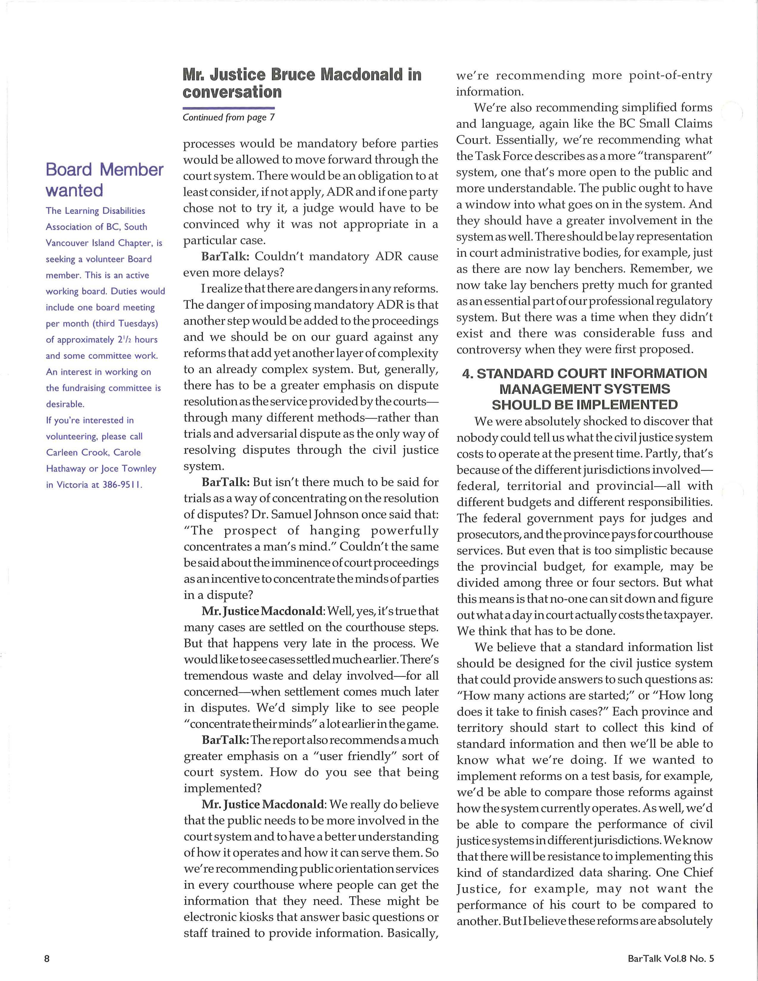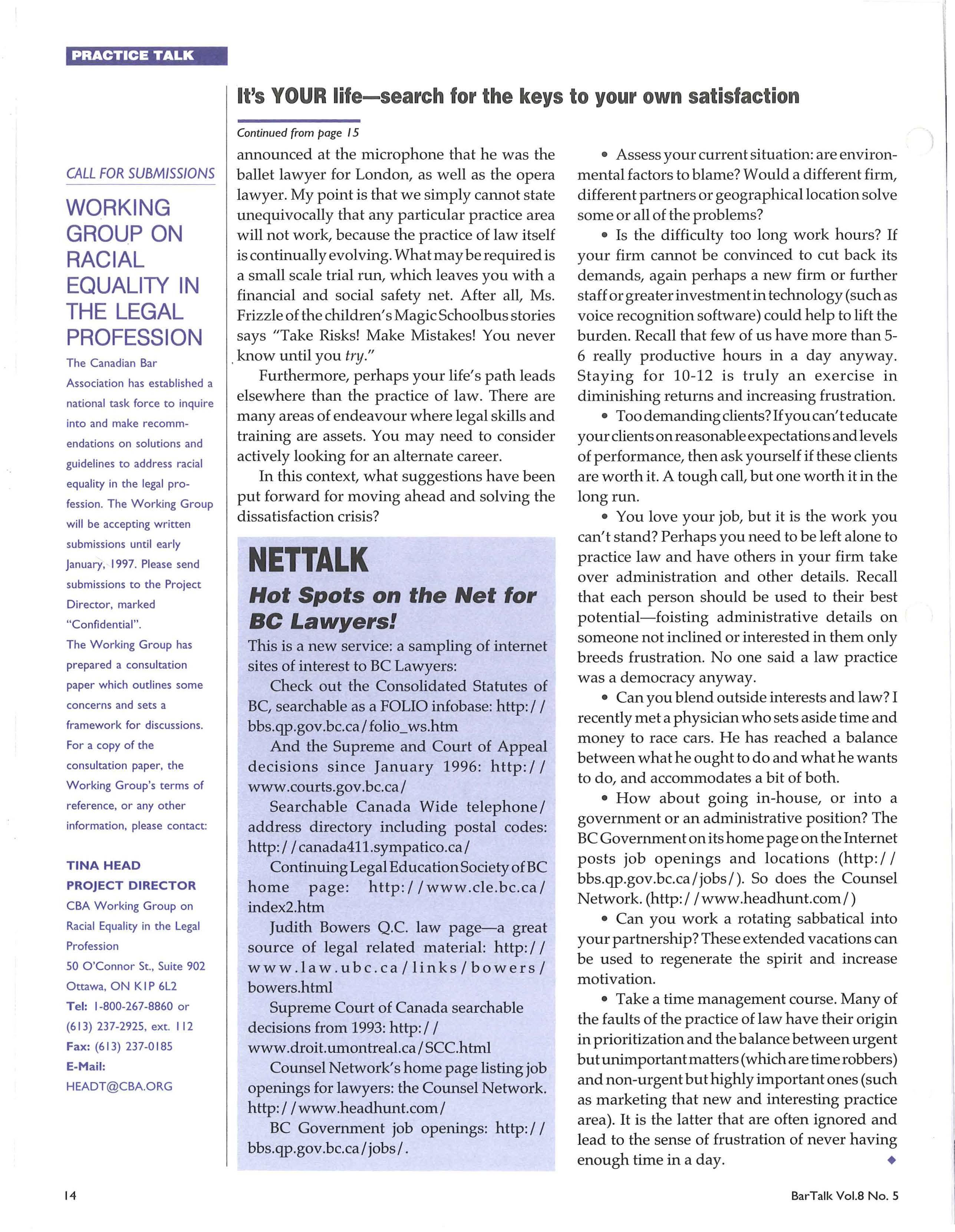 BarTalk is published by the British Columbia Branch of the Canadian Bar Association, lOth Floor 845 Cambie Street Vancouver, BC V6B 5Tl