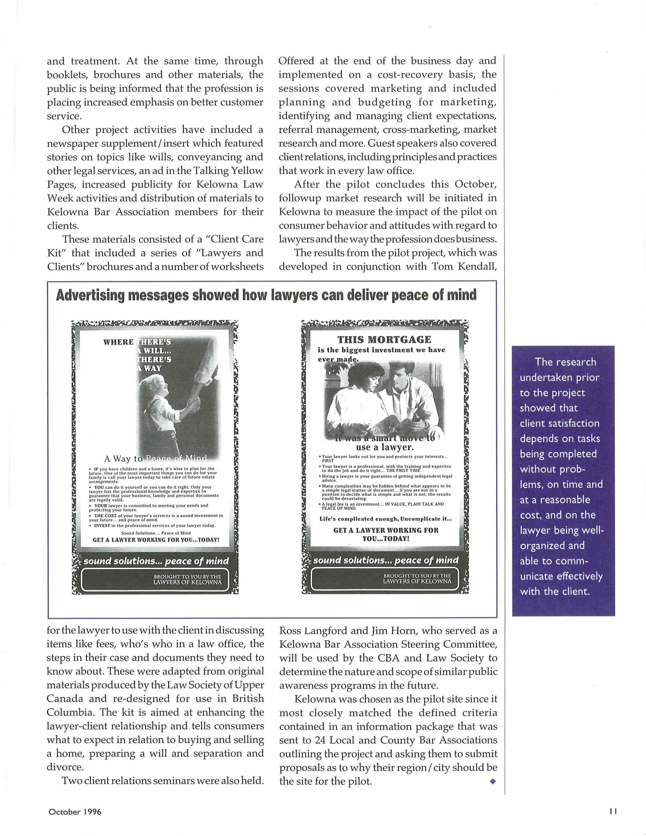 These are disturbing findings . More, disturbing though, are the implications. Many people do not even bother seeking justice within our current system because it make s no particular economic sense to do so Not only, therefore, are we restricting access to justice for many of the public, we are also restricting the number of problems we are able to solve. We should be concerned about thi s and I hope that we can, as a profession, help to bring about the changes that are needed. If nothing else, this i s also a matter of acting in our own self-interest, as Mr. Justice Bruce Macdonald points out in an interview published elsewhere in this issue of BarTalk I commend this interview to you