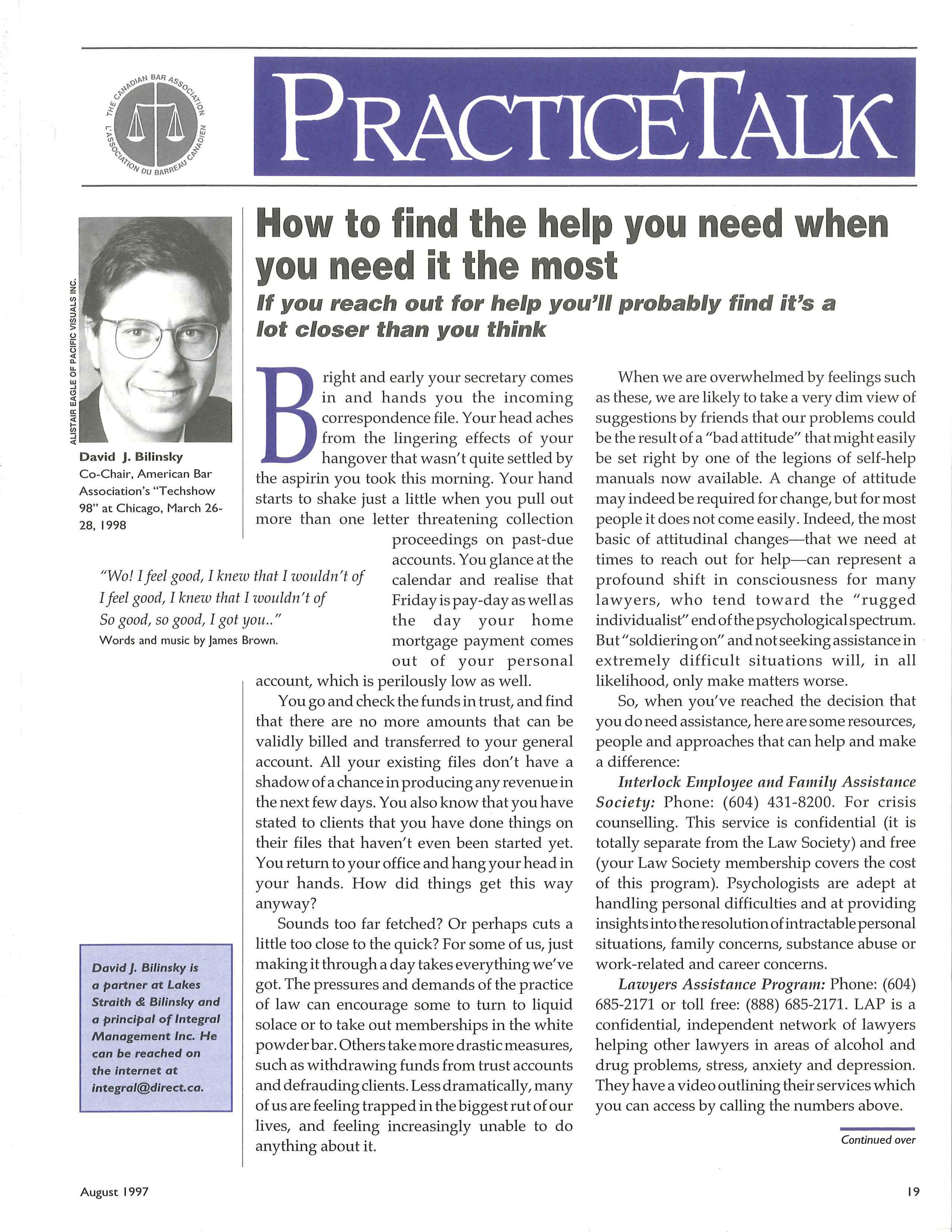 Remember, don't accept imitations! The CBA Branch directory is the original and greatest lawyers' directory for British Columbia! It's jampacked with all the information you need to contact everyone who matters in BC's legal community. You'll find information about the Branch, Sections, Practice Advisory Panels, Provincial Council, second language listings, and lots of other valuable information. This year, as an added bonus, the directory will contain personal fax numbers and firm web sites.