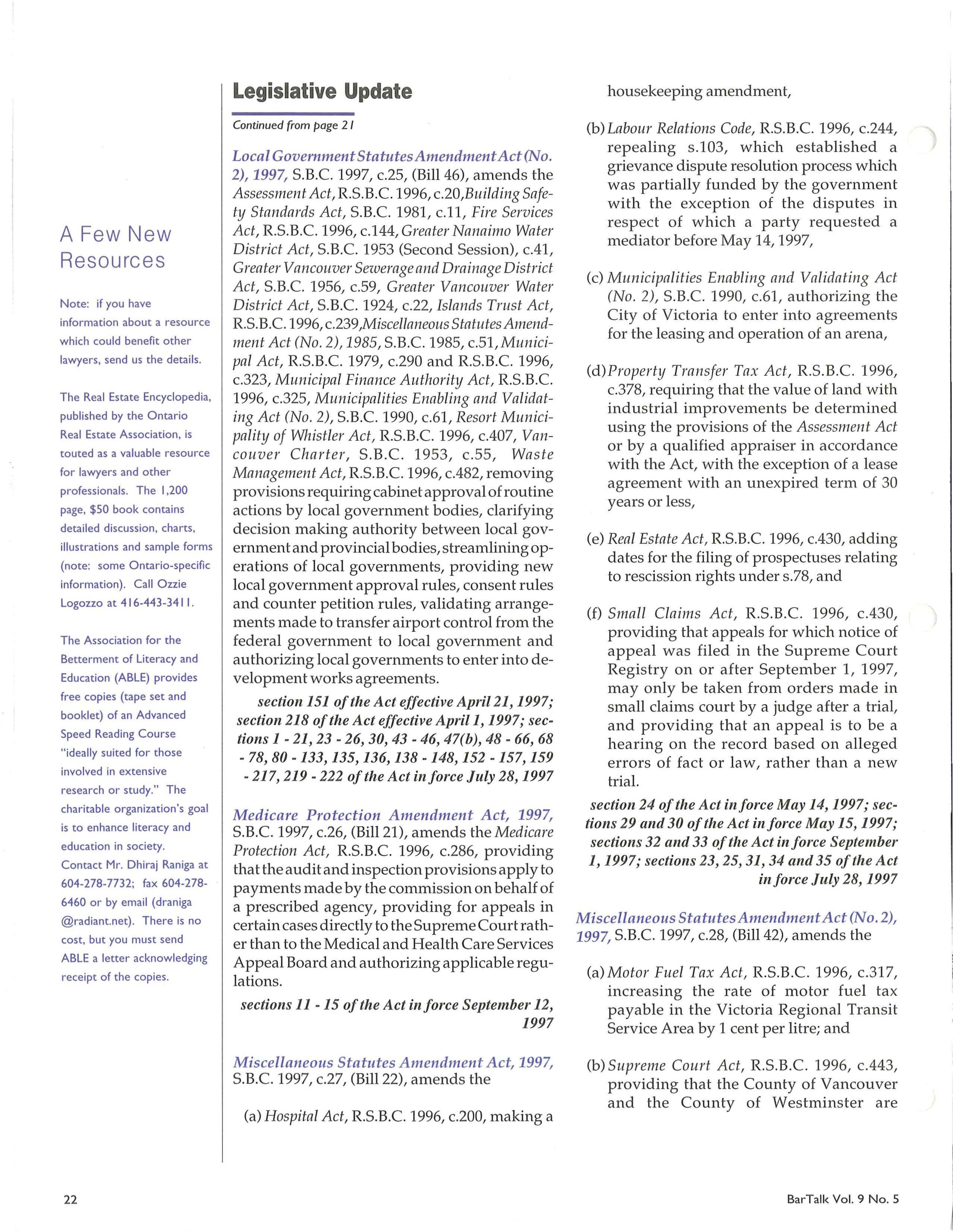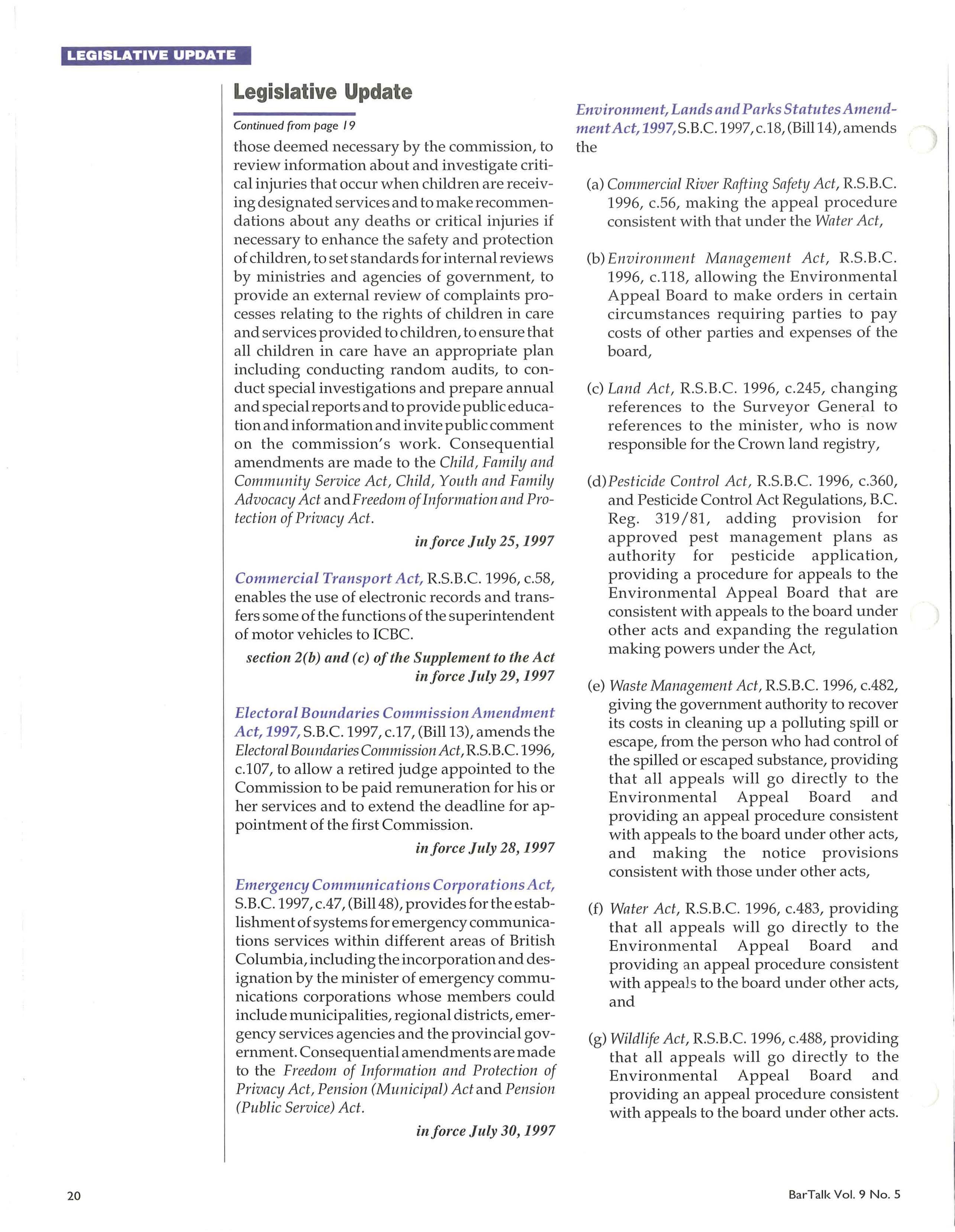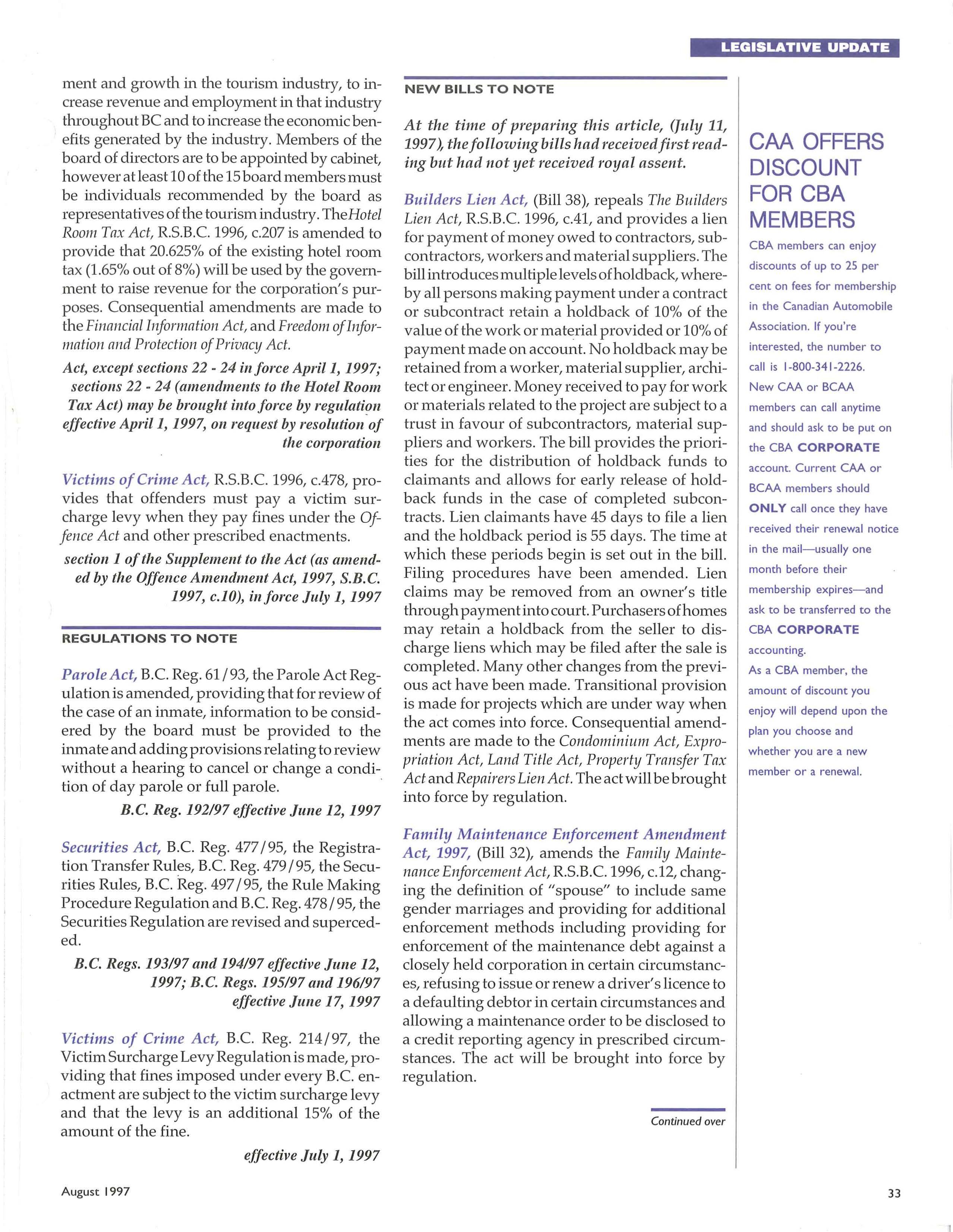 At the time of preparing this article, (July 11, 1997 ), the following bills had received first reading but had not yet received royal assent.
