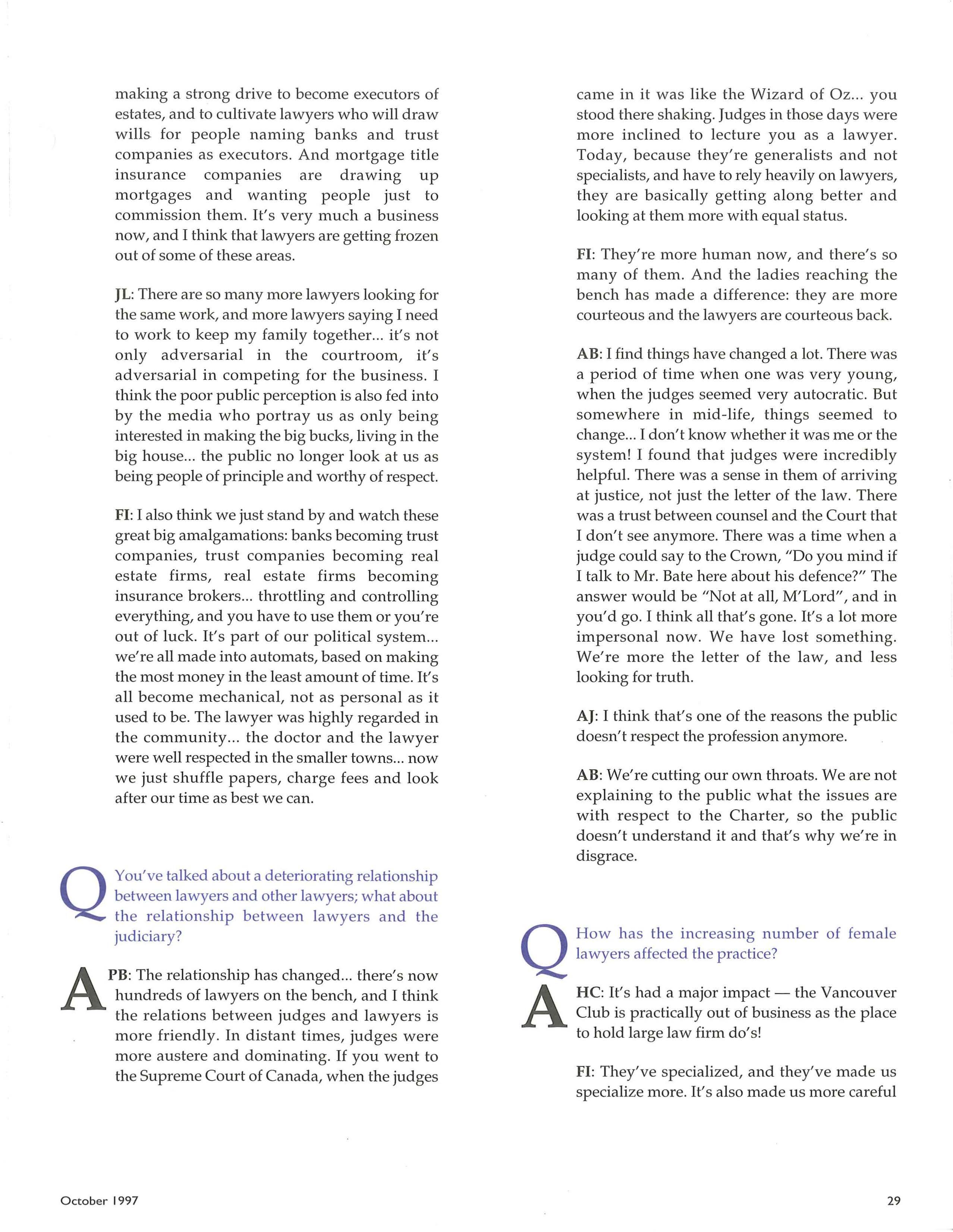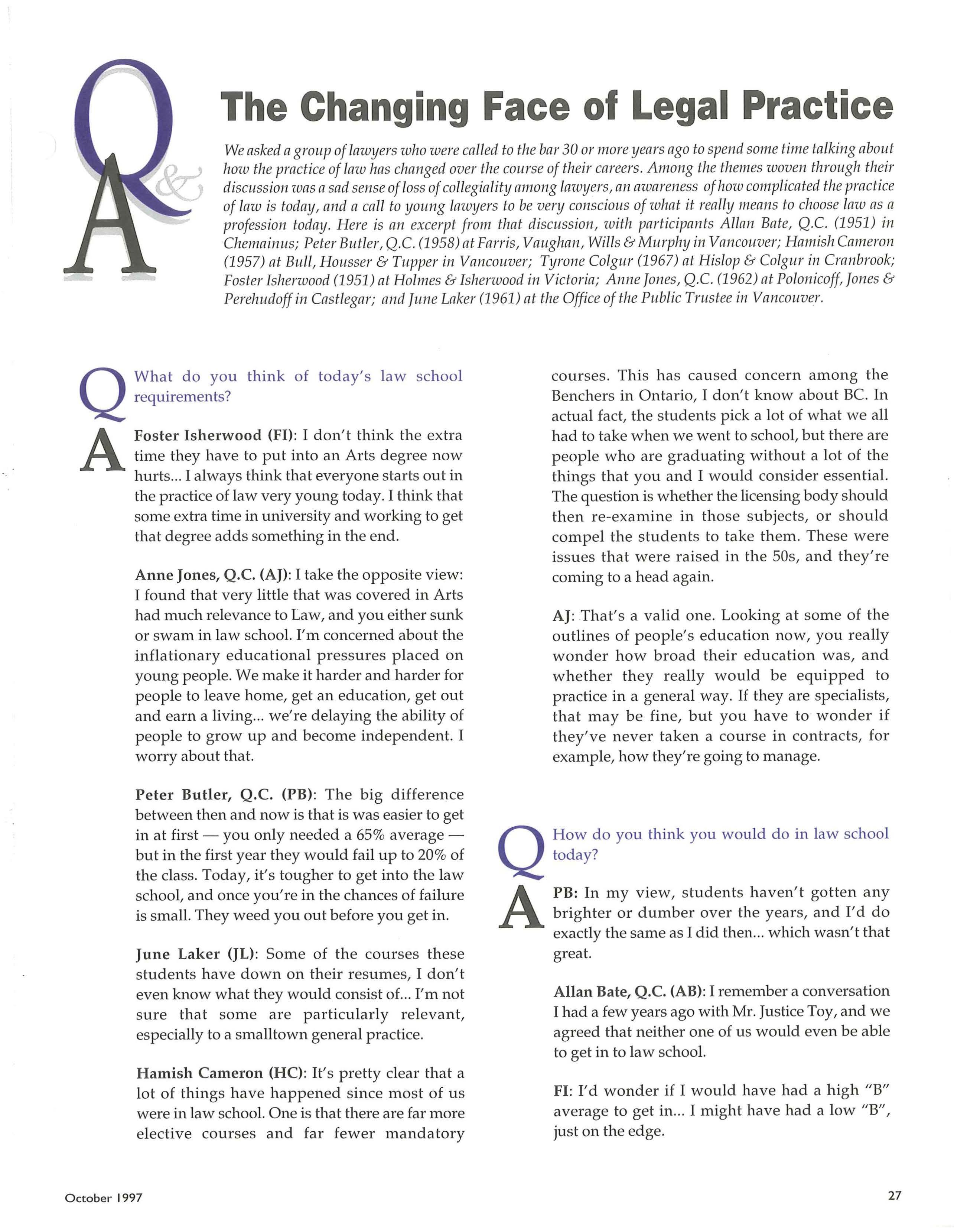 We asked a group of lawyers who were called to the bar 30 or more years ago to spend some time talking about how the practice of law has changed over the course of their careers. Among the themes woven through their discussion was a sad sense of loss of collegiality among lawyers, an awareness of how complicated the practice of law is today , and a call to young lawyers to be very con sci ous of what it really means to choose law as a profession today. Here is an excerpt from that discussion, with participants Allan Bate , Q.C. (1951) in Chemainus; Peter Butler, Q.C. (1958) at Farris, Vaughan, Wills & Murphy in Vancouver; Hamish Cameron (1957) at Bull, Hausser & Tupper in Vancouver; Tyrone Colgur (1967) at Hislop & Col gur in Cranbrook; Foster Ish erwood (1951) at Holmes & Isherw ood in Victoria; Anne Jon es, Q C. (1962) at Polonicoff, Jones & Perehudoff in Castlegar ; and June Laker (1961) at the Office of the Public Trustee in Vancouver