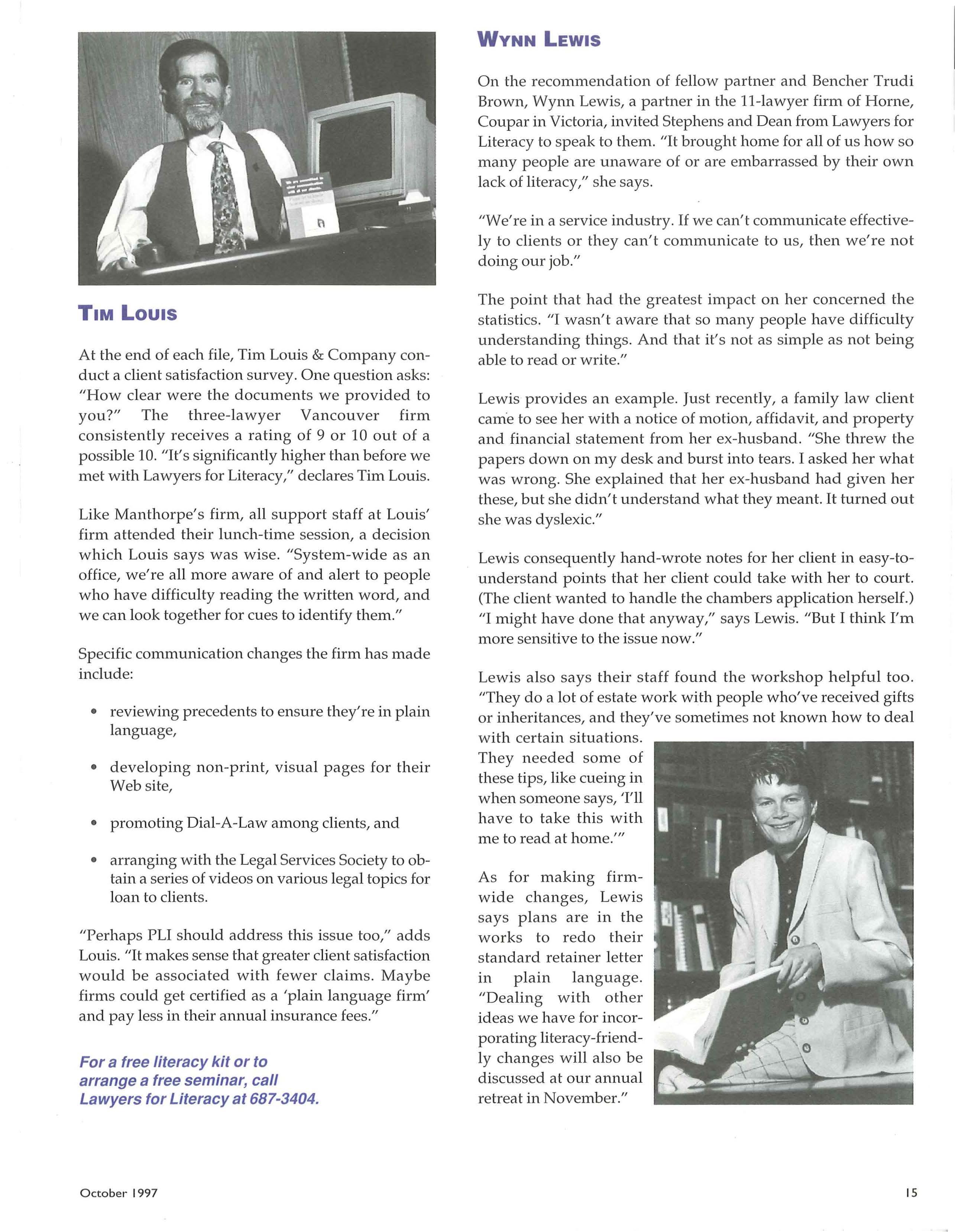 measure s , and looking at the r e gulation s attached to the legislation which are now being formulated; the intense lobbying by Notarie s Public to be granted the right to handle probate and incorporations; the implementation of Rule 65 in Vancouver and other Court initiated policies dealing with case management, pretrial procedures, & mediation; monitoring the move away from court reporters in trials to dependency on recording apparatus; continuing difficulties faced by women in the profe s sion; encouraging greater multicultural participation in Bar activities, and the list goes on