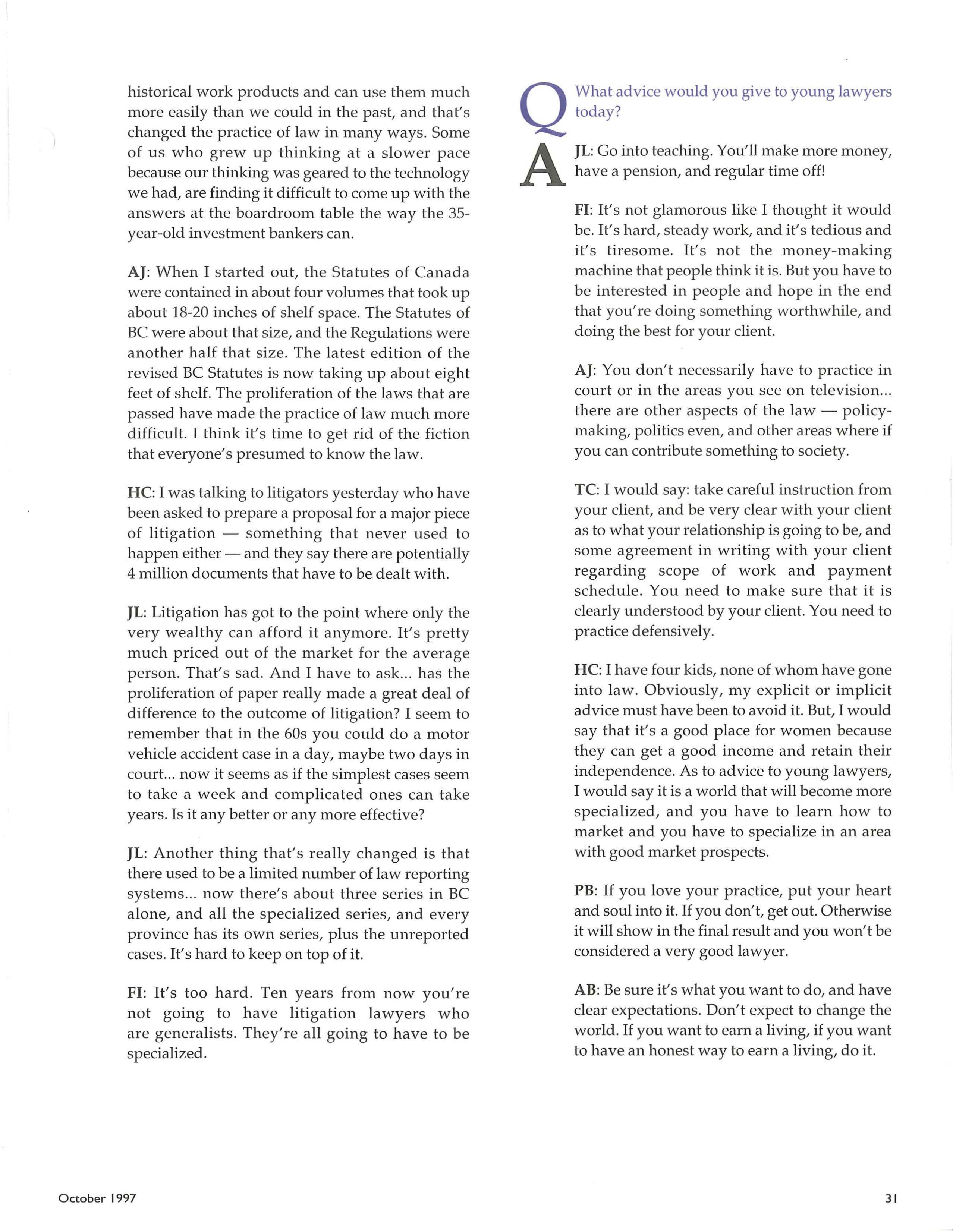 JL: Another thing that's really changed is that there used to be a limited number of law reporting systems ... now there's about three series in BC alone, and all the specialized series, and every province has its own series, plus the unreported cases. It's hard to keep on top of it.