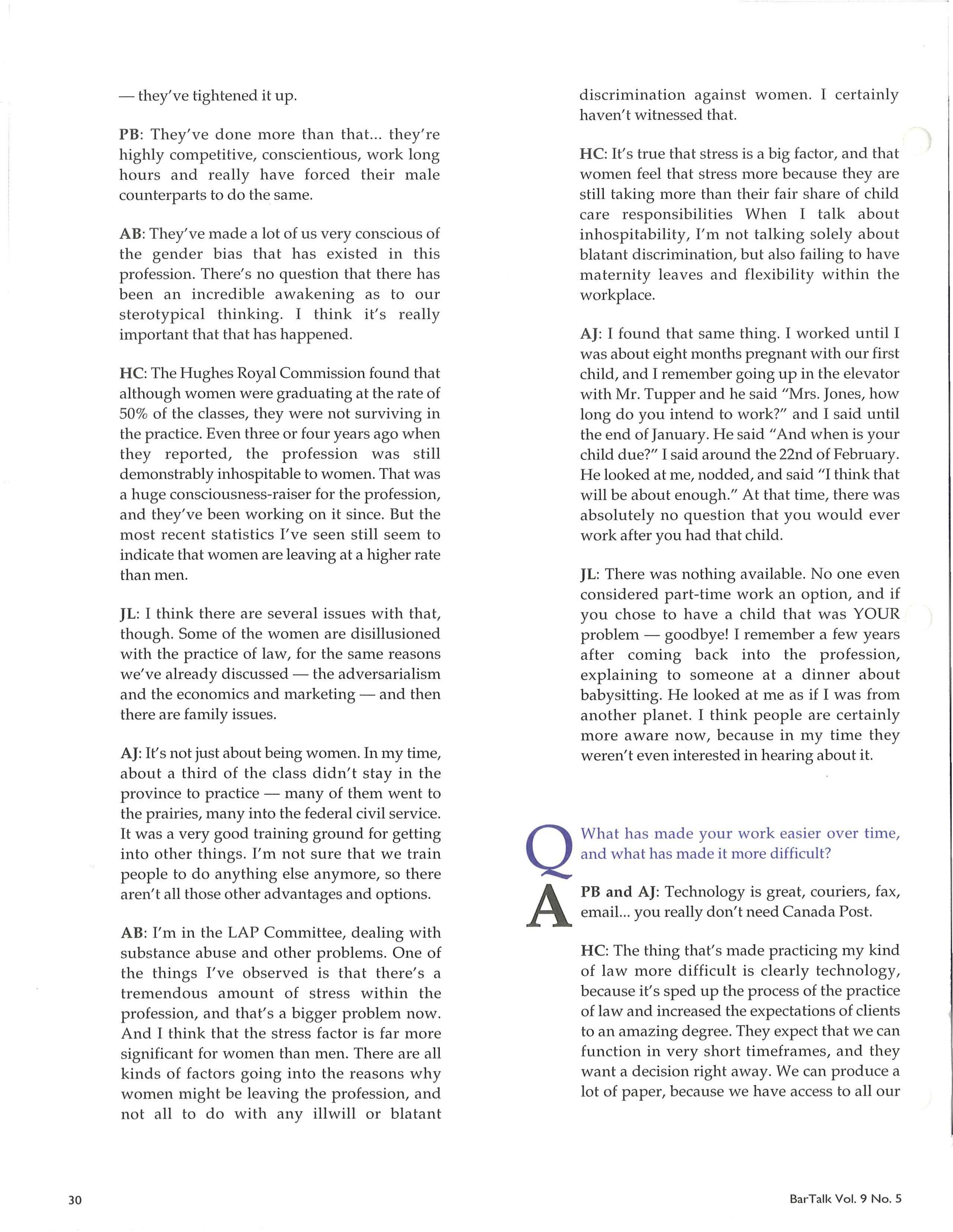 HC: The Hughes Royal Commission found that although women were graduating at the rate of 50 % of the classes, they were not surviving in the practice Even three or four years ago when they reported, the profession was still demonstrably inhospitable to women. That was a huge consciousness-raiser for the profession, and they've been working on it since . But the most recent statistics I've seen still seem to indicate that women are leaving at a higher rate than men.