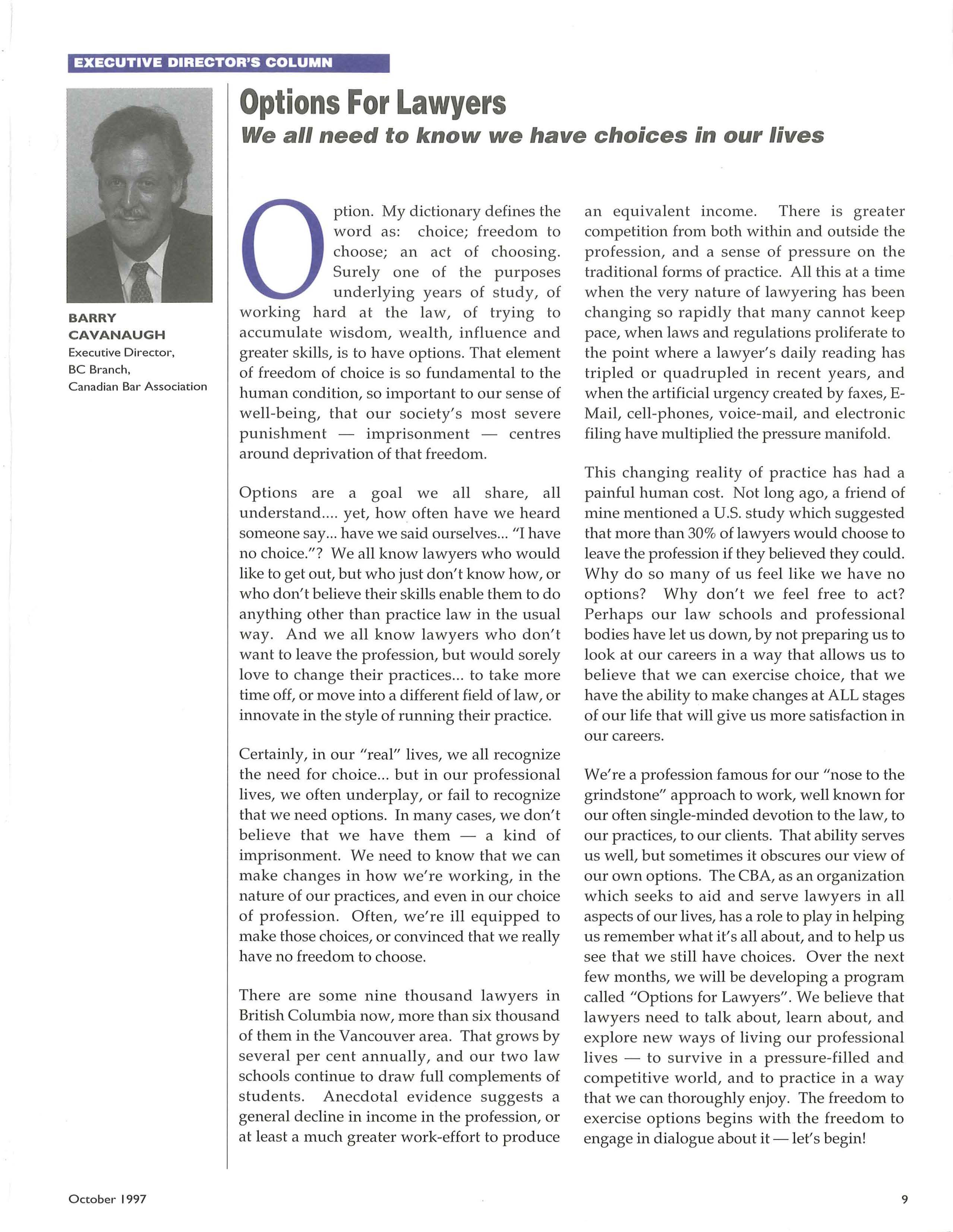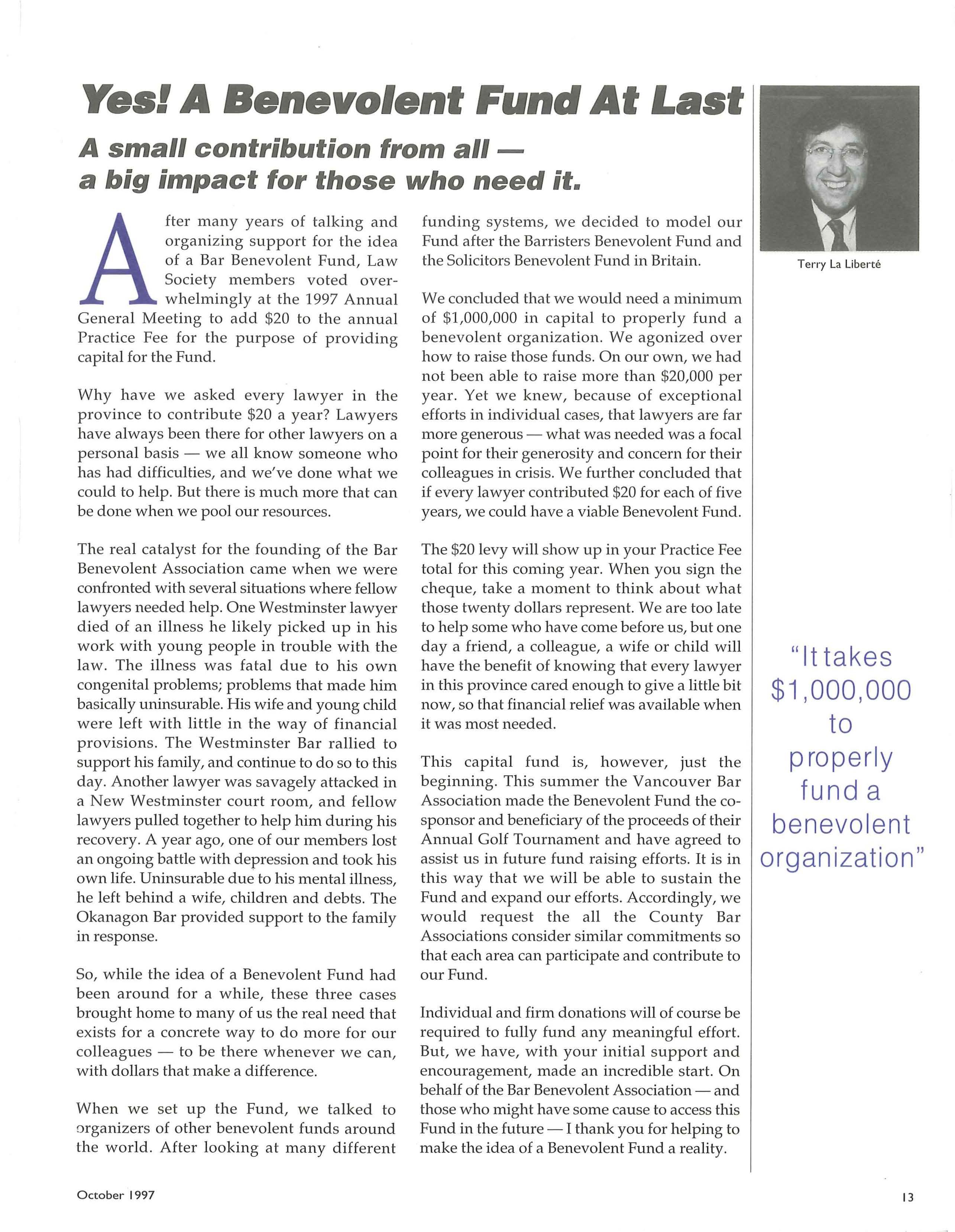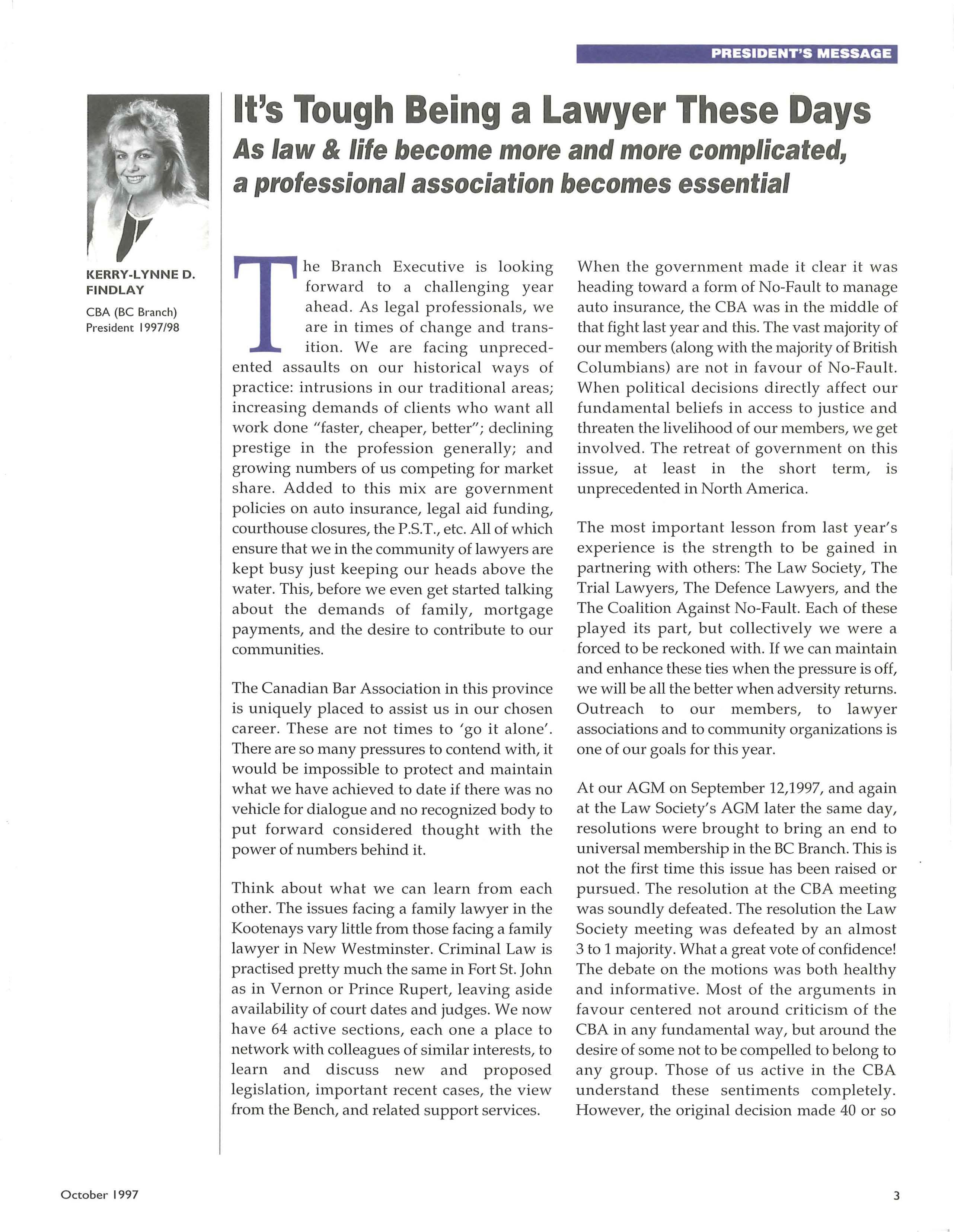 At our AGM on September 12,199 7, and again at the Law Society 's AGM lat er th e sa me day, resolution s were brought to bring an end to universal membership in the BC Branch. Thi s is not the first time thi s issue has been raised or pursued . The re so lution at the CBA meeting was soundly defea ted. The resolution the Law Society meeting was defeated by an almost 3 to 1 majority . What a great vote of confidence! The debate on the motions was both healthy and informative. Most of th e arguments in favour centered not around criticism of th e CBA in any fundamental way, but a round the desire of some not to be compelled to belong to any group. Those of us activ e in the CBA under s tand the se se ntiment s completely. Howev er, the original decision made 40 or so