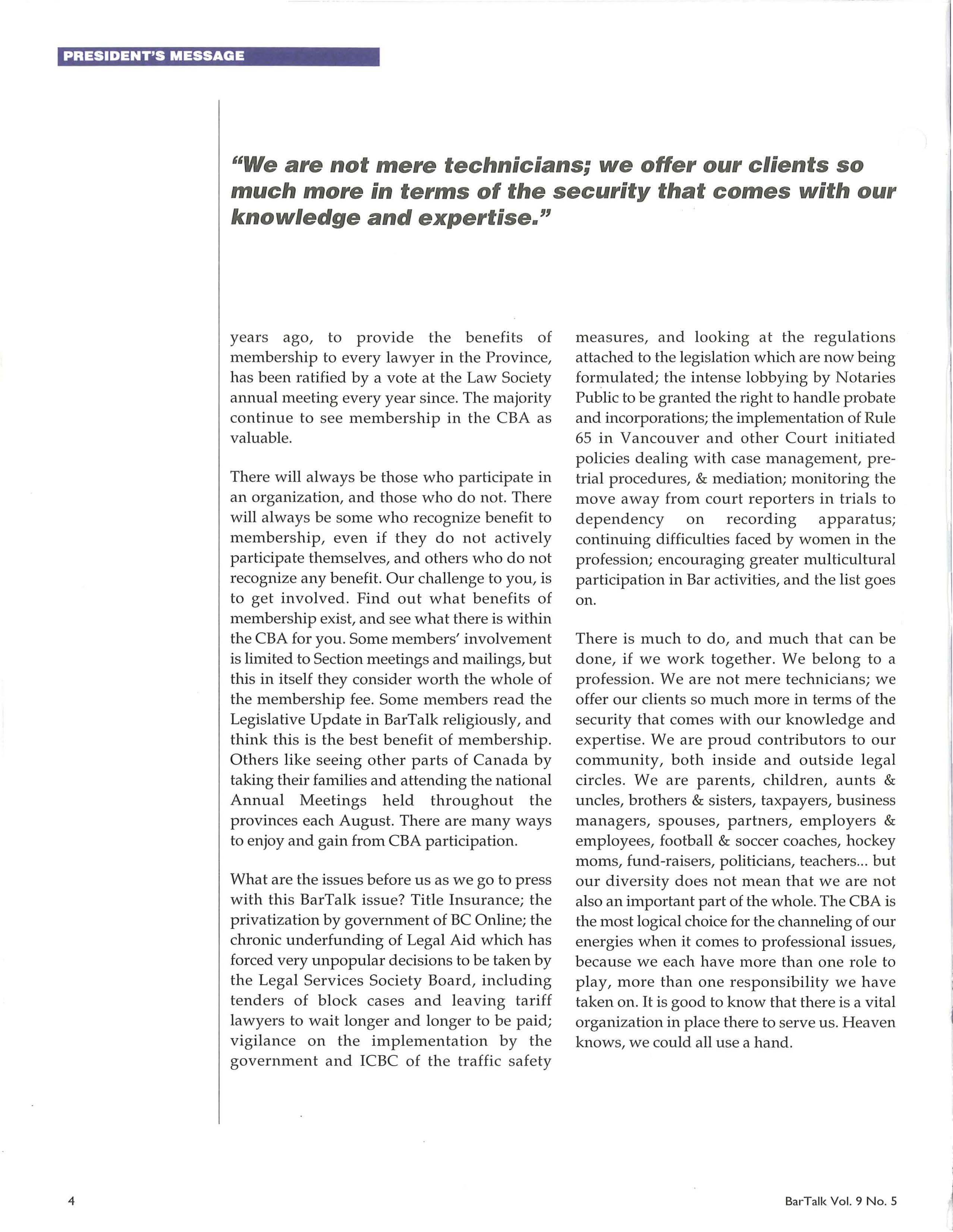 There is much to do, and much that can be done , if we work together. We belong to a profession. We are not mere technicians; we offer our clients so much more in terms of the security that comes with our knowledge and expertise. We are proud contributors to our community, both inside and outside legal circles We are parents, children, aunt s & uncles, brothers & sisters, taxpayers, business managers, spouses, partners, employers & employees, football & soccer coaches, hockey moms, fund-raisers, politicians, teachers but our diversity does not mean that we are not also an important part of the whole The CBA is the mo s t logical choice for the channeling of our energies when it comes to professional issues, because we each have more than one role to play , more than one responsibility we have taken on It is good to know that there is a vital organization in place there to serve u s Heaven knows, we could all use a hand.