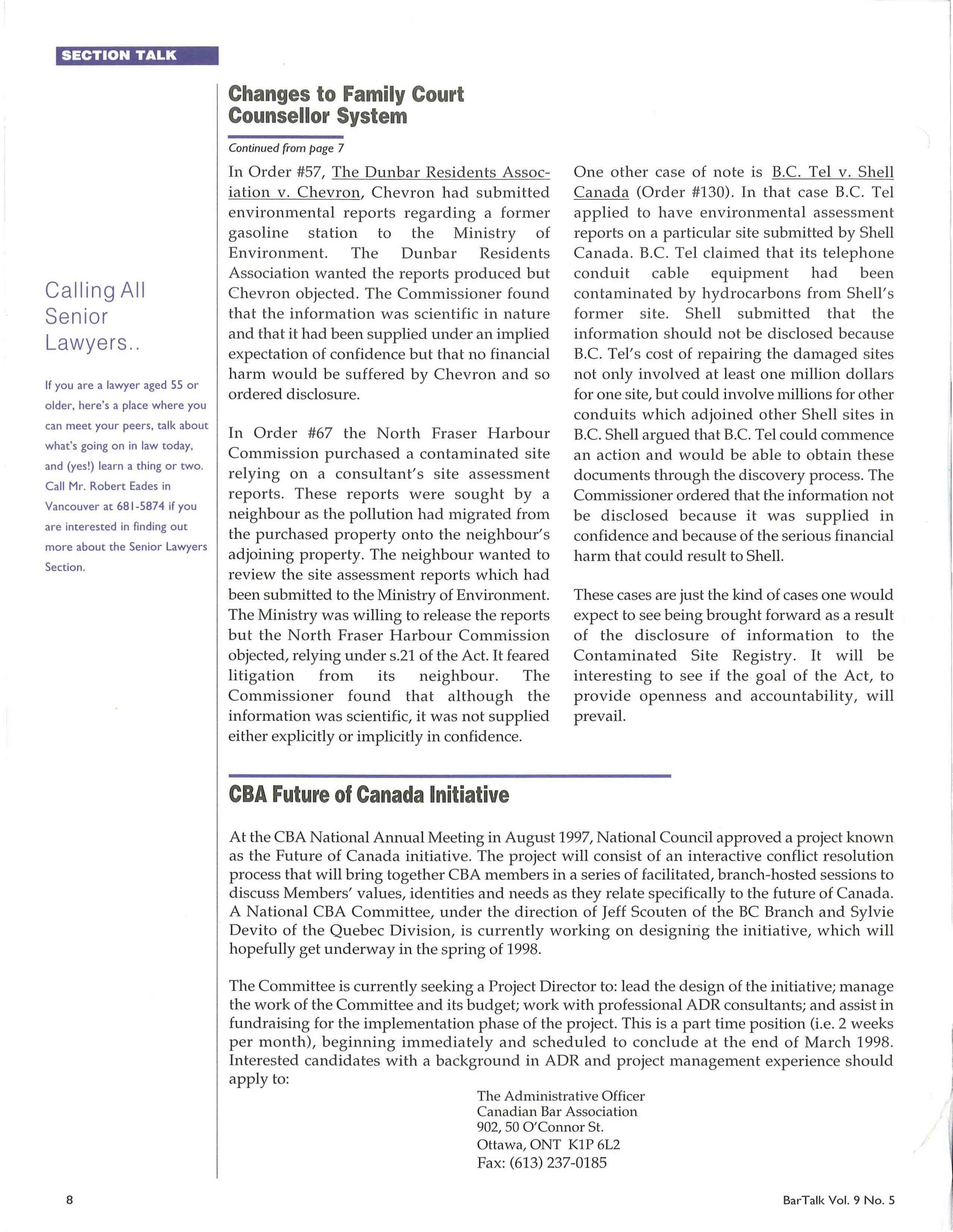 There will always be those who participate in an organization, and those who do not. There will always be some who recognize benefit to membership, even if they do not actively participate themselves, and others who do not recognize any benefit. Our challenge to you, is to get involved. Find out what benefits of membership exi s t, and see what there i s within the CBA for you . Some members' involvement is limited to Section meetings and mailings, but this in itself they consider wor th the whole of the membership fee . Some members read the Legislative Update in BarTalk religiously, and think this is the best benefit of membership . Others like seeing other parts of Canada by taking their families and attending the national Annual Meetings held throughout the provinces each August. There are many ways to enjoy and gain from CBA participation .