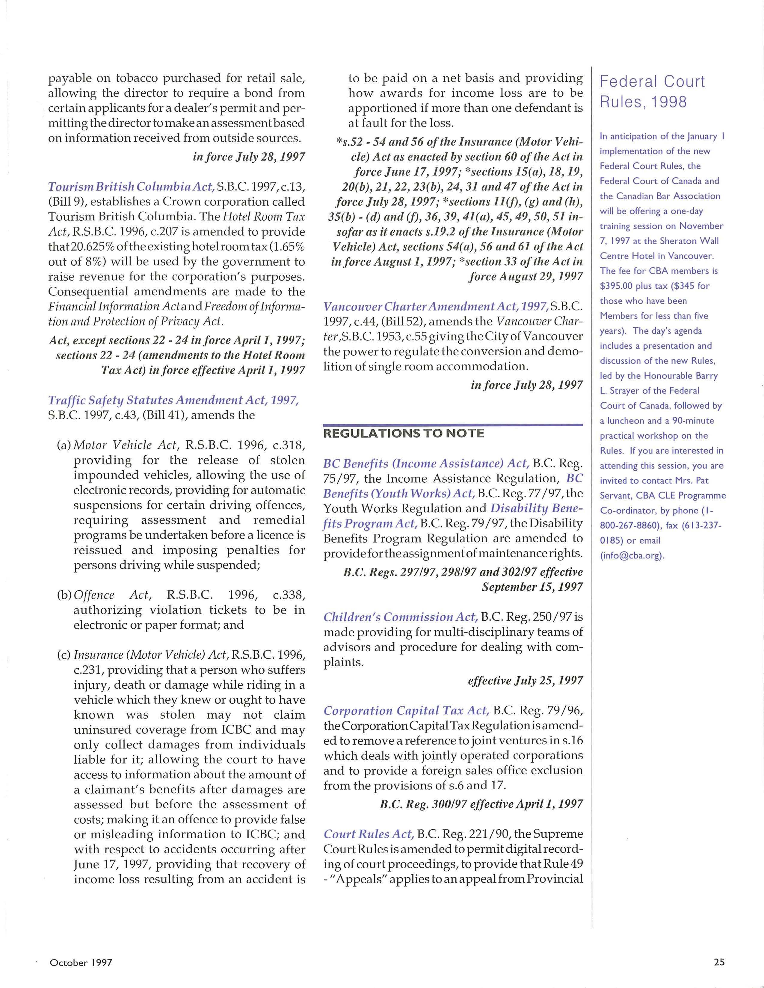 In ant icipation of the January I implementation of the new Federal Court Rules, the Federal Court of Canada and the Canadian Bar Associat ion will be offering a one-day training session on November 7, 1997 at the Sheraton Wall Centre Hotel in Vancouver. The fee for CBA members is $395.00 plus tax ($345 for those who have been Members for less than five years). The day ' s agenda includes a presentation and discussion of the new Rules, led by the Honourable Barry L. Strayer of the Federal Court of Canada, followed by a luncheon and a 90-minute practical workshop on the Rules. If you are interested in attending this session, you are invited to contact Mrs. Pat Servant, CBA CLE Programme Co-ordinator, by phone ( 1800-267-8860), fax (613-2370 185) or email (info@cba org).