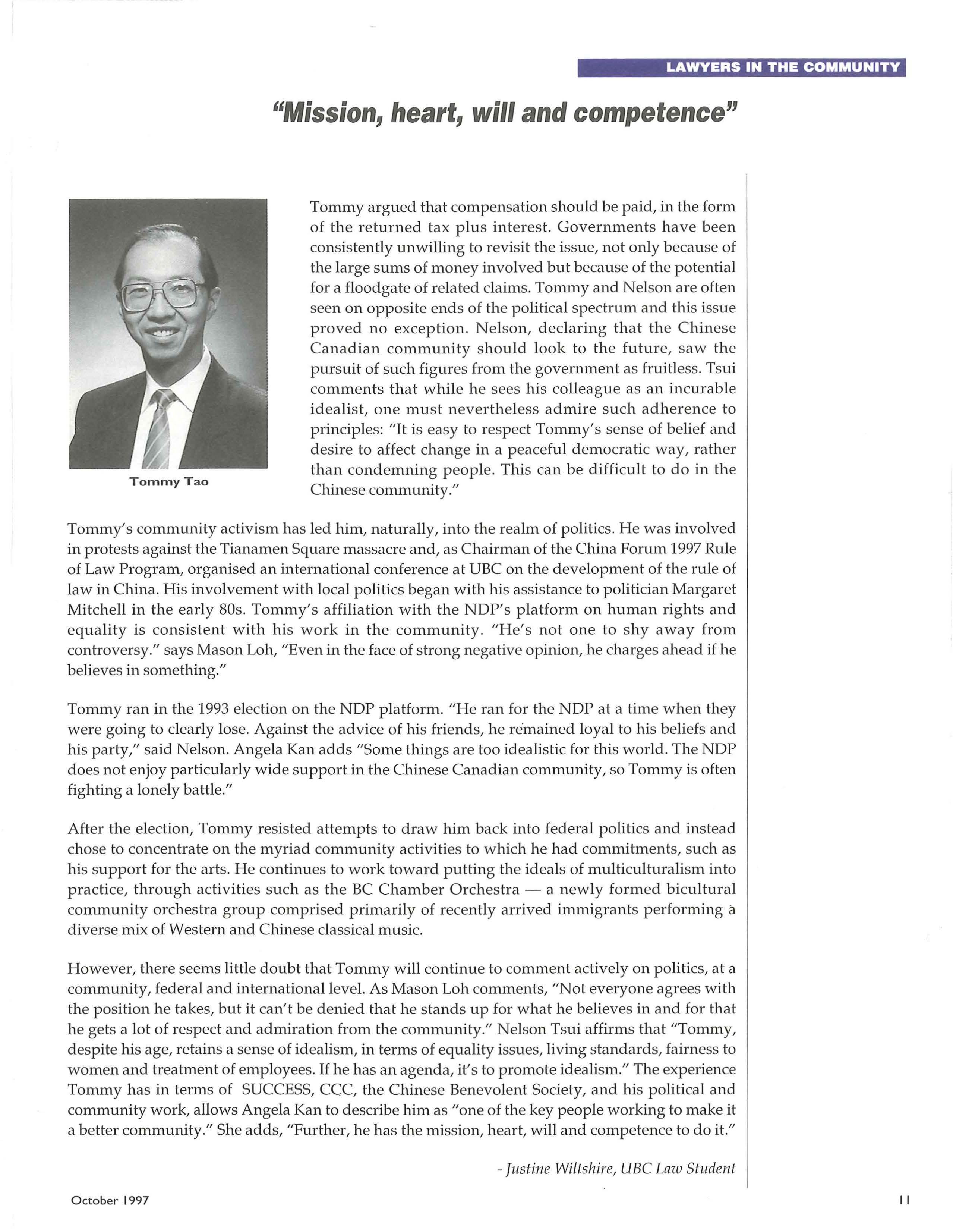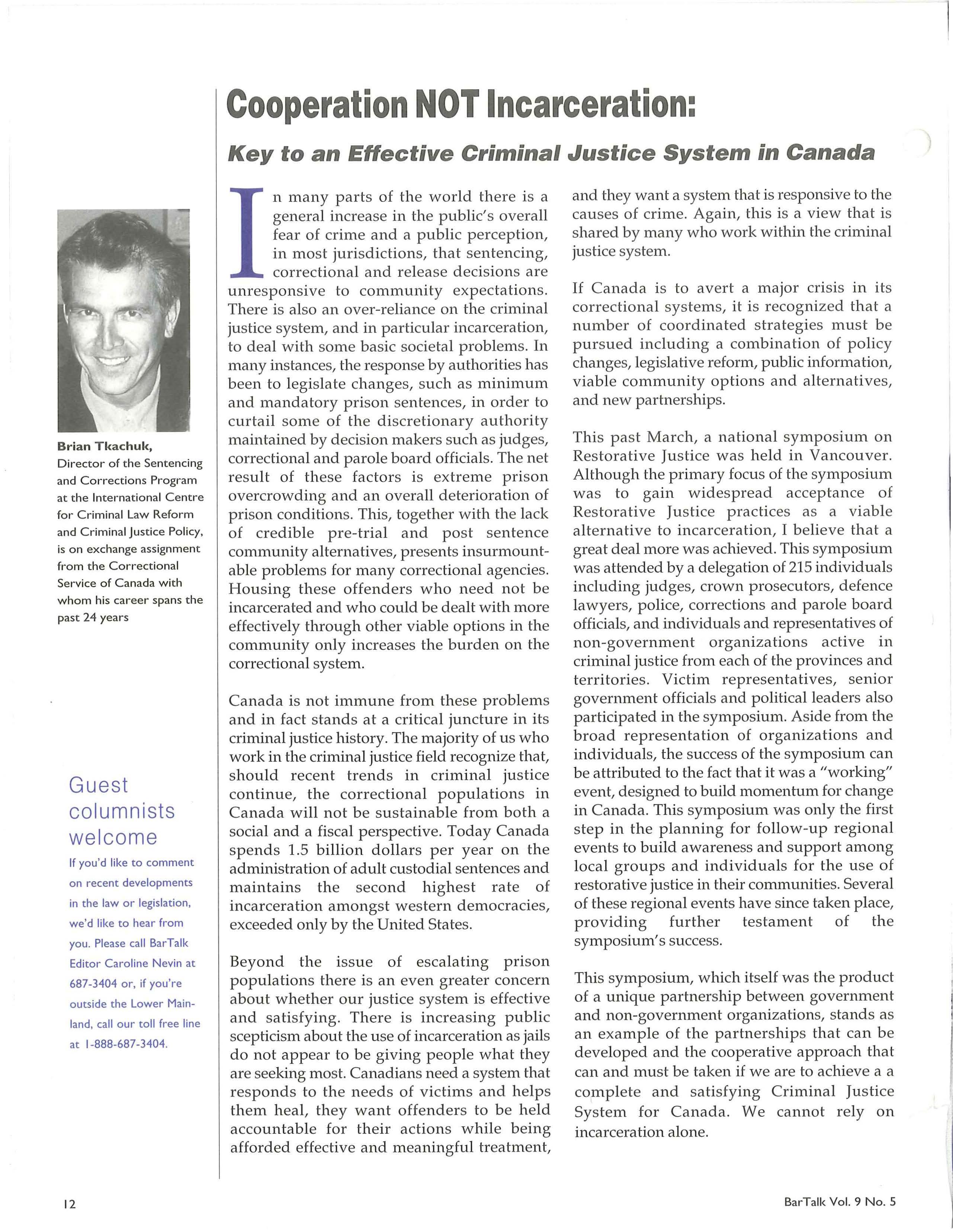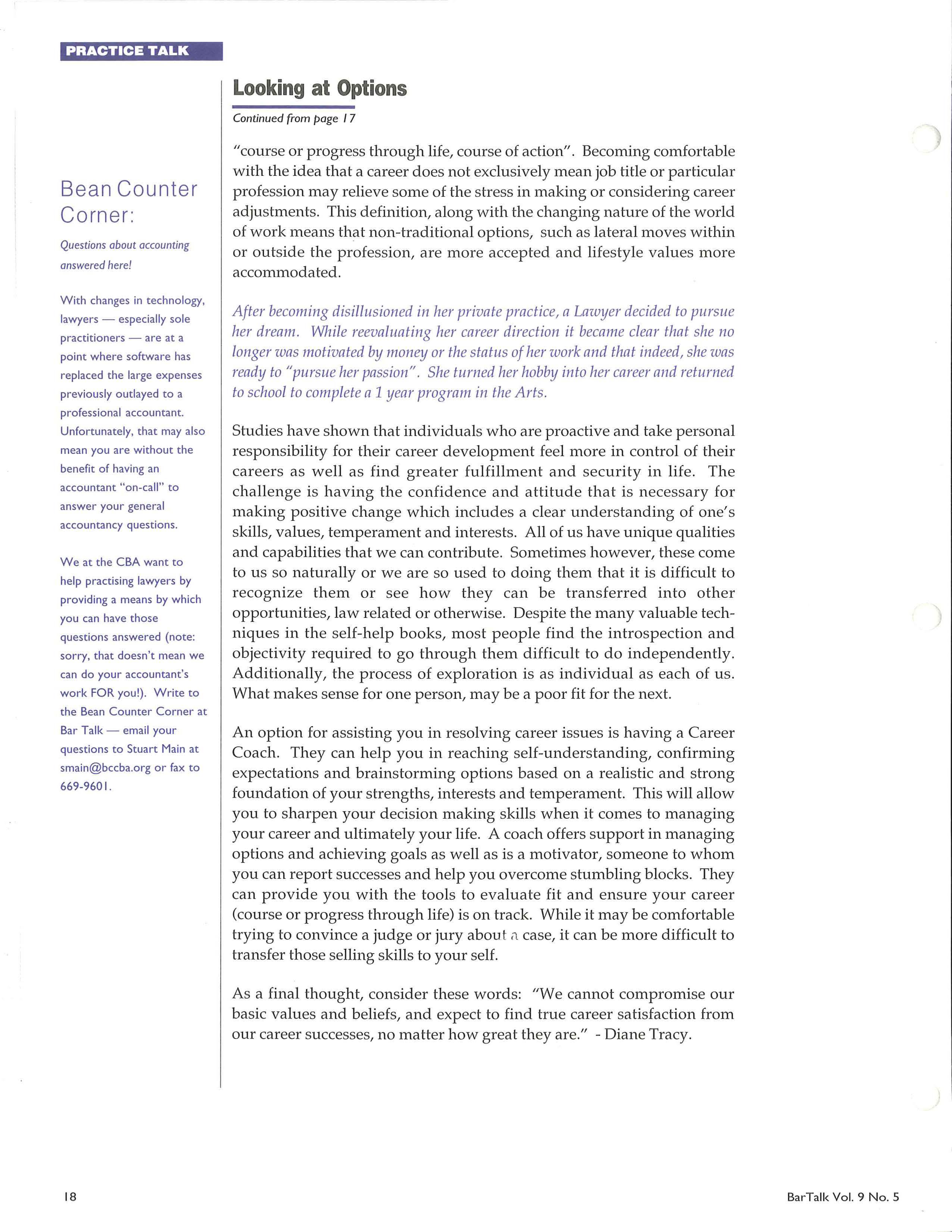 he Branch Executive is looking forward to a challenging year ahead. As legal professional s, we are in times of change and tran sition . We are facing unpr ecedented assault s on our historical ways of practice : intrusions in our traditional areas; increasing demands of clients who want all work done "fas ter , cheaper, b e tter" ; declining prestige in the profession generally; and growing numbers of us competing for market s hare . Added to this mix are government policies on auto insurance , legal aid funding, courthouse clo s ure s, the P.S.T., etc. All of which ensure that we in the community of lawyer s are kept busy ju s t keeping our heads above the water. This, before we even ge t started talking about the d e mands of family, mortgage payments, and the desire to contribute to our communities.