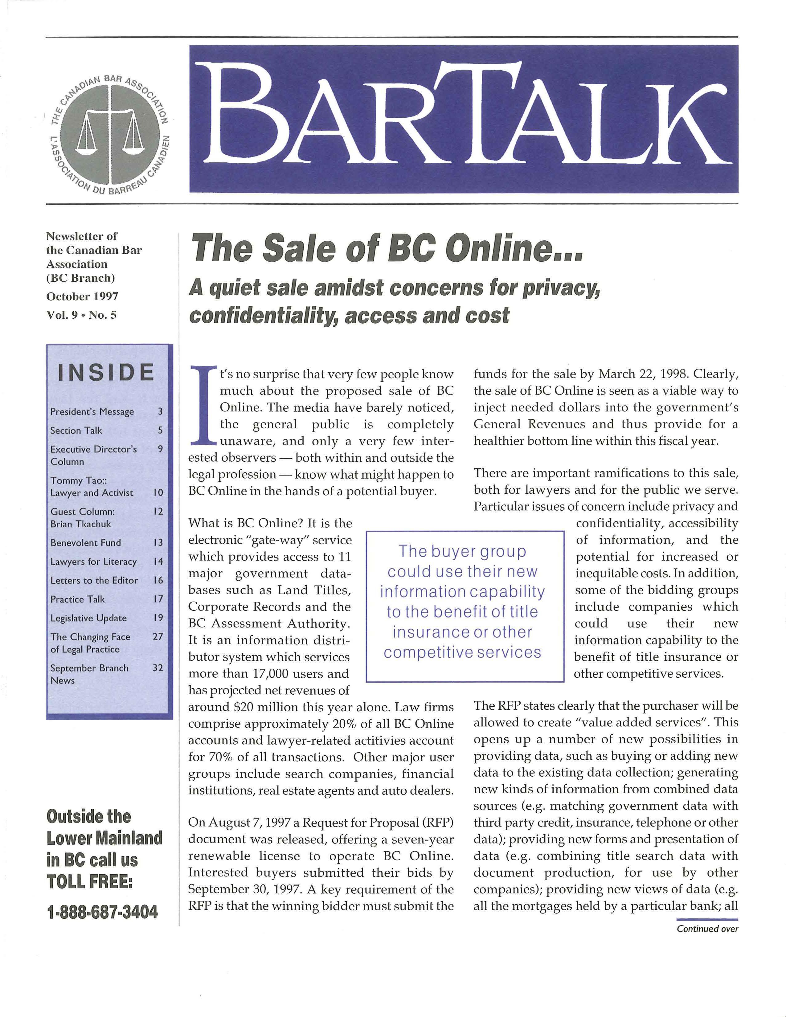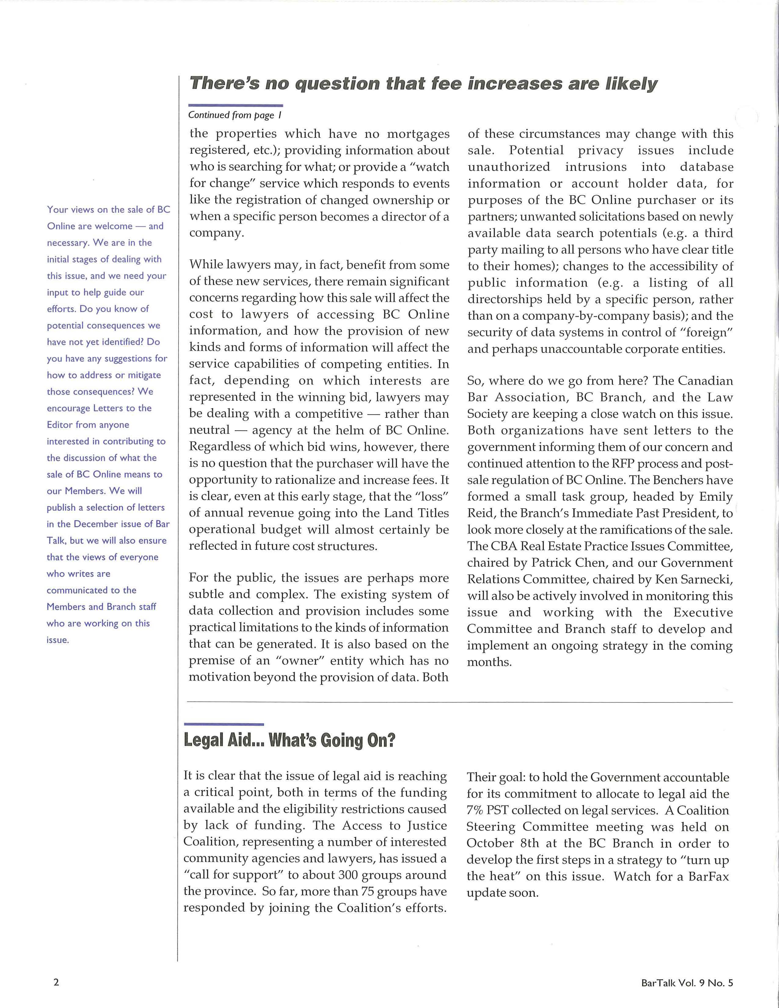 Your views on the sale of BC Online are welcome- and necessary. We are in the initial stages of dealing with this issue, and we need your input to help guide our efforts Do you know of potential consequences we have not yet identified? Do you have any suggestions for how to address or mitigate those consequences? We encourage Letters to the Editor from anyone interested in contributing to the discuss ion of what the sale of BC Online means to our Members. We will publish a selection of letters in the December issue of Bar Ta lk, but we will a lso ensure that the views of everyone who writes are communicated to the Members and Branch staff who are working on this issue.