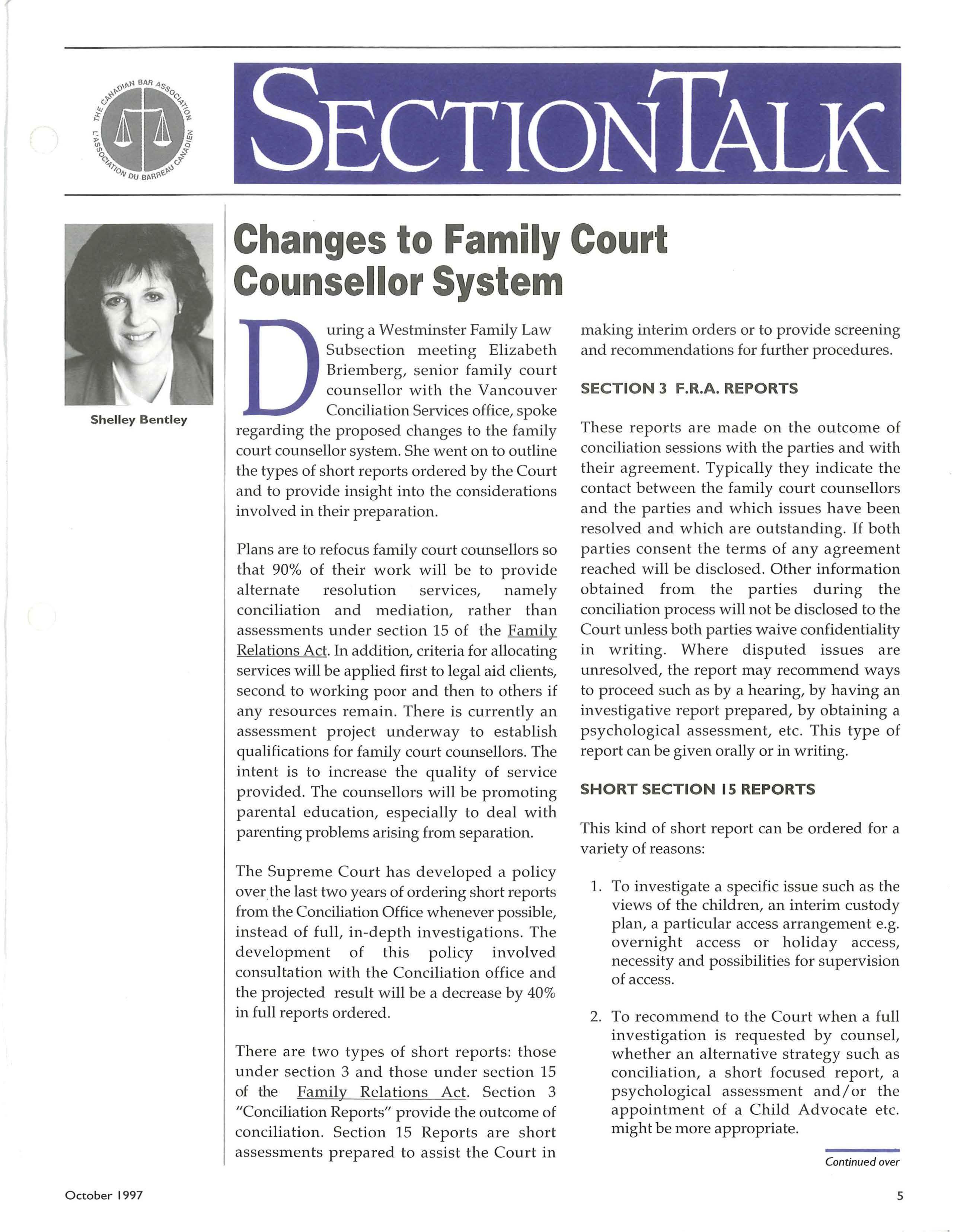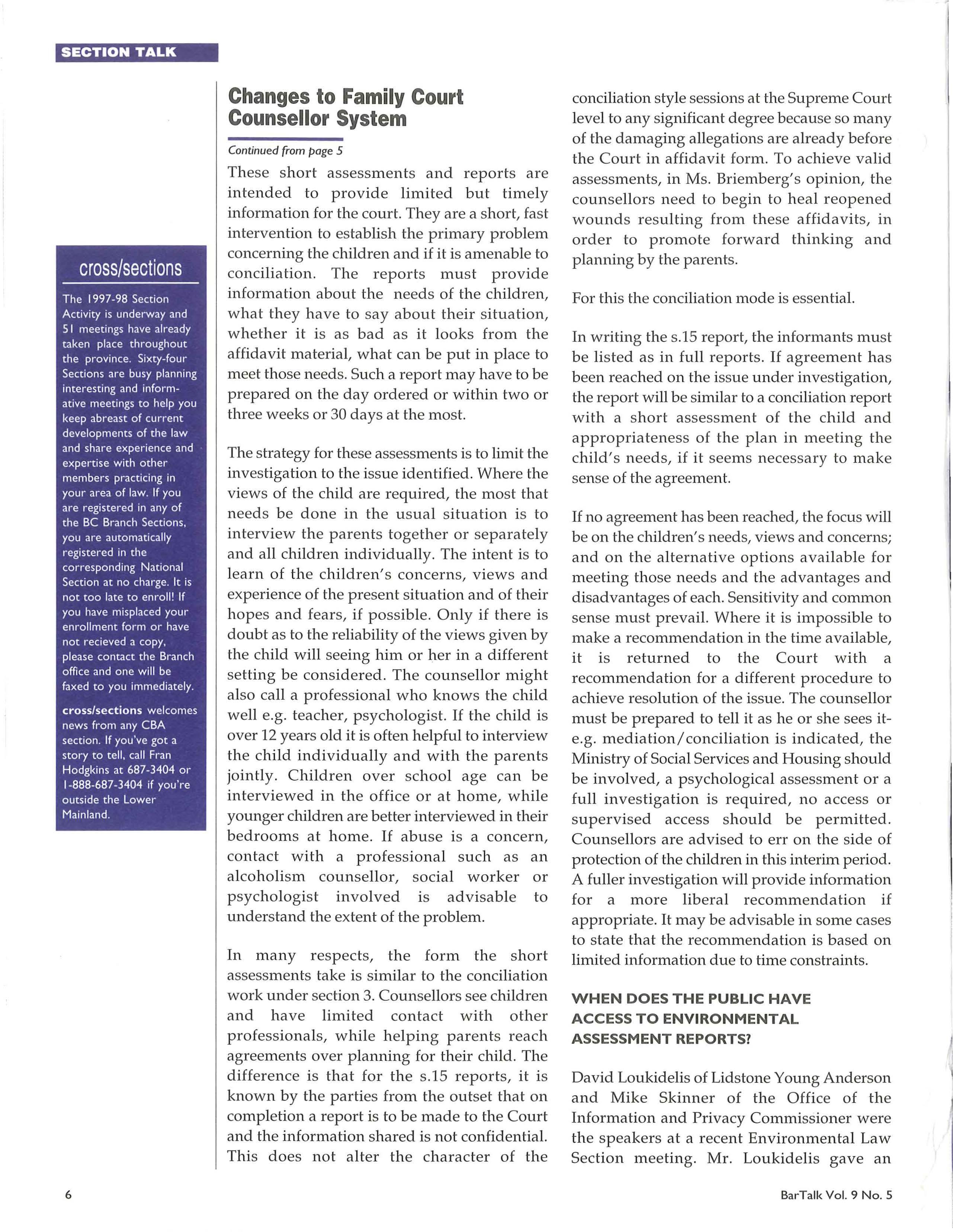 Think about what we can learn from each other. The iss ues facing a family lawyer in the Kootenays vary little from those facing a family lawyer in New Westminster. Criminal Law is practised pretty much the same in Fort St. John as in Vernon or Prince Rupert, leaving aside availability of court dates and judges. We now have 64 active sections, each one a place to network with colleagues of similar interest s , to learn and discuss new and proposed legi s lation, important recent cases, the view from the Bench, and related s upport services.