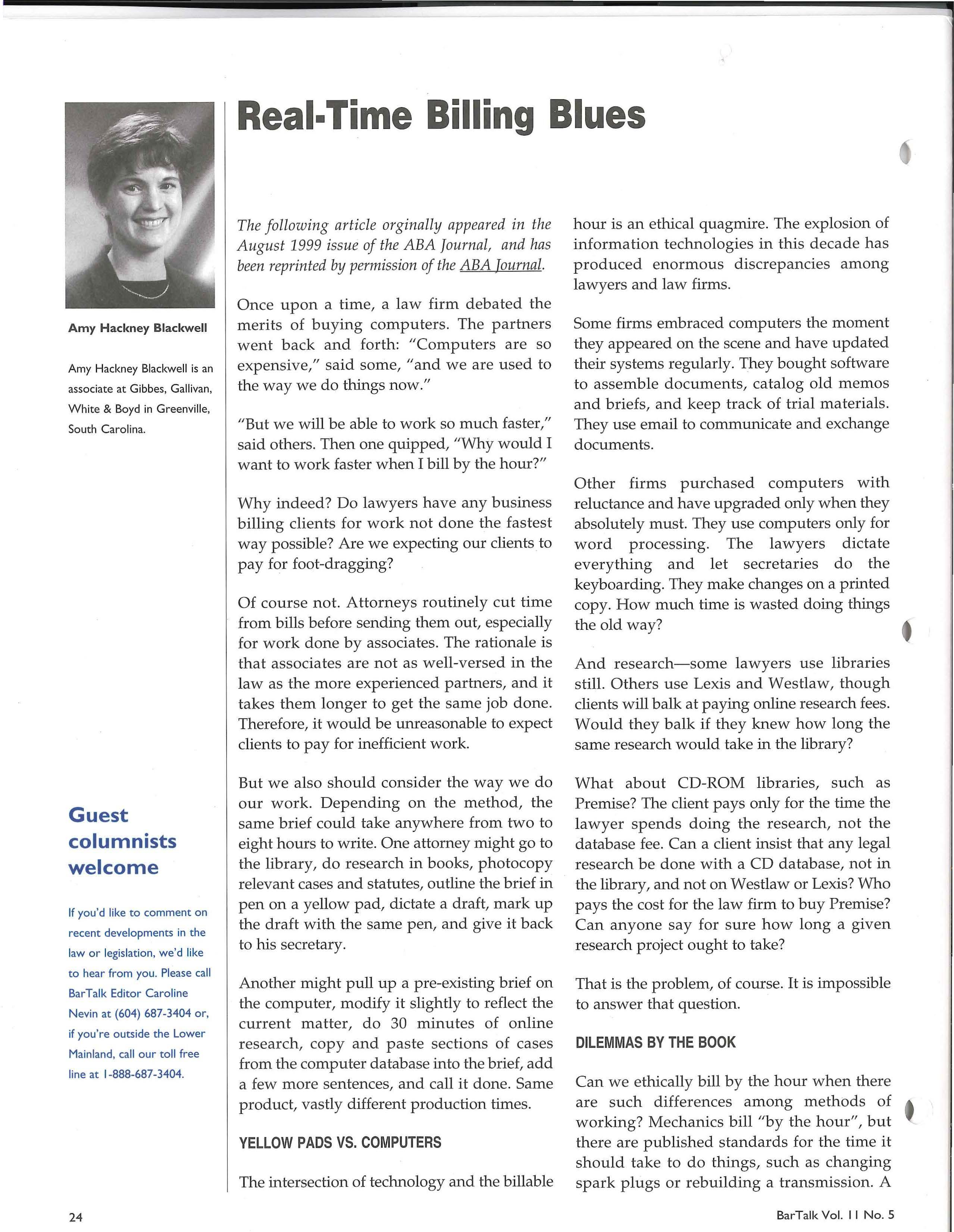 Two options present themselves: Either law firms must commit themselves to maintaining the technological ability to do all work in the most efficient way possible, or attorneys should find a more uniform way of billing for services rendered. To do otherwise is unethical and unbecoming an ancient and honourable profession.