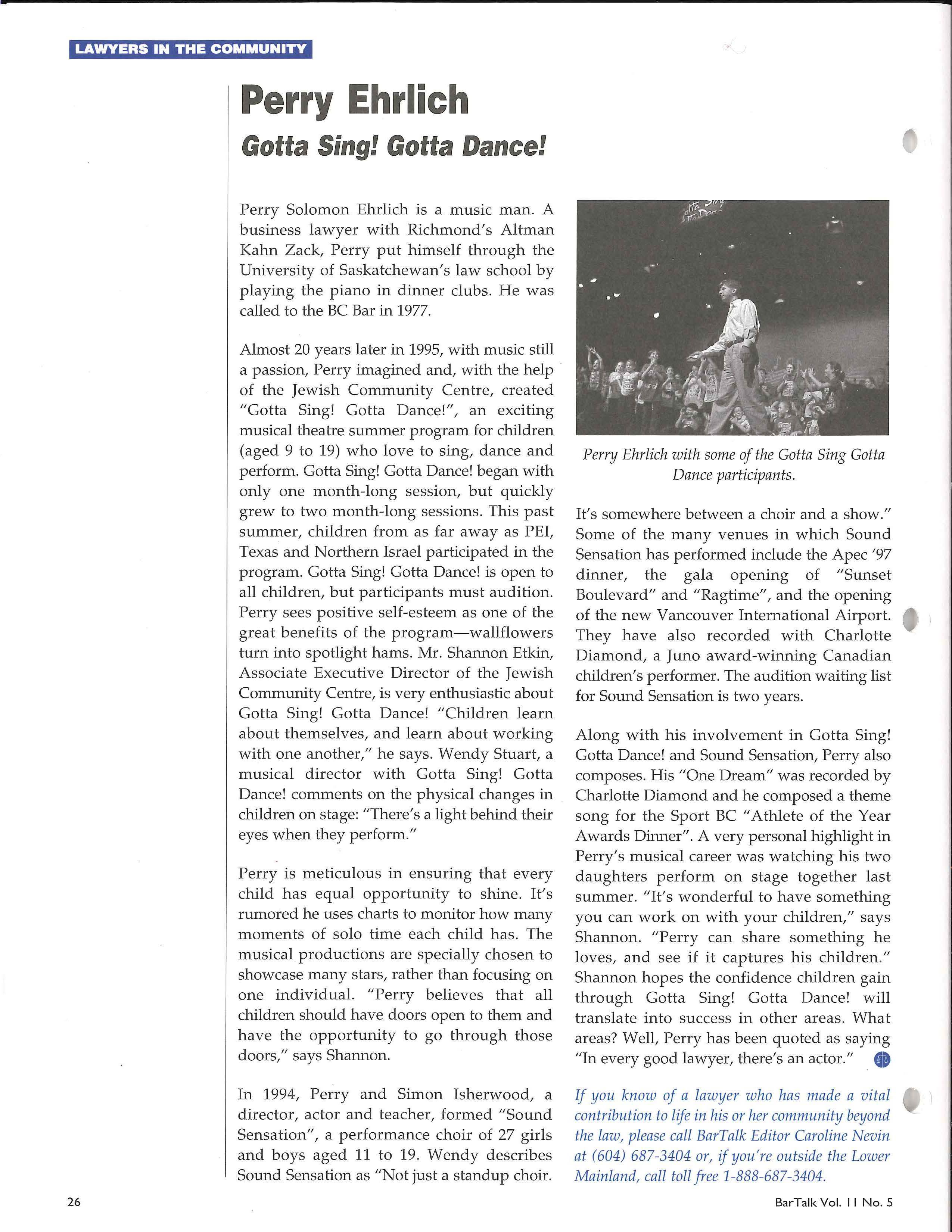 Along with his involvement in Cotta Sing! Cotta Dance! and Sound Sensation, Perry also composes His "One Dream" was recorded by Charlotte Diamond and he composed a theme song for the Sport BC "Athlete of the Year Awards Dinner" A very personal highlight in Perry's musical career was watching his two daughters perform on stage together last summer. "It's wonderful to have something you can work on with your children," says Shannon. "Perry can share something he loves, and see if it captures his children ." Shannon hopes the confidence children gain through Cotta Sing! Cotta Dance! will translate into success in other areas What areas? Well, Perry has been quoted as saying "In every good lawyer, there's an actor." GD