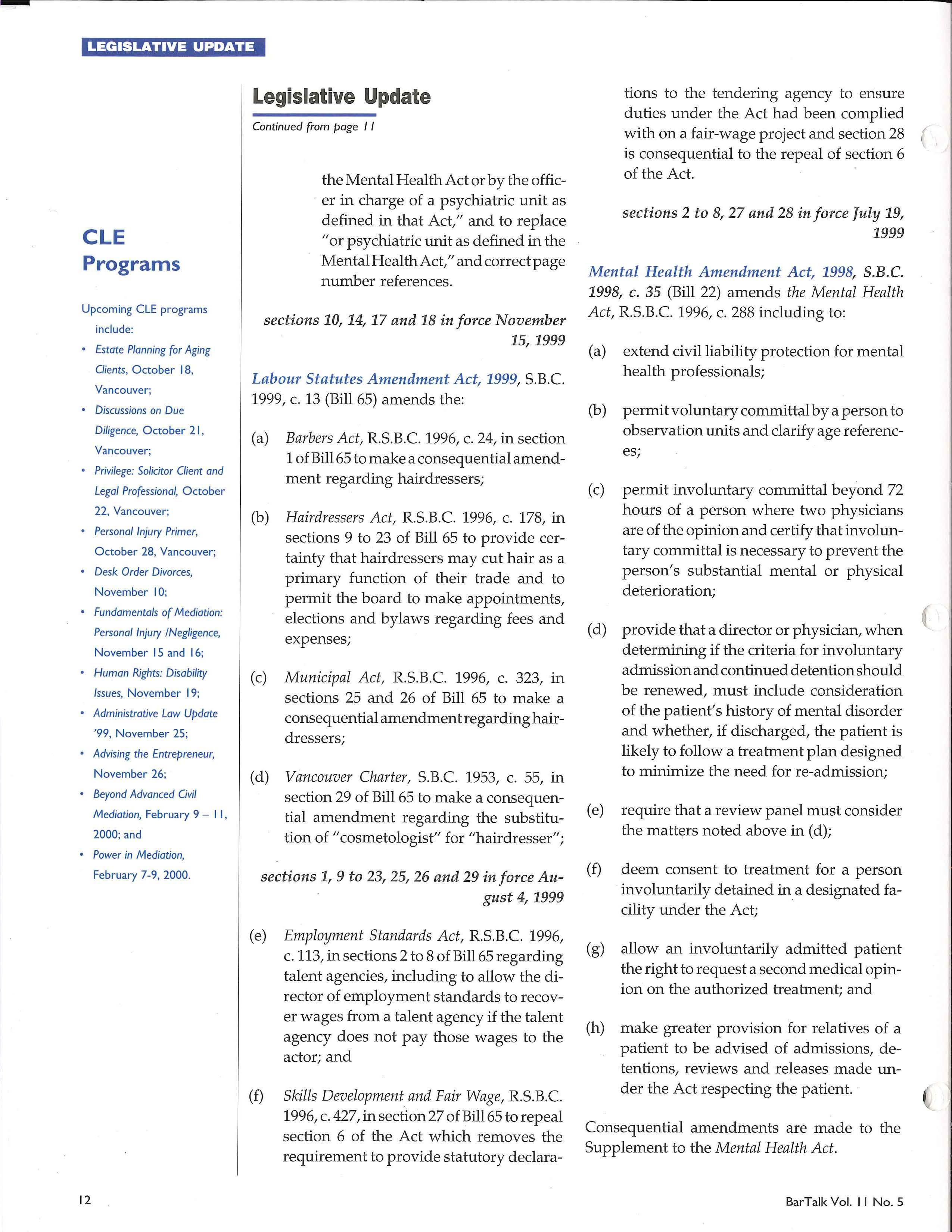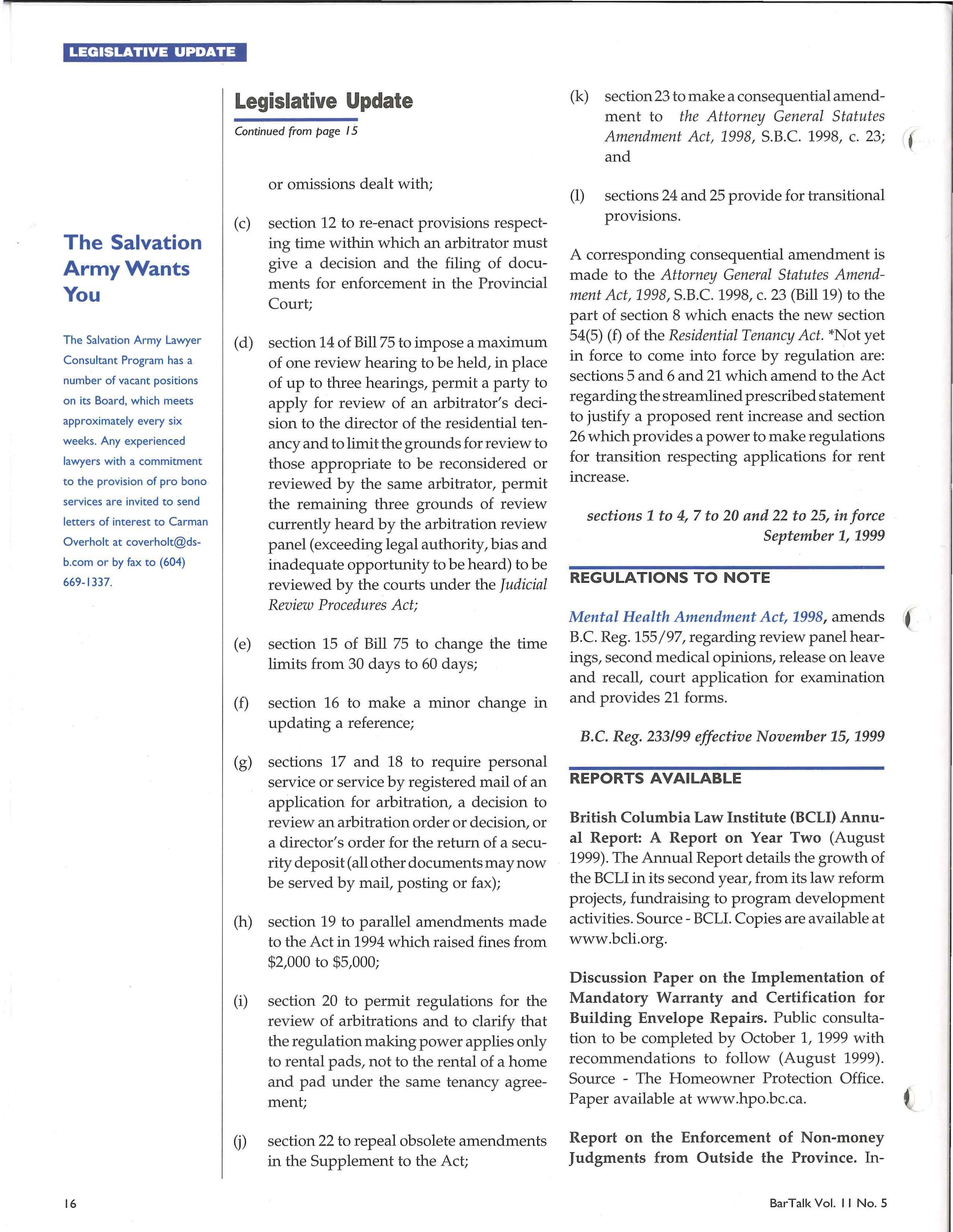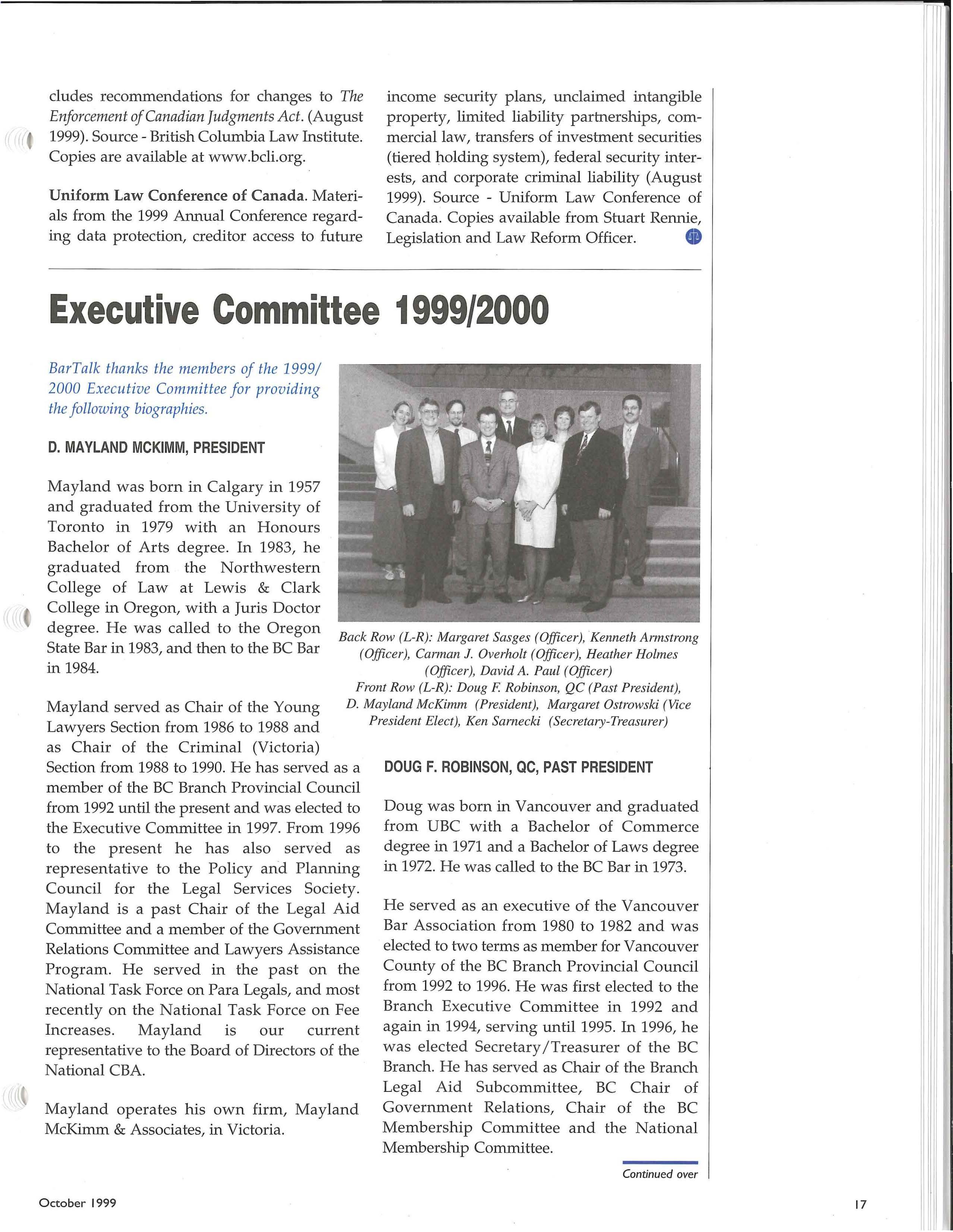 In response to many requests from members who want an inexpensive way to reach other lawyers in BC, the BC Branch is proud to introduce BarTallc Classified Advertising. The back cover of BarTallc will be available on a first priority basis to our members. Any remaining space will be made available to other advertisers at a premium rate, to offset BarTallc production costs for members. For more information on display or classified ads please contact: Patti Graham (604) 687-3404 or 1-888-687-3404.