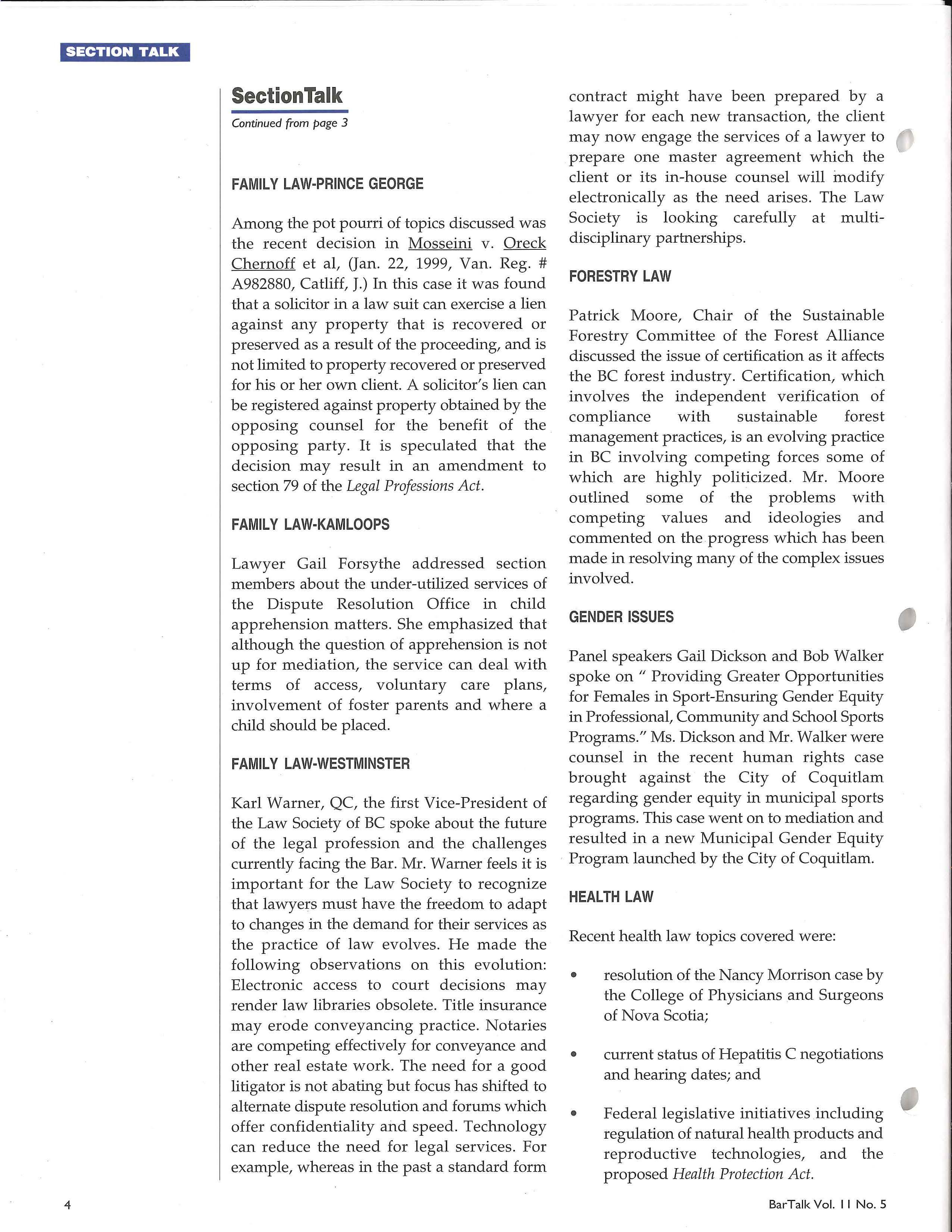 Among the pot pourri of topics discussed was the recent decision in Mosseini v. Oreck Chernoff et al, (Jan. 22, 1999, Van. Reg. # A982880, Catliff, J.) In this case it was found that a solicitor in a law suit can exercise a lien against any property that is recovered or preserved as a result of the proceeding, and is not limited to property recovered or preserved for his or her own client. A solicitor's lien can be registered against property obtained by the opposing counsel for the benefit of the opposing party. It is speculated that the decision may result in an amendment to section 79 of the Legal Professions Act.