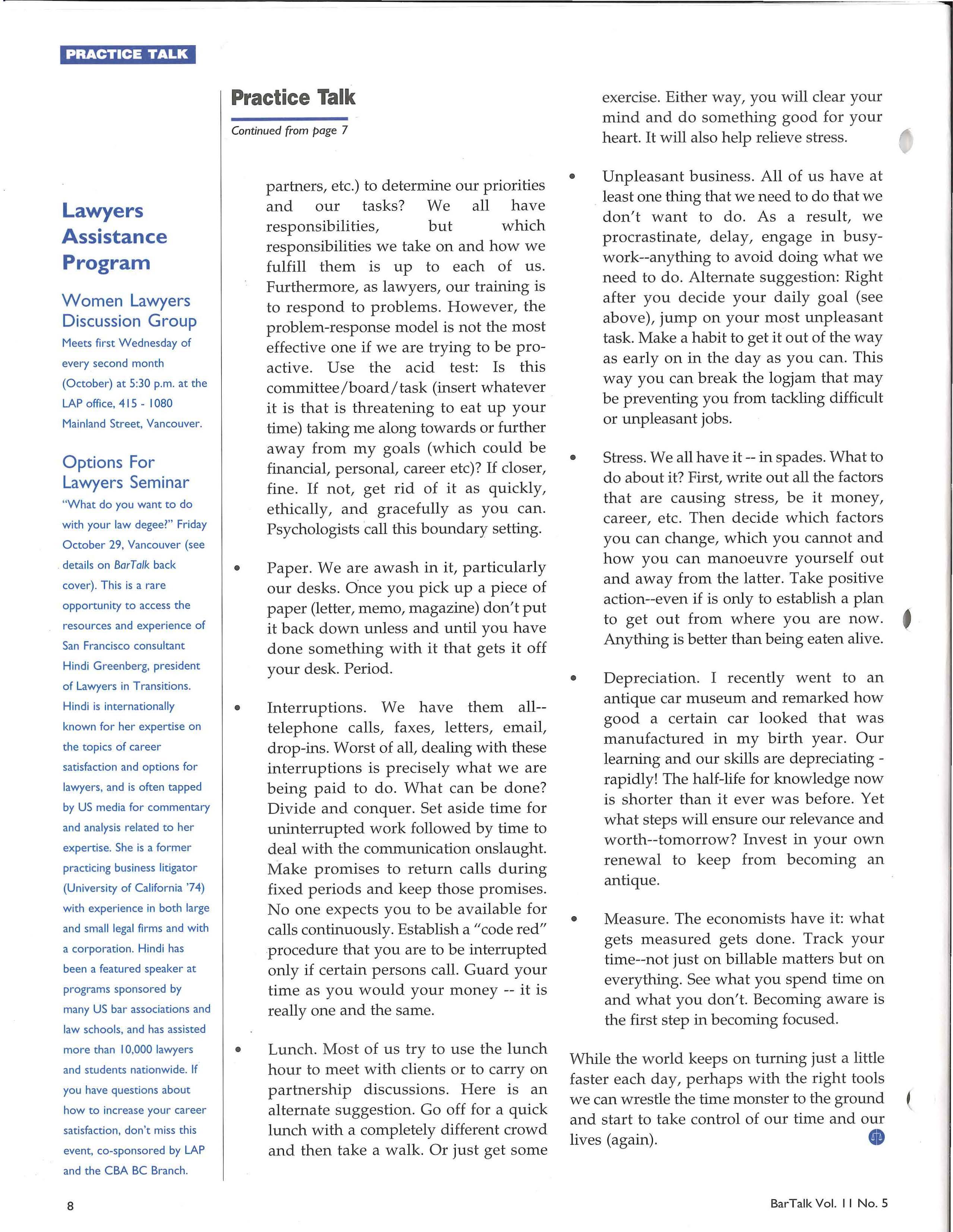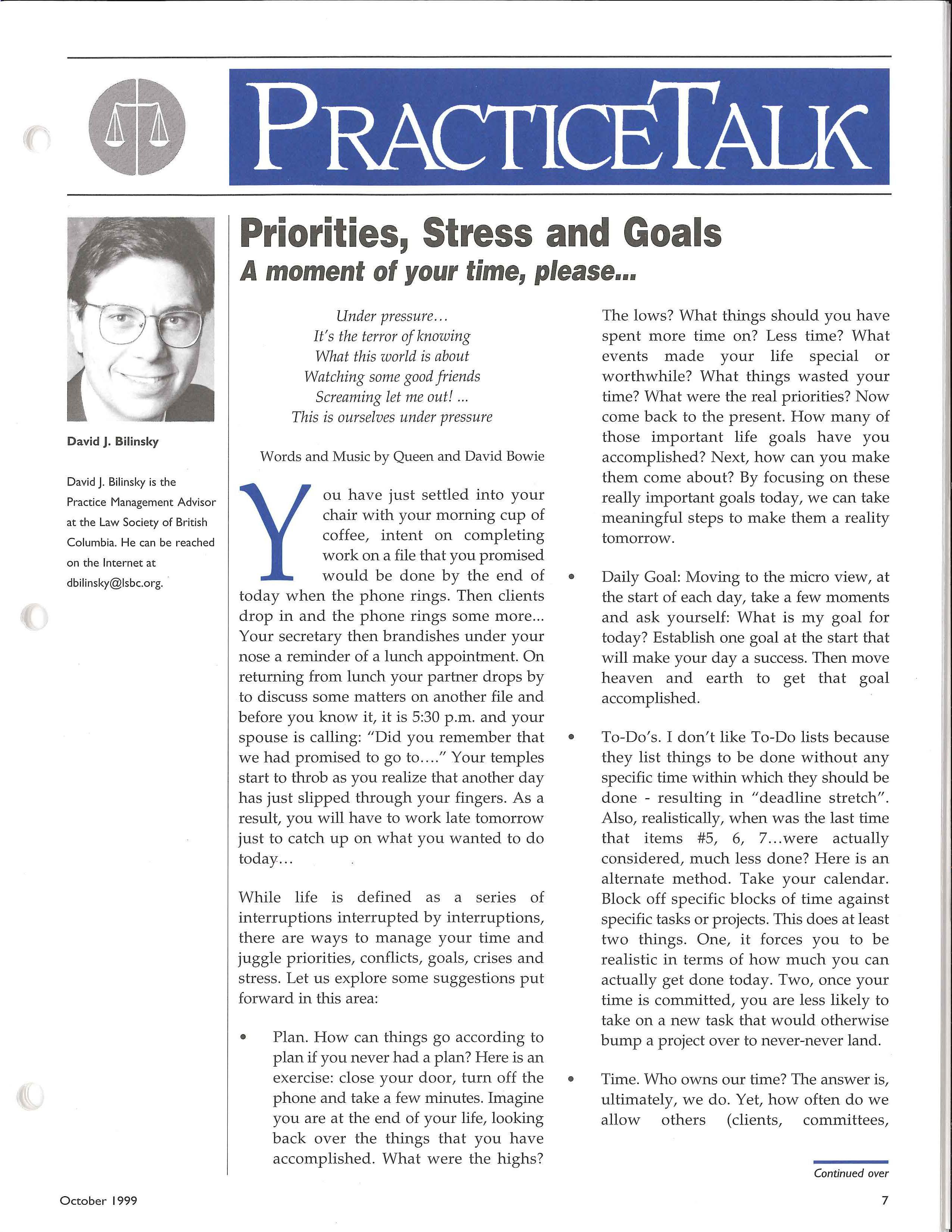 David J. Bilinsky is the Practice Management Advisor at the Law Society of British Columbia. He can be reached on the Internet at dbilinsky@lsbc.org.