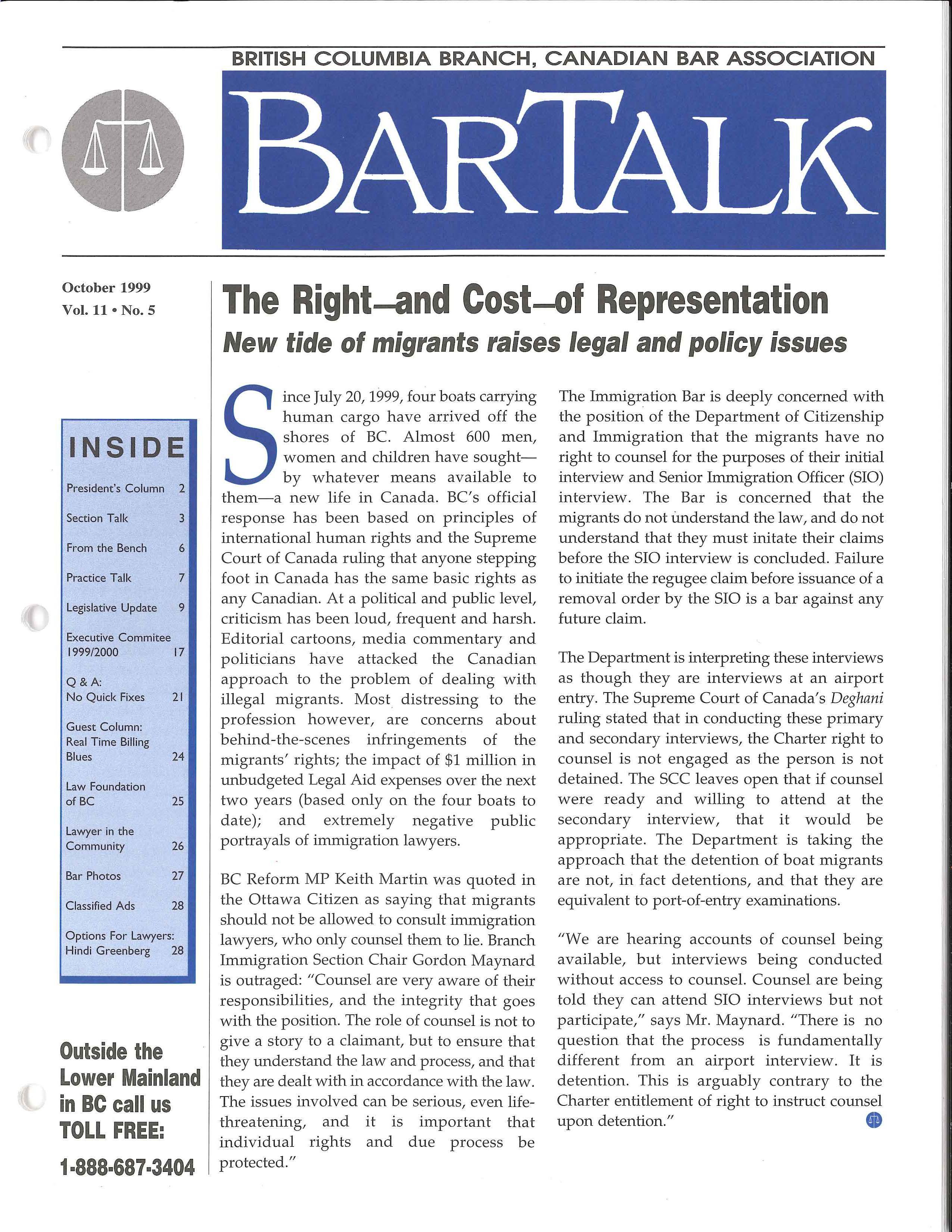 ince July 20, 1999, four boats carrying human cargo have arrived off the shores of BC. Almost 600 men, women and children have soughtby whatever means available to them-a new life in Canada BC' s official response has been based on principles of international human rights and the Supreme Court of Canada ruling that anyone stepping foot in Canada has the same basic rights as any Canadian At a political and public level, criticism has been loud, frequent and harsh. Editorial cartoons, media commentary and politicians ha v e attacked the Canadian approach to the problem of dealing with illegal migrants Most distressing to the profession however, are concerns abou t behind - the-scenes infringements of the migrants' rights; the impact of $1 million in unbudgeted Legal Aid expenses over the next two years (based only on the four boats to date); and extremely negative public portrayals of immigration lawyers.