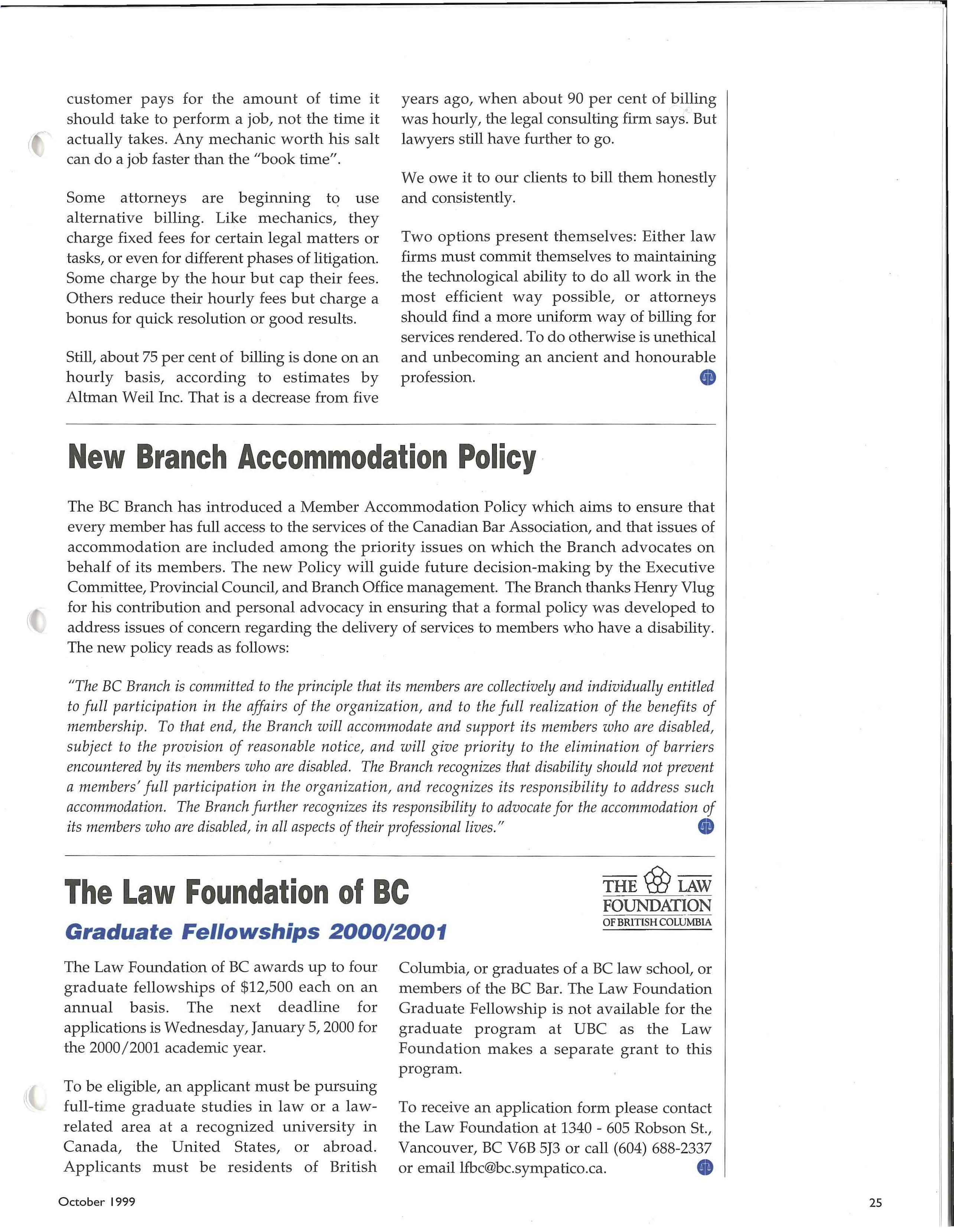 The Law Foundation of BC awards up to four graduate fellowships of $12,500 each on an annual basis. The next deadline for applications is Wednesday, January 5, 2000 for the 2000/2001 academic year.