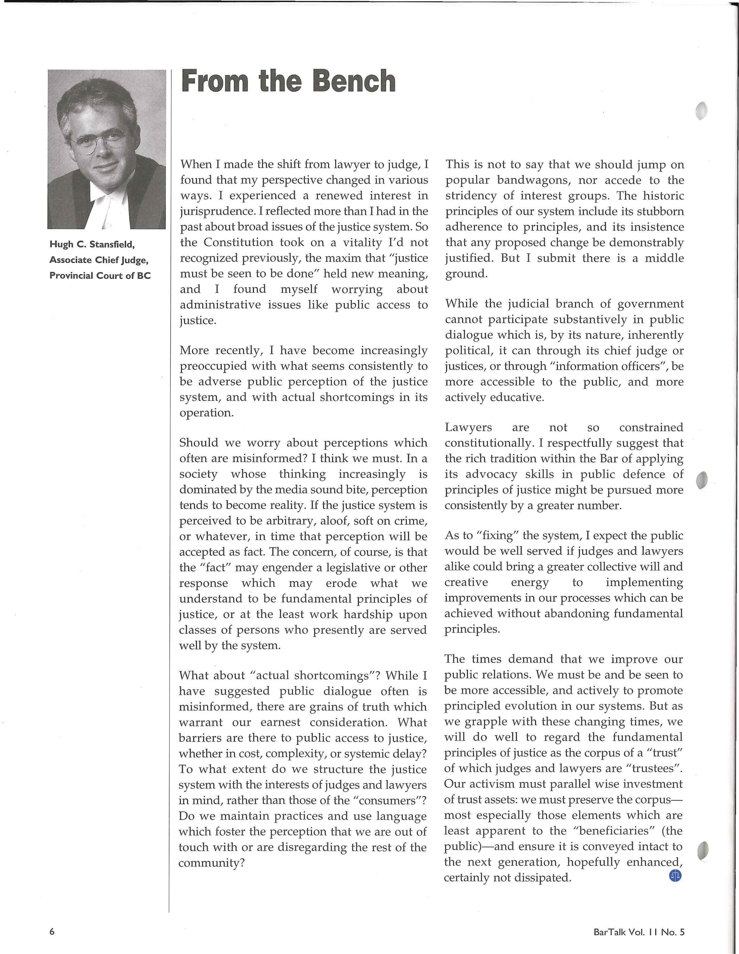 Hugh C. Stansfield, Associate Chief Judge, Provincial Court of BC