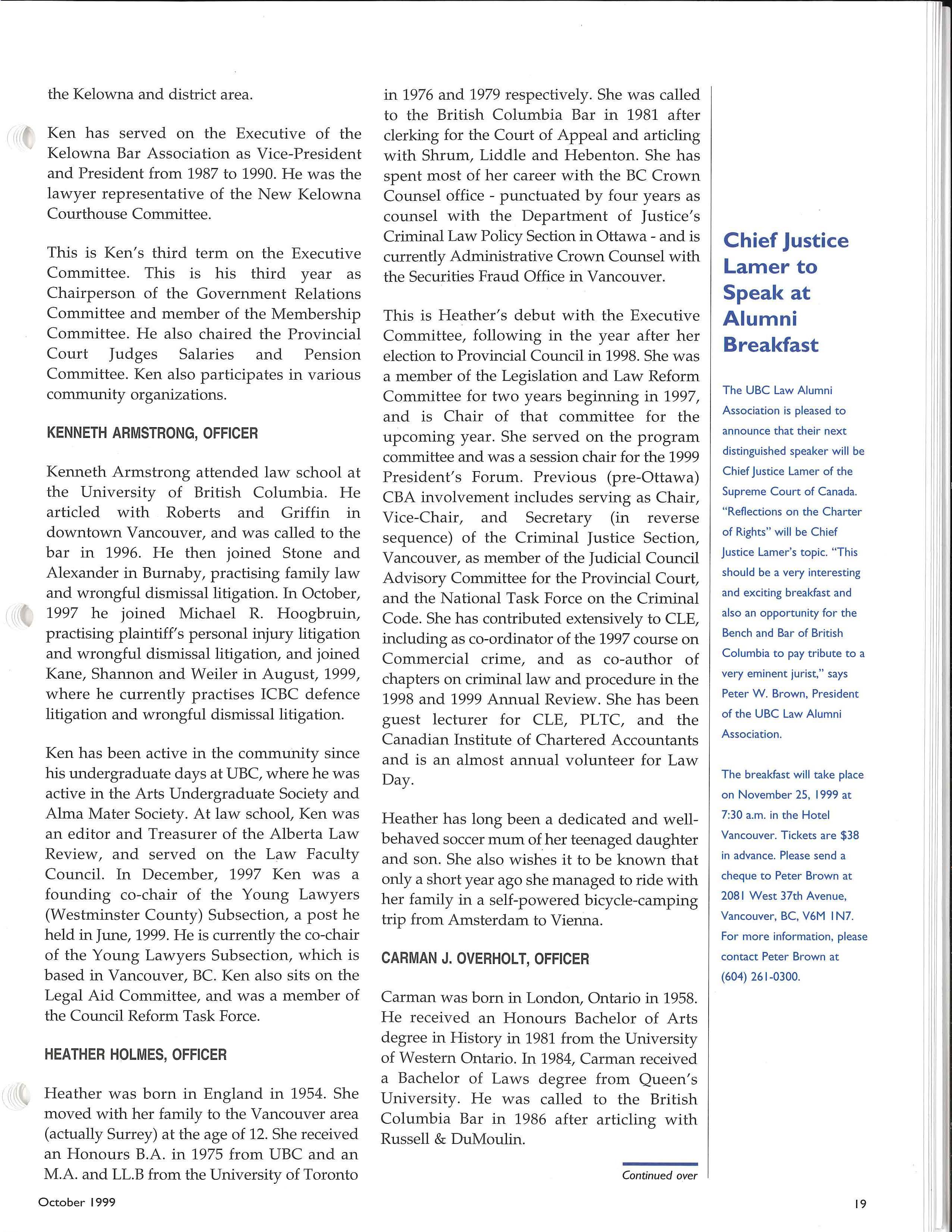 The Law Courts Education Society of BC will host an event celebrating their IOth ann iversary and 20 years of law courts education in BC on Tuesday, October 19, 1999 The evening will feature specia l guest speaker The Honourable Mr Justice Frank Iacobucci and dinner at the Renaissance Hotel Harbourside. Tickets are $1 00 in advance. Contact the Society at (604) 660-9870