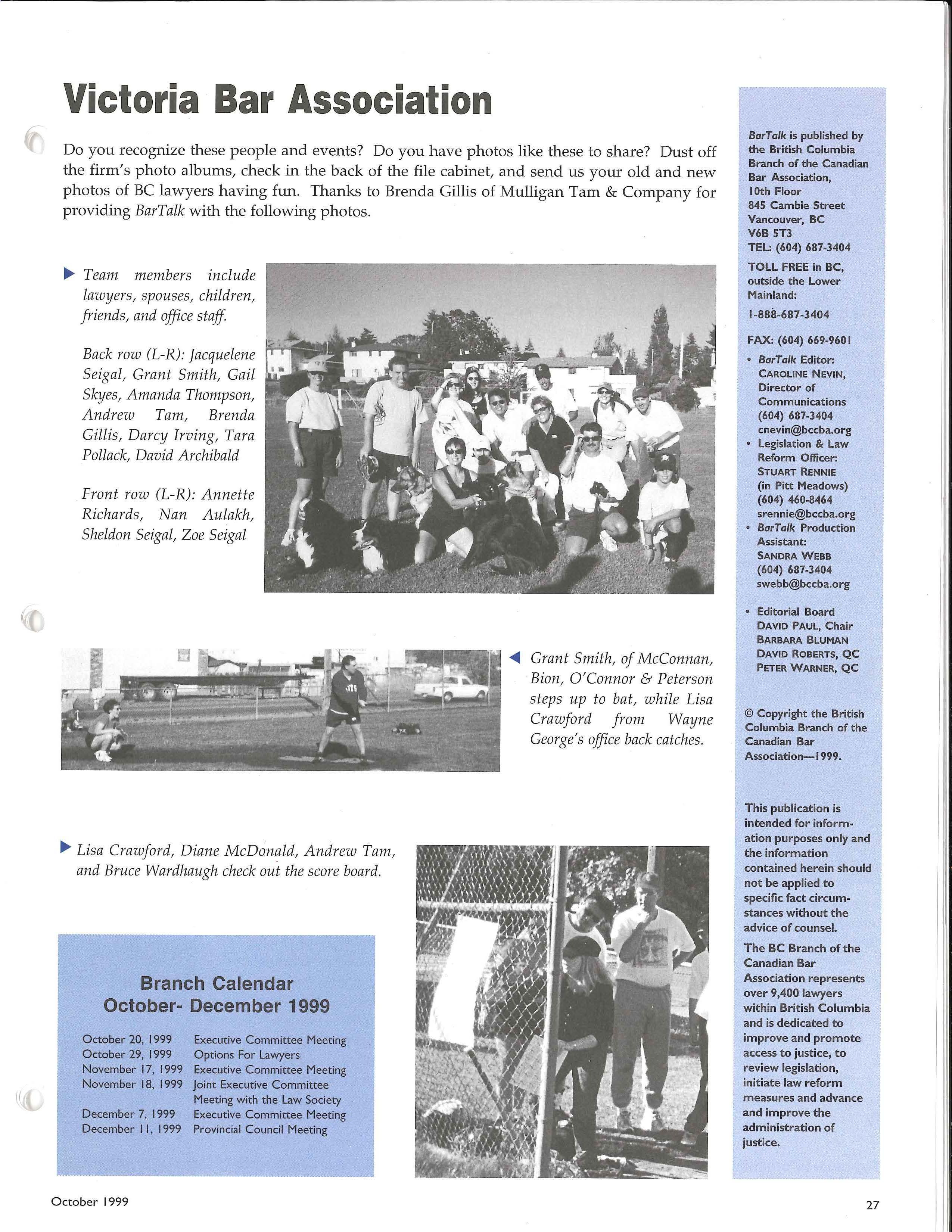 Do you recognize these people and ev ents? Do you h a v e photos like the se to sha r e? Dust o ff the firm's photo albums, check in the back o f the file cab inet, and send us your old and n ew photos of BC lawyers having fun. Thanks to Brenda Gillis of M ulli gan Tam & Company fo r providing BarTalk with the followin g photo s.