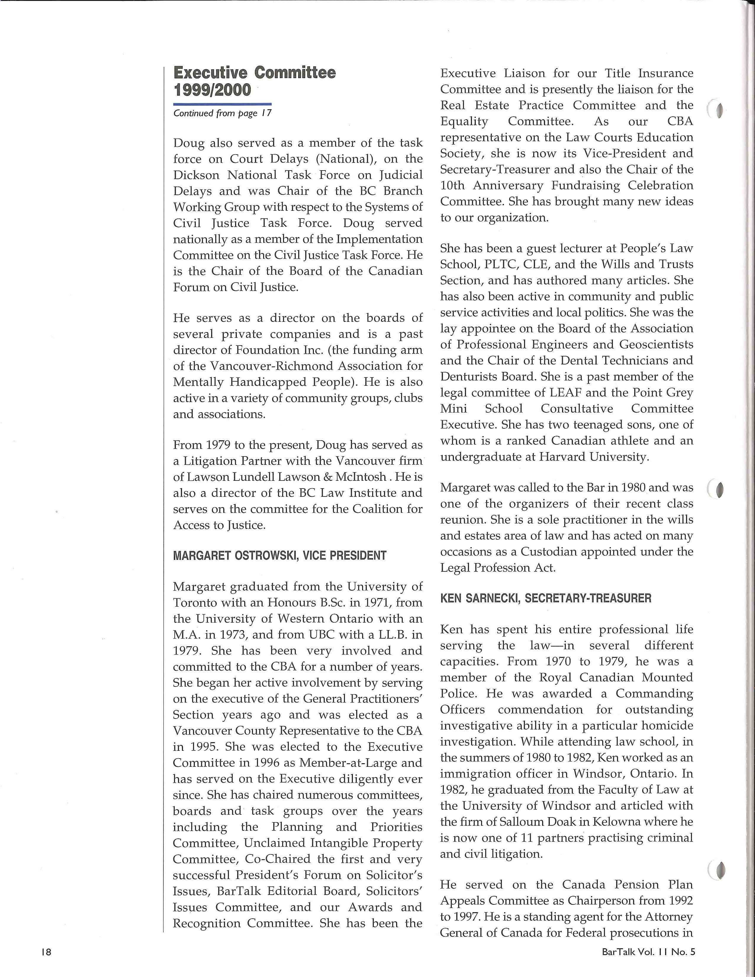 The CBA has a proud history of bringing to government the issues that affect our practices and the lives and business of clients. In 1998, our national association made submissions to the federal government on 55 pieces of federal legislation. Provincially we were called upon to make submissions either confidentially or publicly on 11 pieces of provincial legislation. The CBA has worked hard to develop a strong presence with government, and to ensure that our voice and issues are considered and addressed.