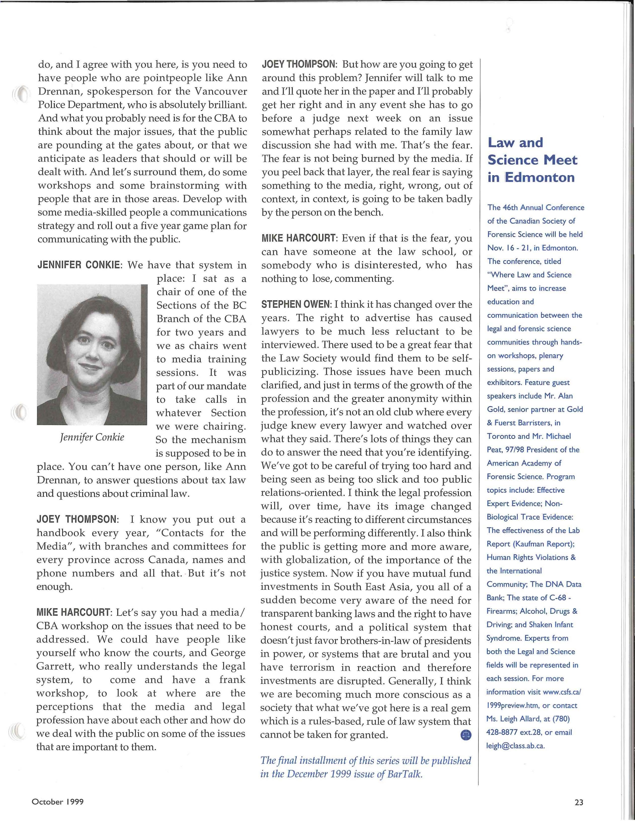 STEPHEN OWEN: I think it has changed over the years. The right to advertise has caused lawyers to be much less reluctant to be interviewed. There used to be a great fear that the Law Society would find them to be selfpublicizing. Those issues have been much clarified, and just in terms of the growth of the profession and the greater anonymity within the profession, it's not an old club where every judge knew every lawyer and watched over what they said. There's lots of things they can do to answer the need that you're identifying. We've got to be careful of trying too hard and being seen as being too slick and too public relations -oriented I think the legal profession will, over time, have its image changed because it's reacting to different circumstances and will be performing differently. I also think the public is getting more and more aware, with globalization, of the importance of the justice system. Now if you have mutual fund investments in South East Asia, you all of a sudden become very aware of the need for transparent banking laws and the right to have honest courts, and a political system that doesn't just favor brothers -in-law of presidents in power, or systems that are brutal and you have terrorism in reaction and therefore investments are disrupted. Generally, I think we are becoming much more conscious as a society that what we've got here is a real gem which is a rules-based, rule of law system that cannot be taken for granted.