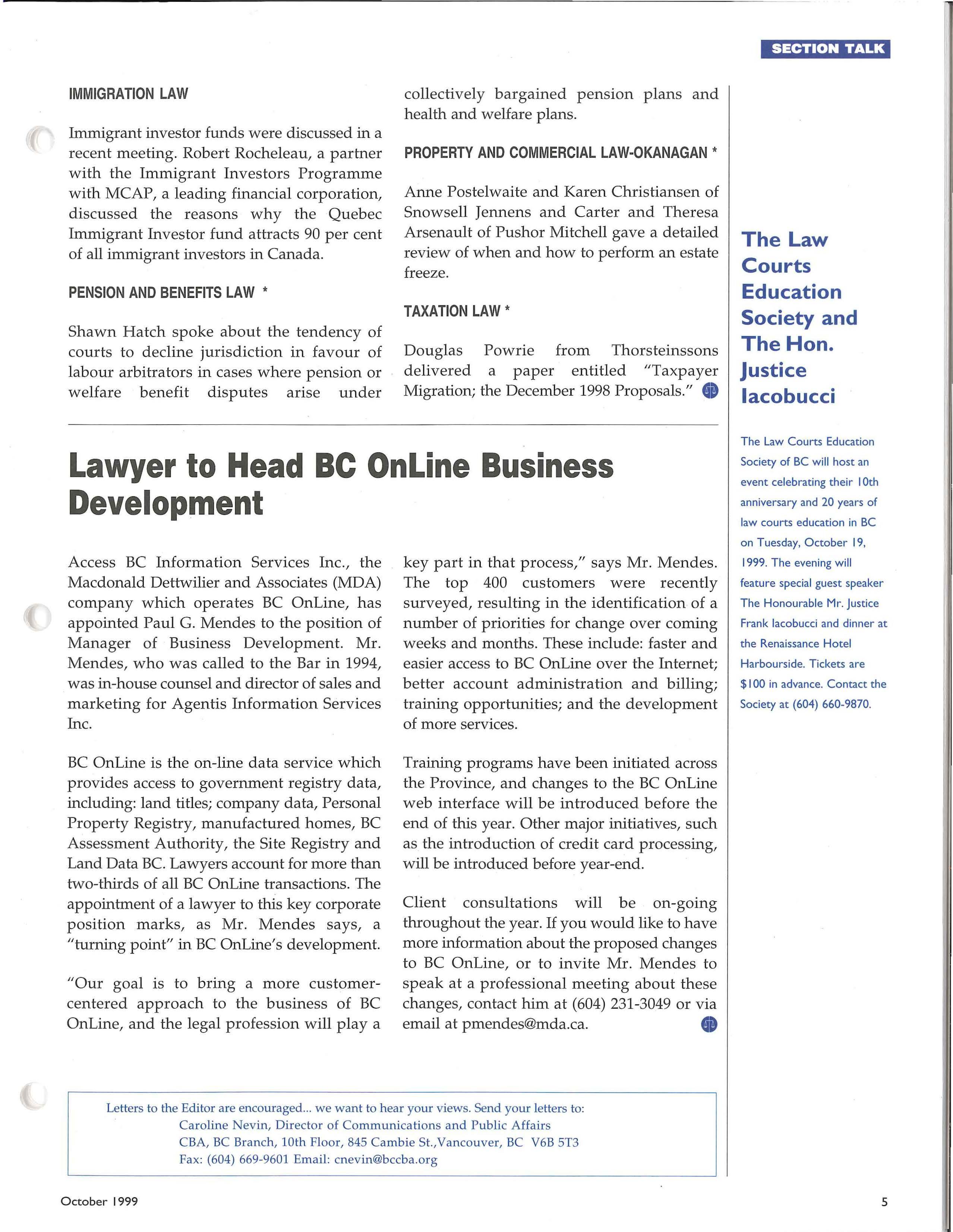 Client consultations will be on-going throughout the year. If you would like to have more information about the proposed changes to BC OnLine, or to invite Mr. Mendes to speak at a professional meeting about these changes, contact him at (604) 231 -3049 or via email at pmendes@mda.ca. G