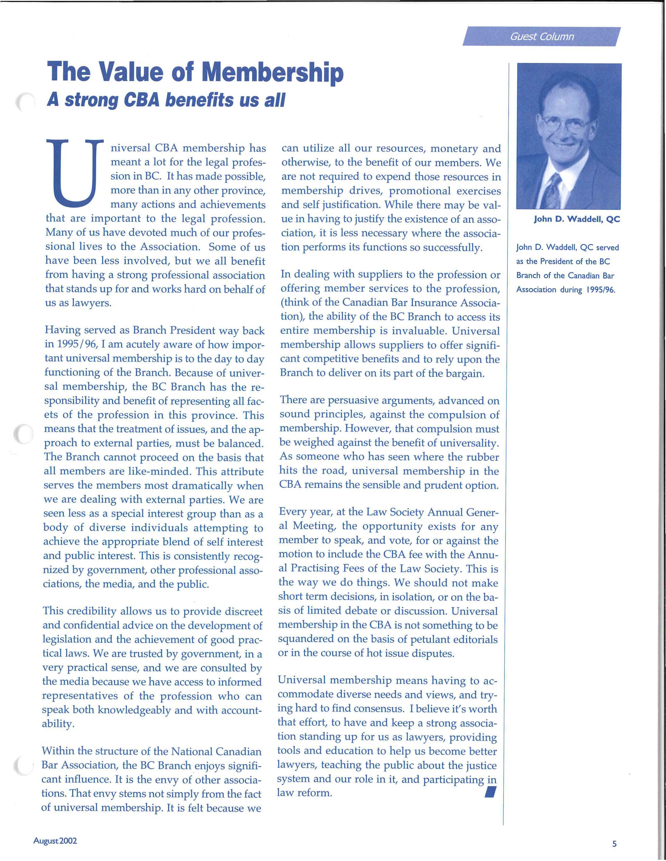John D Waddell, QC served as the President of the BC Branch of the Canadian Bar Association dur ing 1995/96