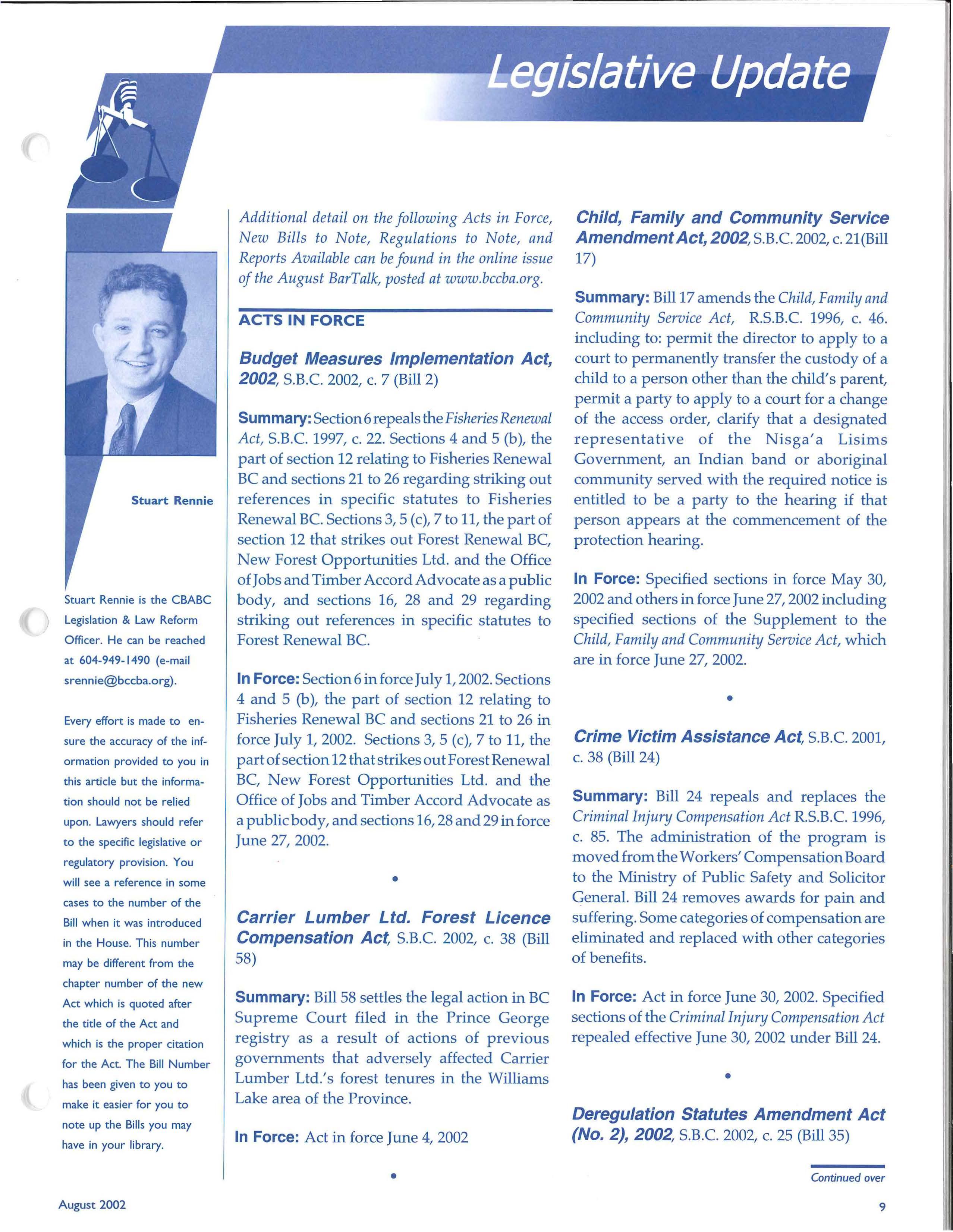 • Legislation & Law Reform Officer: STUART RENNIE (in Port Moody) 604-949-1490 srennie@bccba.org