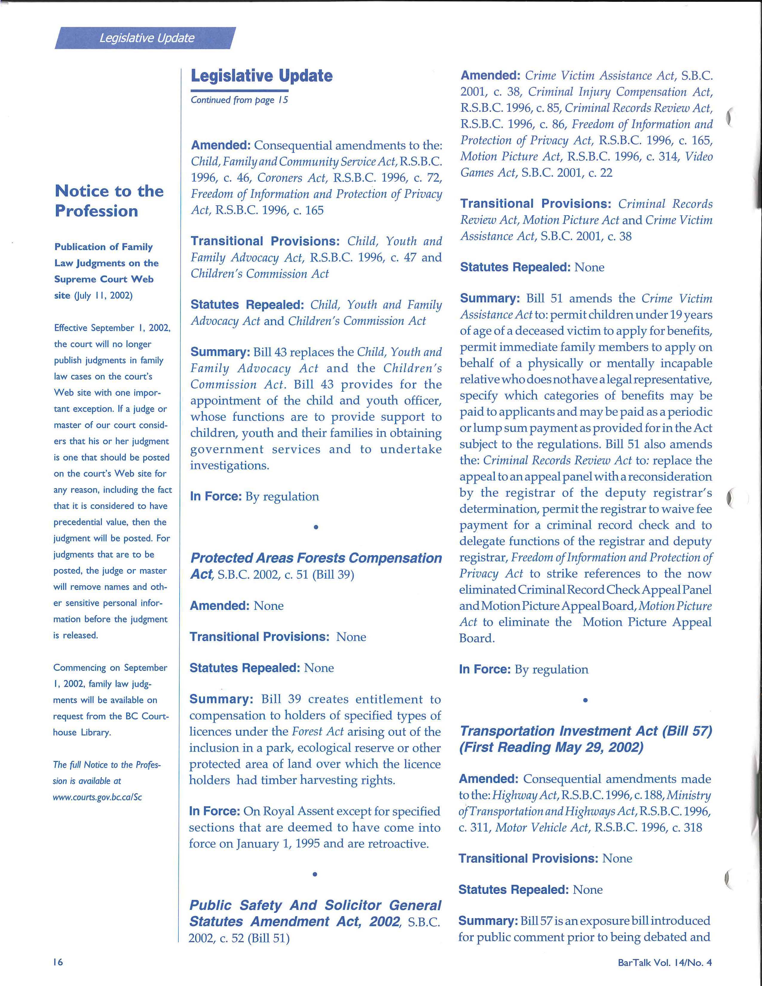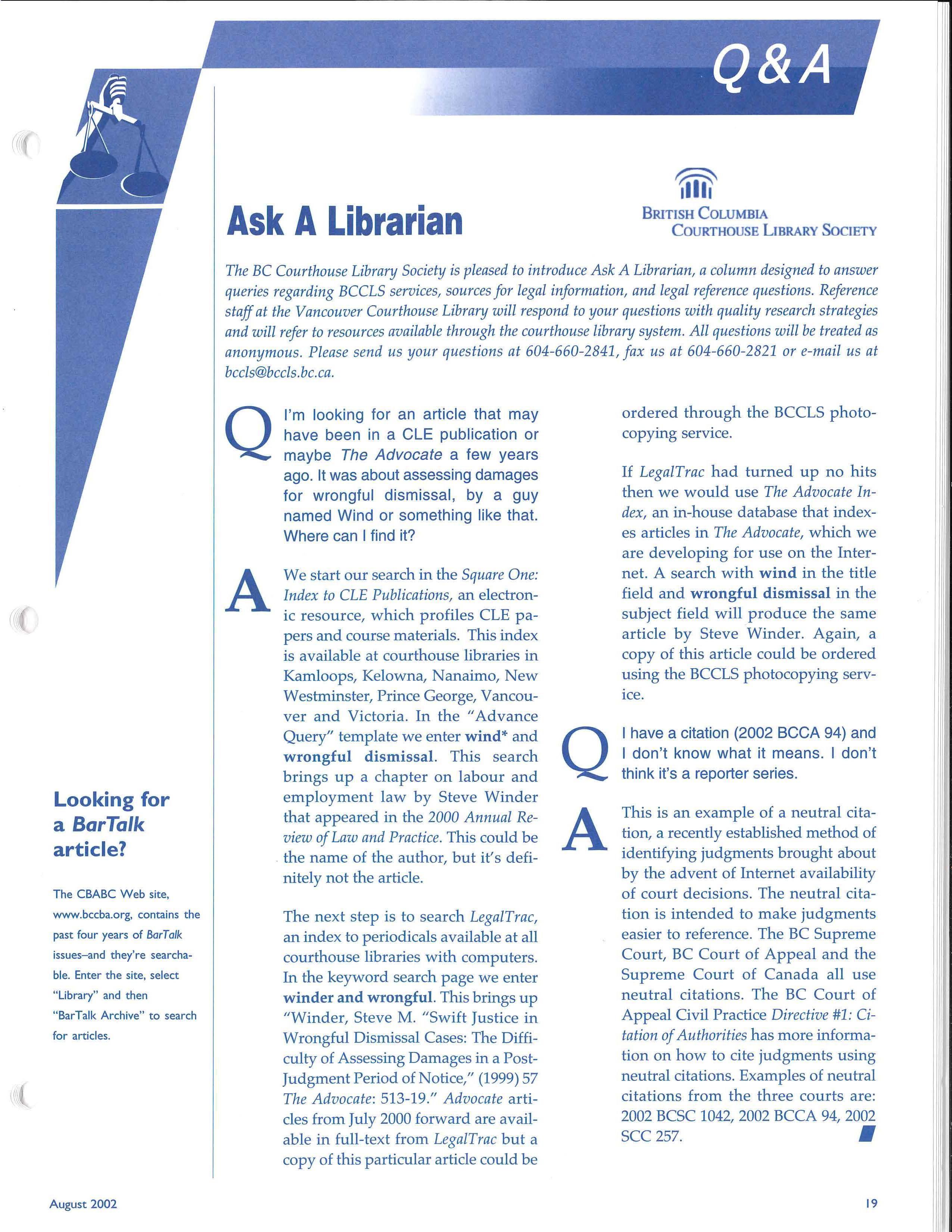 Judgments will continue to be available through legal publishers, in the court registries and, as of September 1, 2002, on request from the BC Courthouse Library. •