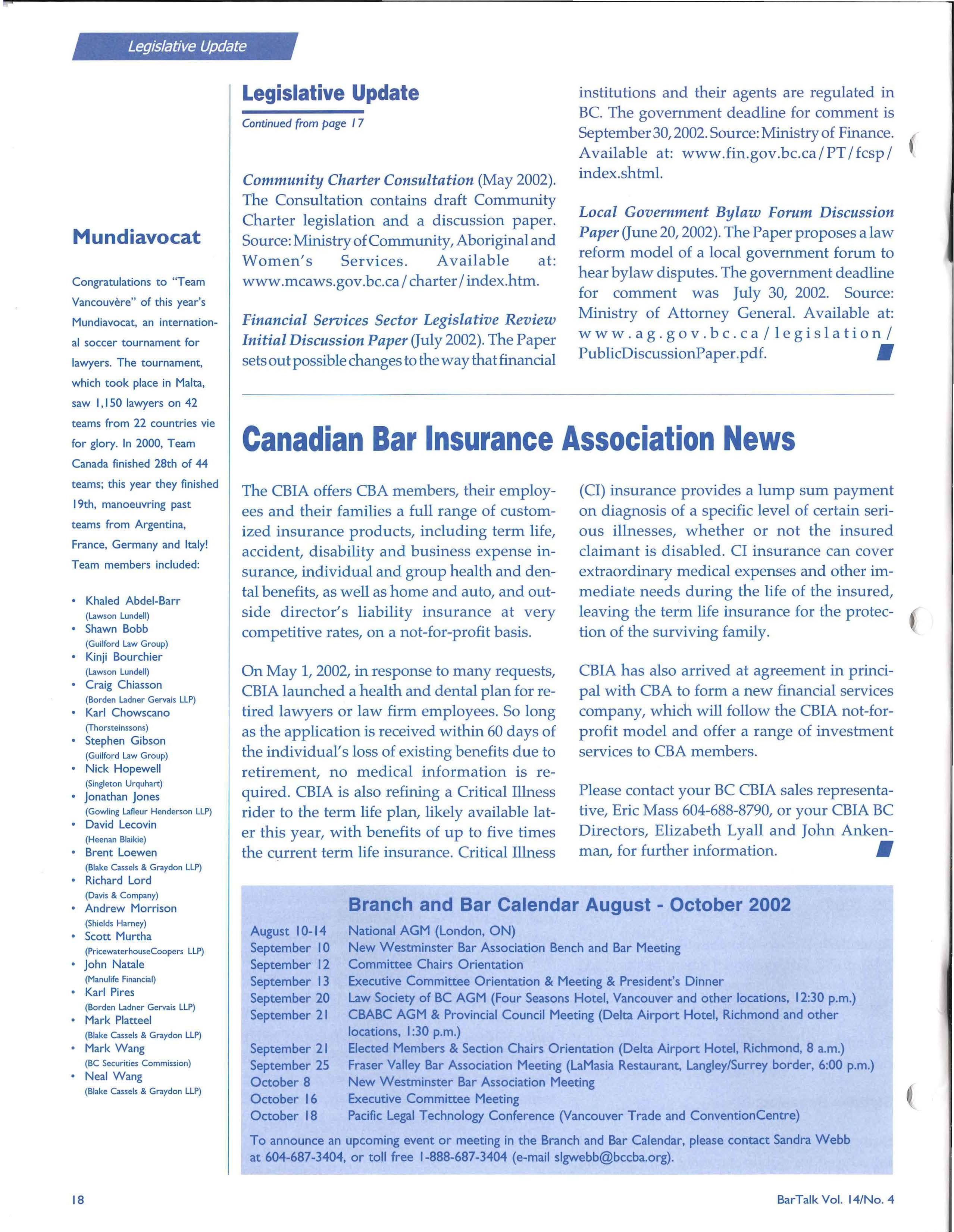 Annual General Meeting of the Canadian Bar Association, BC Branch September 21, 2002, Delta Airport Hotel, Richmond, 1:30 p.m. (plus nine other locations) For more information on the meeting, visit www bccba.org or call 604-687-3404 (1-888-687-3404) •