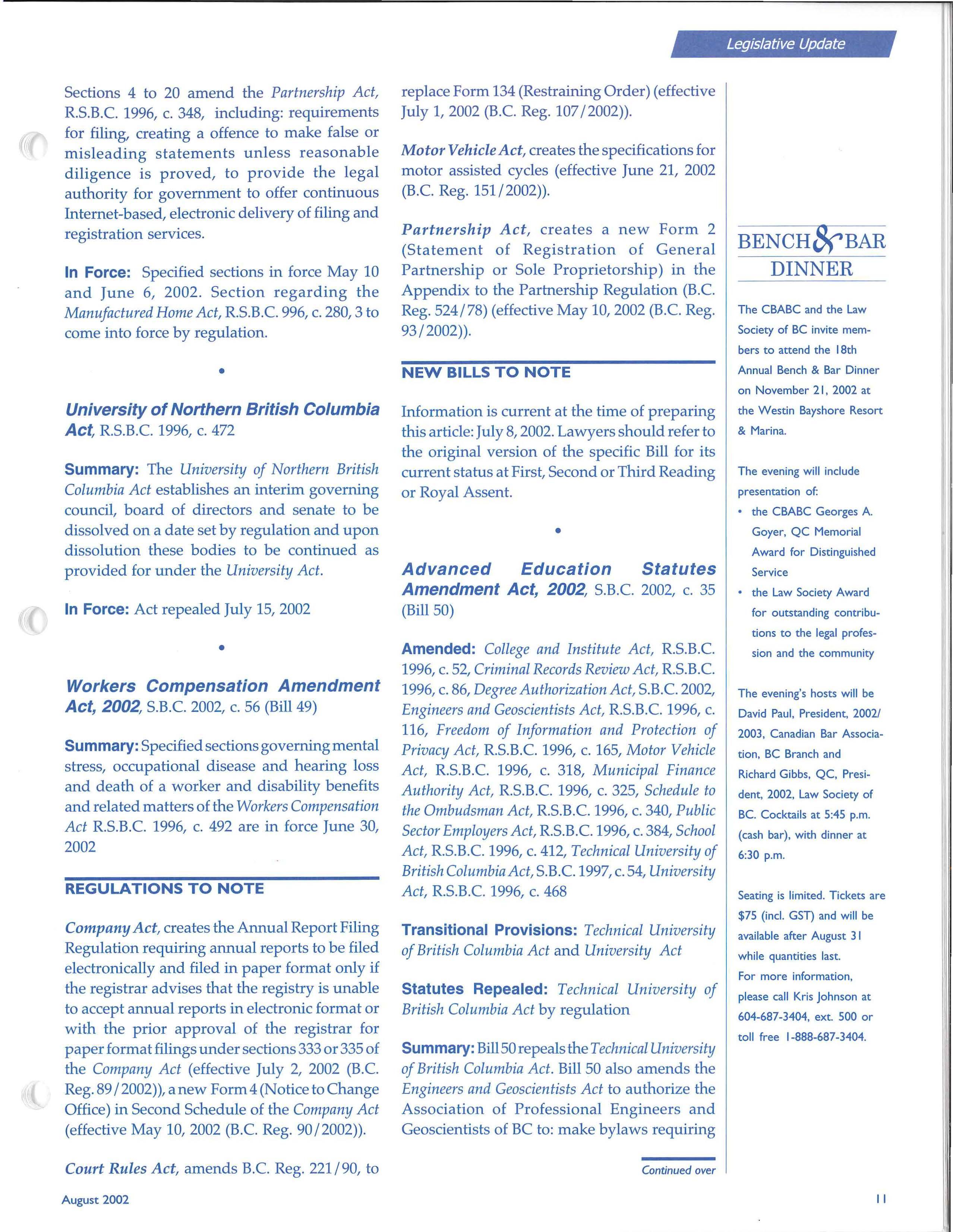 Annual General Meeting of the Law Society of BC September 20, 2002, Four Seasons Hotel, Vancouver, 12:30 p.m . (plus eight other locations) For more information on the meeting, visit www.lawsociety.bc.ca or call 604-669-2533