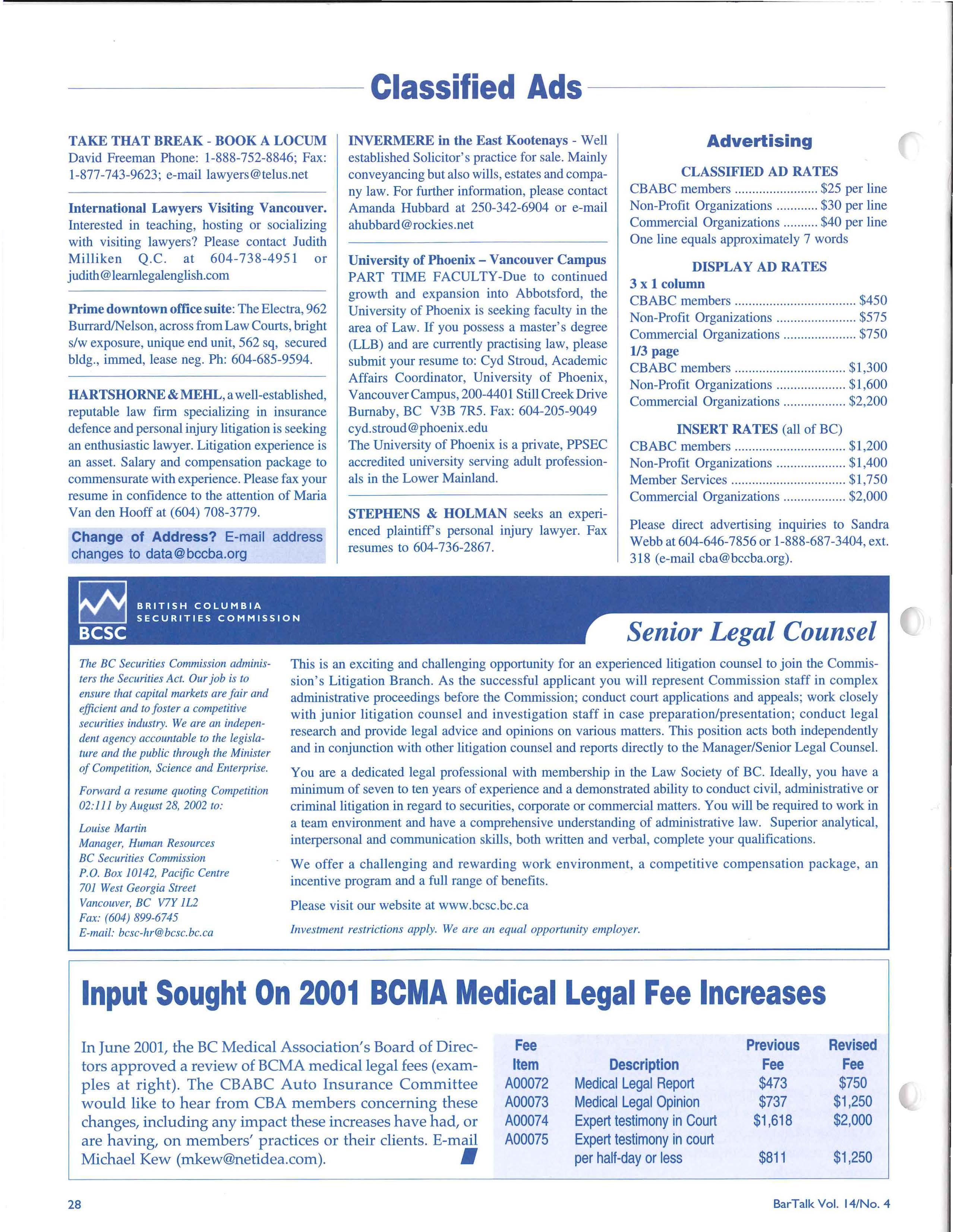 In June 2001, the BC Medical Association's Board of Directors approved a review of BCMA medical legal fees (examples at right). The CBABC Auto Insurance Committee would like to hear from CBA members concerning these changes, including any impact these increases have had, or are having, on members' practices or their clients. E-mail Michael Kew (mkew@netidea.com).