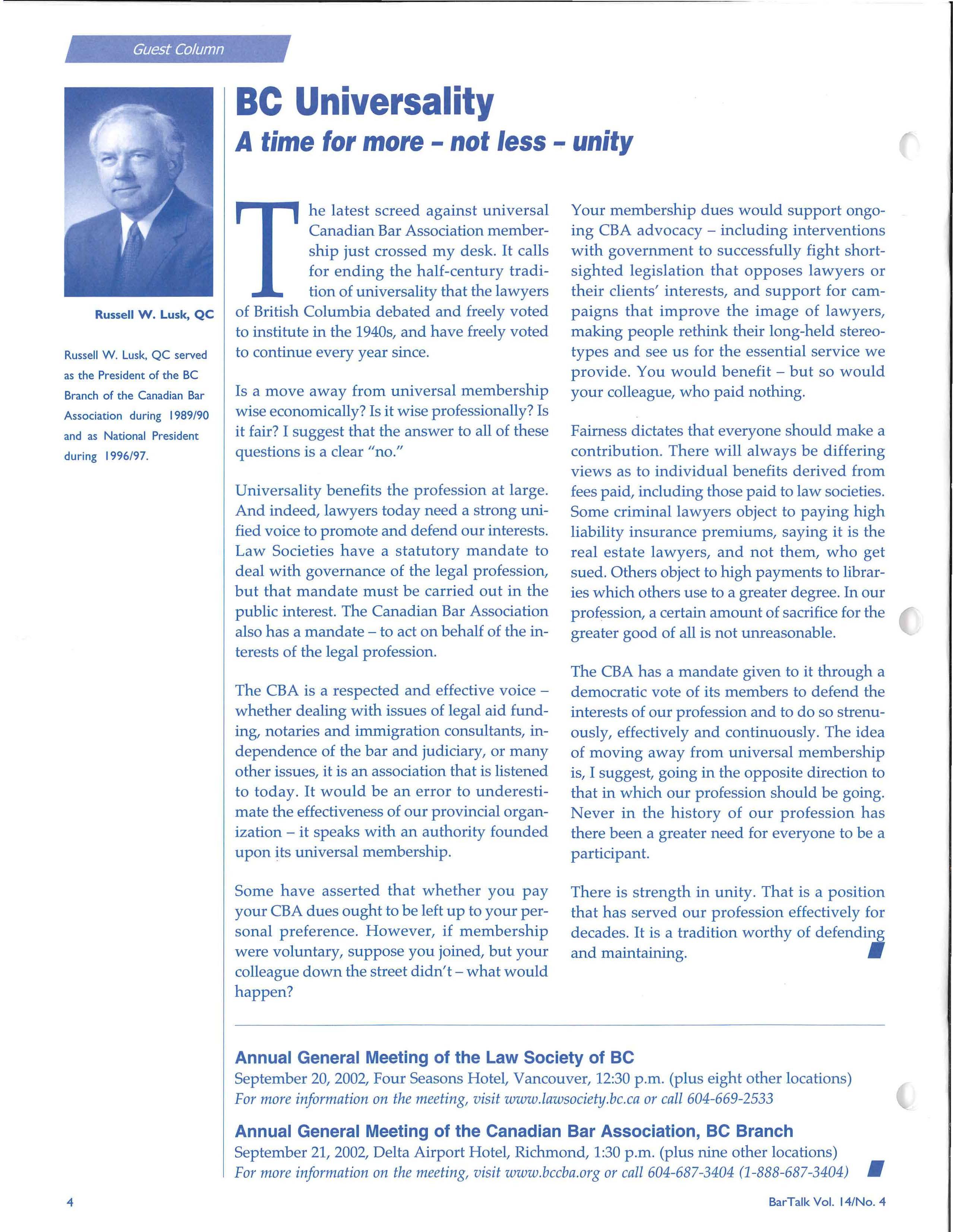 niversal CBA membership has meant a lot for the legal profession in BC. It has made possible, more than in any other province, many actions and achievements that are important to the legal profession. Many of us have devoted much of our professional lives to the Association. Some of us have been less involved, but we all benefit from having a strong professional association that stands up for and works hard on behalf of us as lawyers.