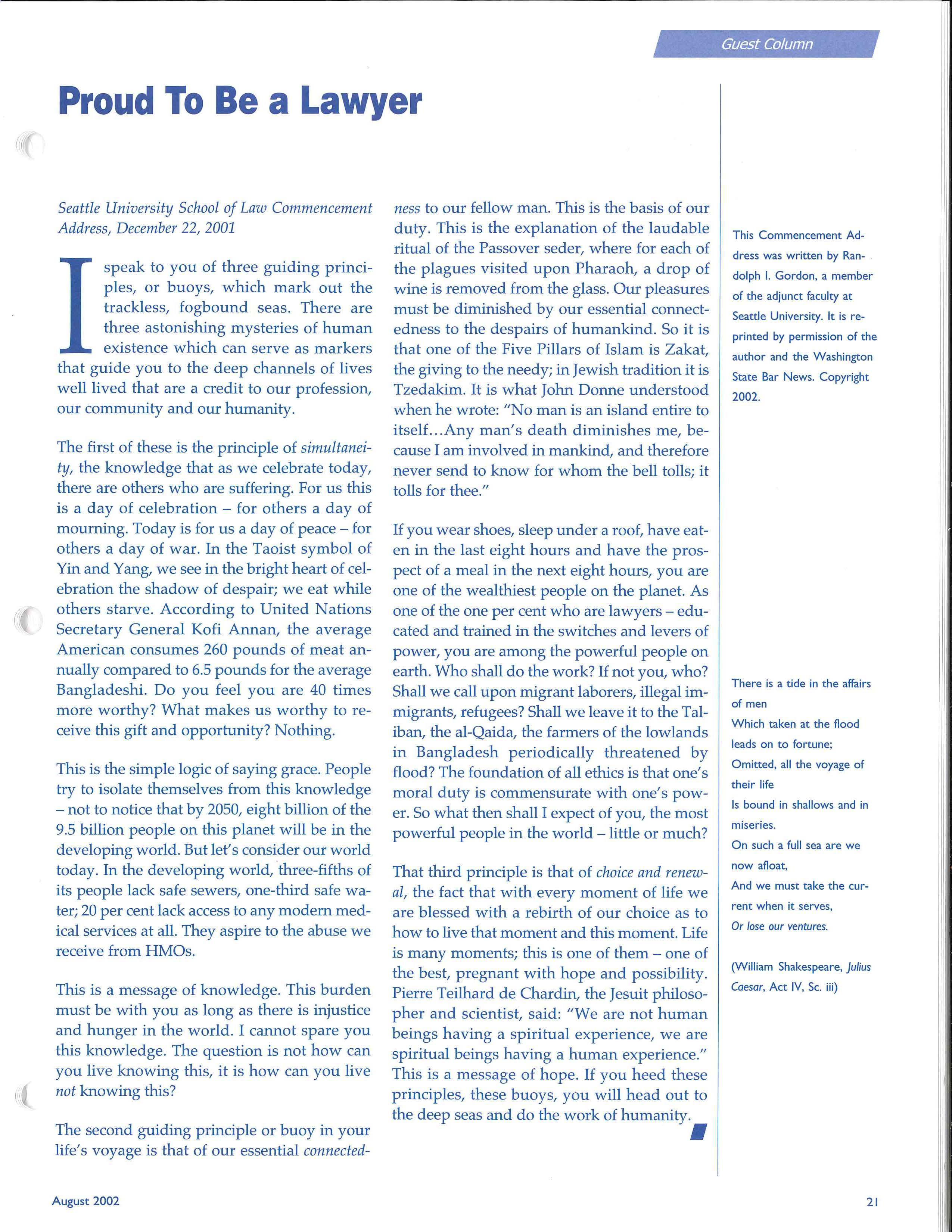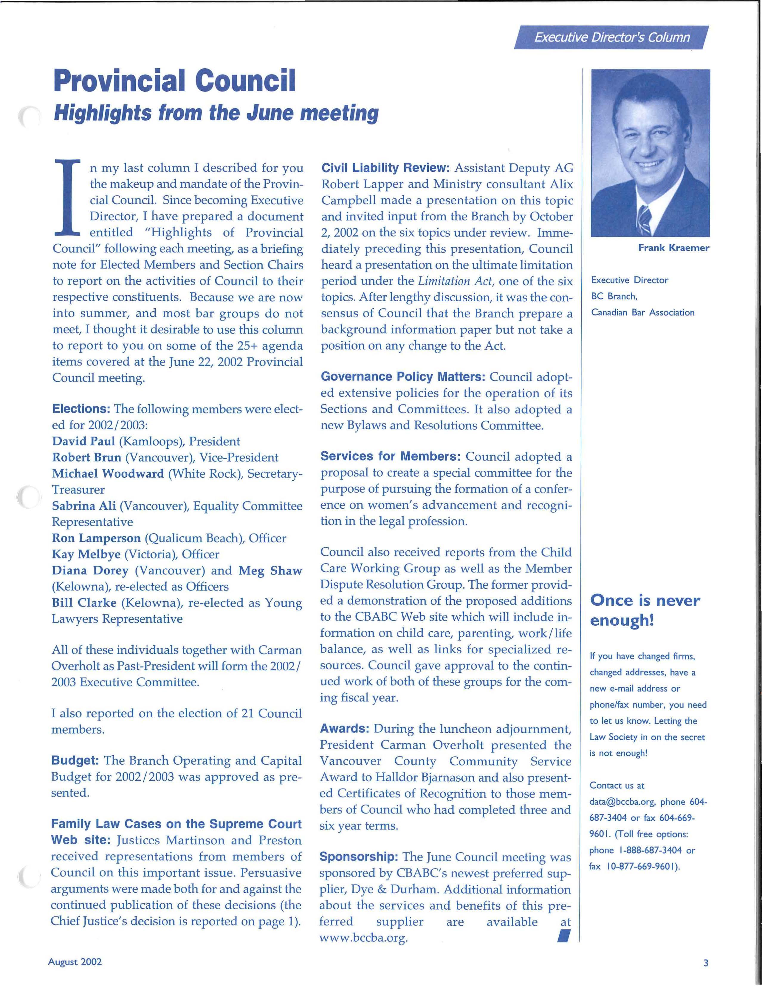 n my last column I described for you the makeup and mandate of the Provincial Council. Since becoming Executive Director, I have prepared a document entitled "Highlights of Provincial Council" following each meeting, as a briefing note for Elected Members and Section Chairs to report on the activities of Counci l to their respective constituents. Because we are now into summer, and most bar groups do not meet, I thought it desirable to use this column to report to you on some of the 25+ agenda items covered at the June 22, 2002 Provincial Council meeting.