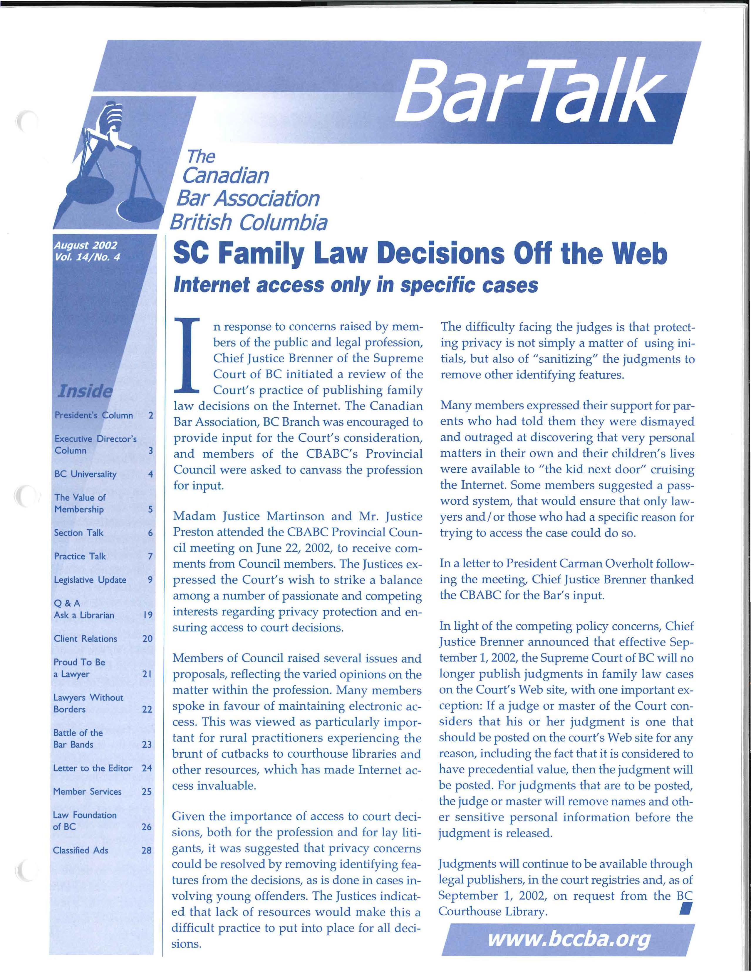 Madam Justice Martinson and Mr. Justice Preston attended the CBABC Provincial Council meeting on June 22, 2002, to receive comments from Council members. The Justices expressed the Court's wish to strike a balance among a number of passionate and competing interests regarding privacy protection and ensuring access to court decisions.