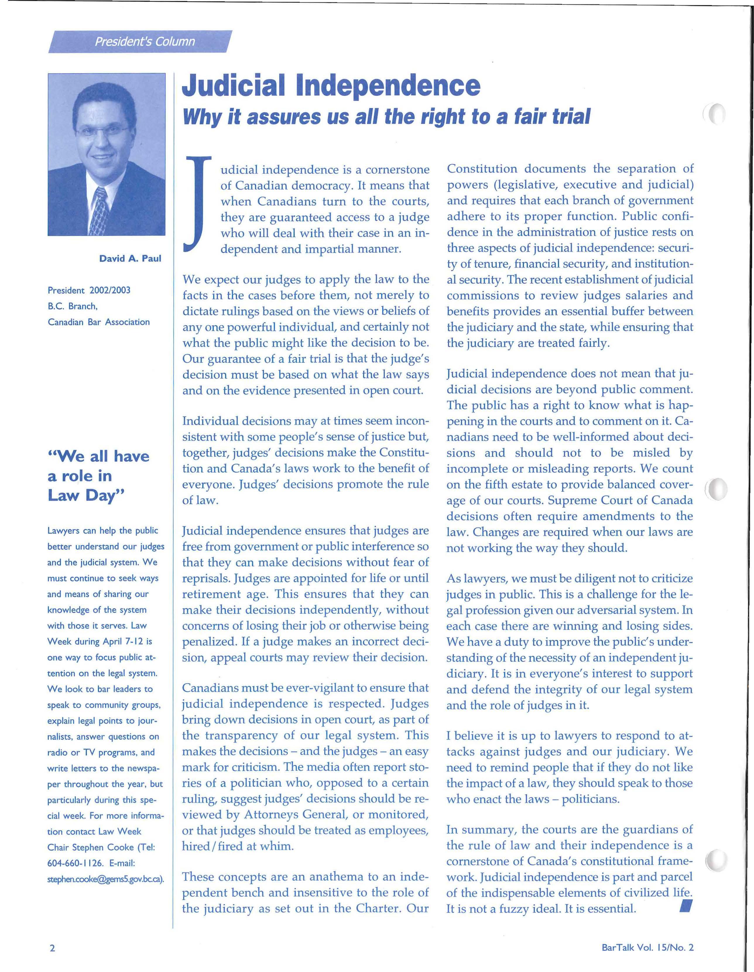 cently undertook some very important work in connection with the provincial government's Civil Liability Review as well as proposed amendments to the Health Professions Act. Similarly, the Advisory Committee to the Judicial Council of B.C. prepares confidential reports for consideration by the Judicial Council of prospective candidates for appointment to the Provincial Court. I invite you to review the mandates of the CBABC's various committees which are included as an insert in this issue of BarTalk and are also available at www bccba.org in the CBA News Room