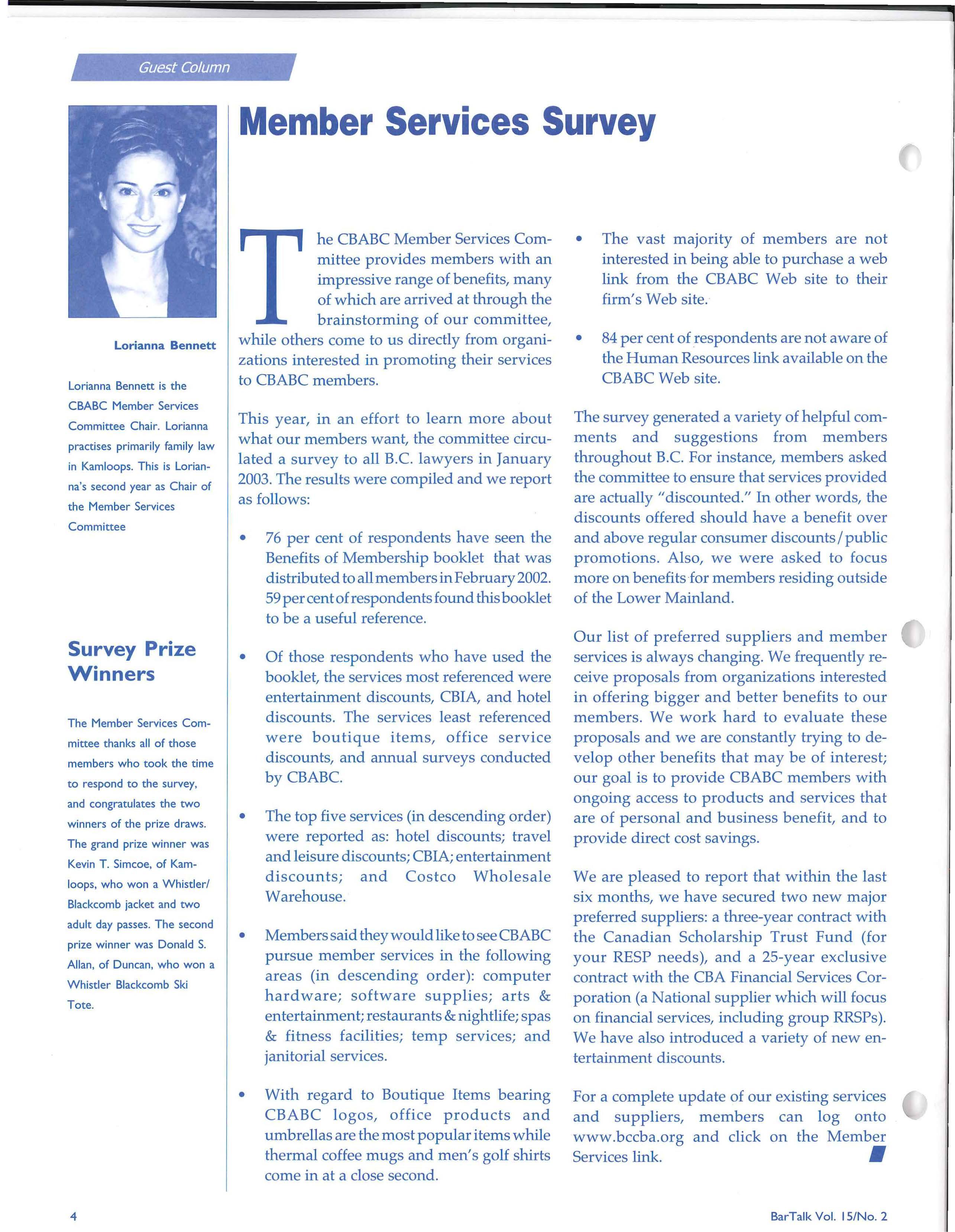 This year, in an effort to learn more about what our members want, the committee circulated a survey to all B.C. lawyers in January 2003 The results were compiled and we report as follows: