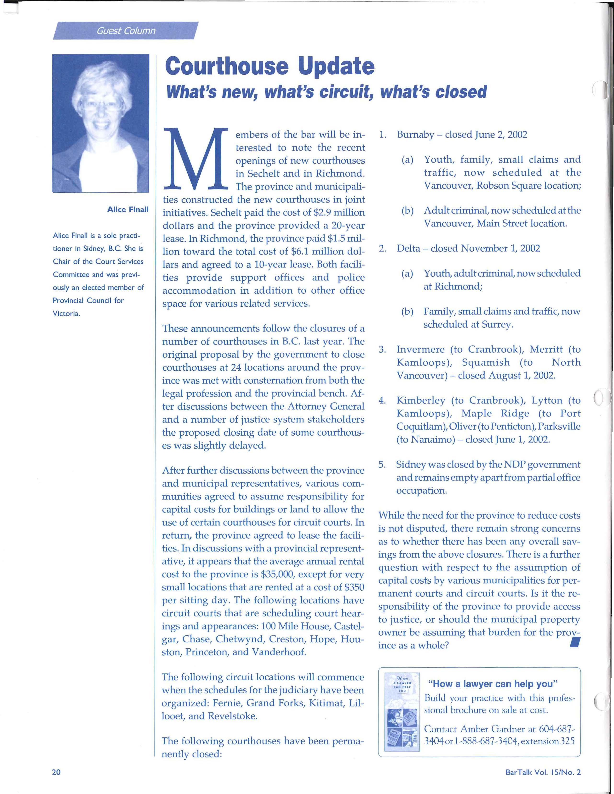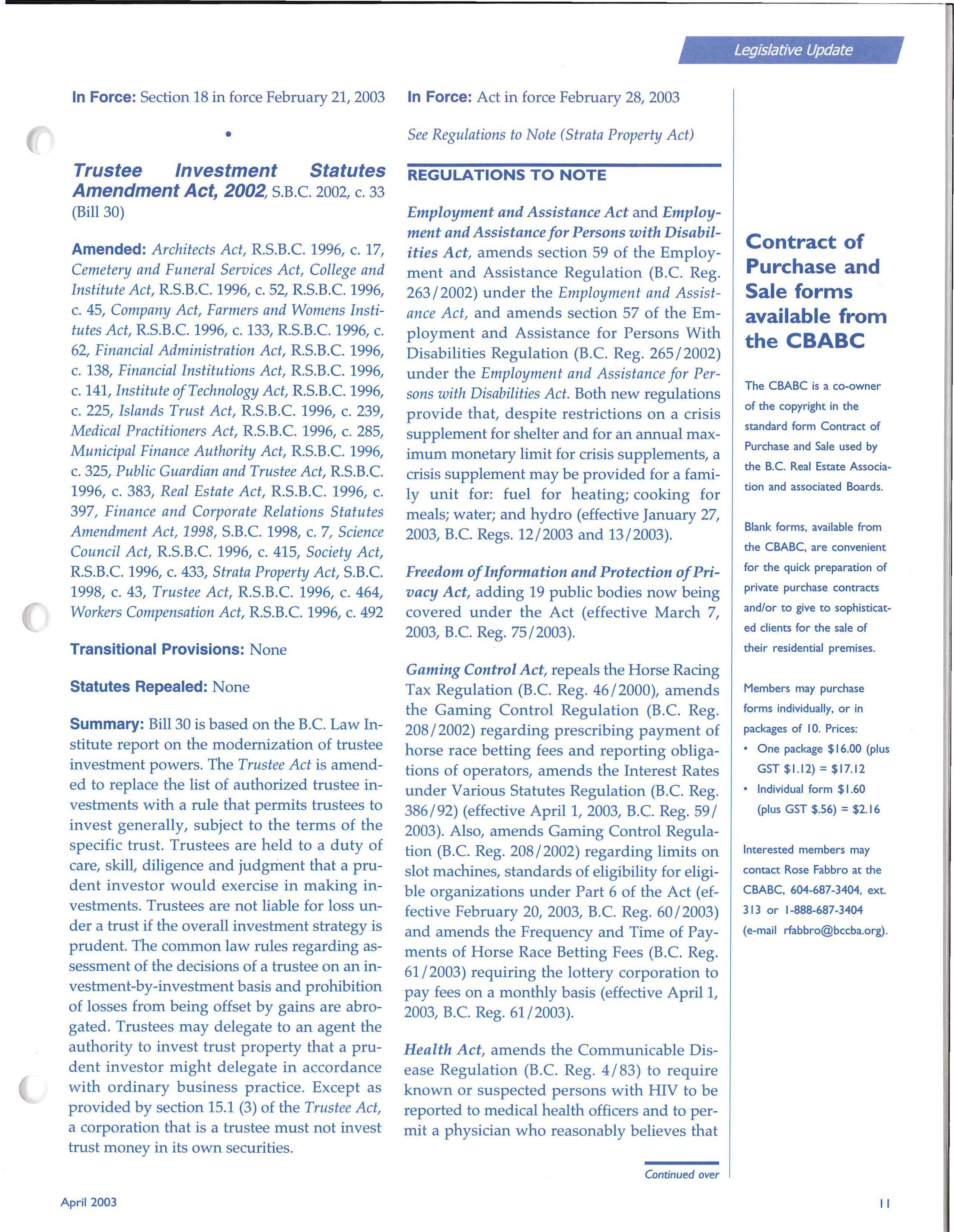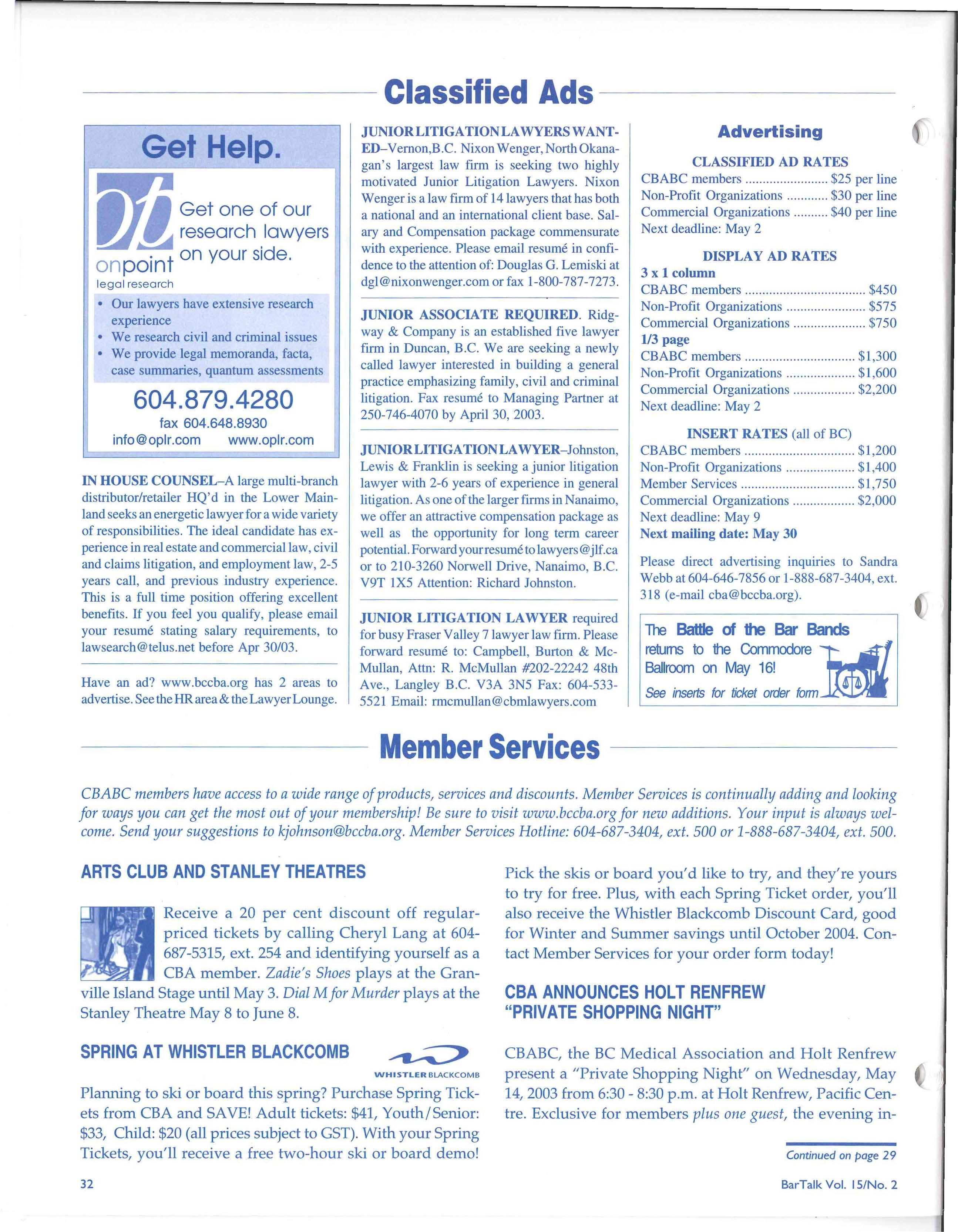 Please direct advertising inquiries to Sandra Webb at 604-646-7856 or 1-888-687-3404, ext. 318 (e -mail cba@bccba.org)