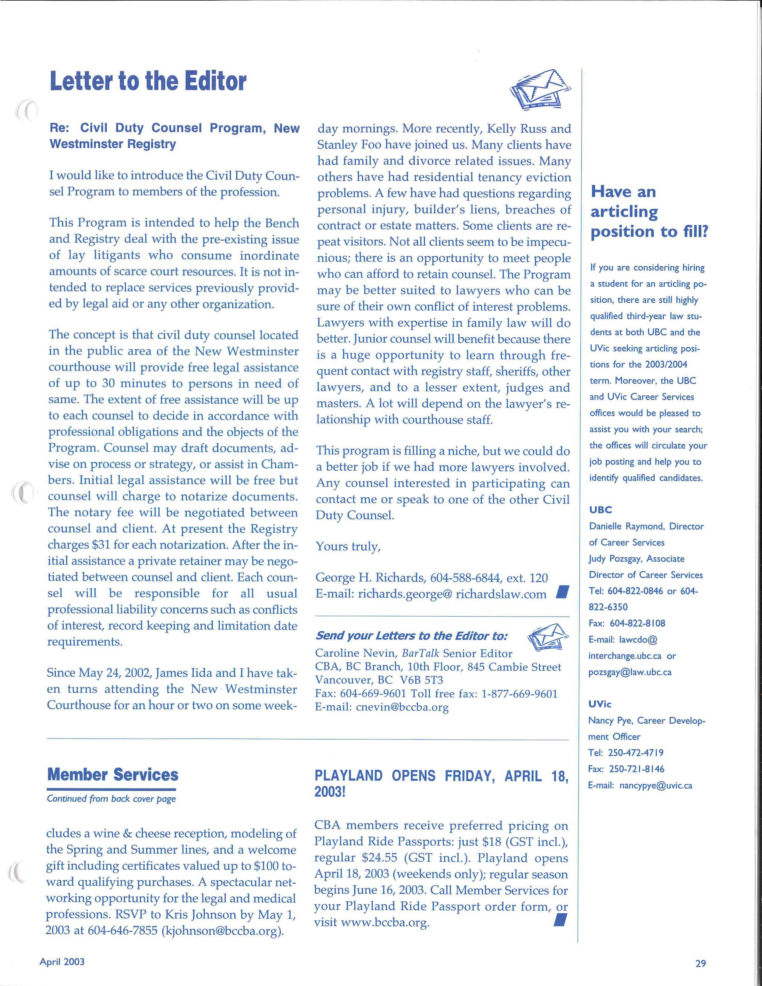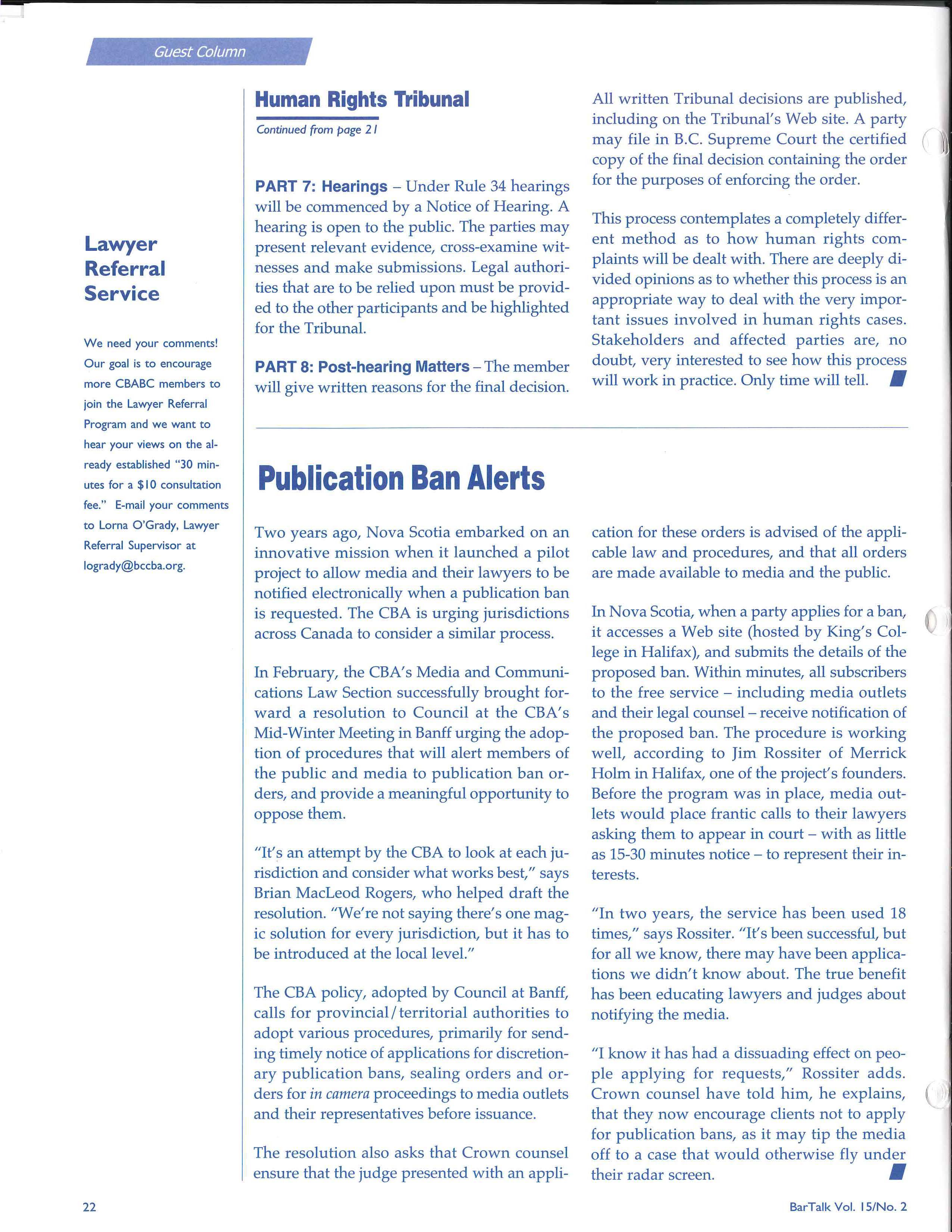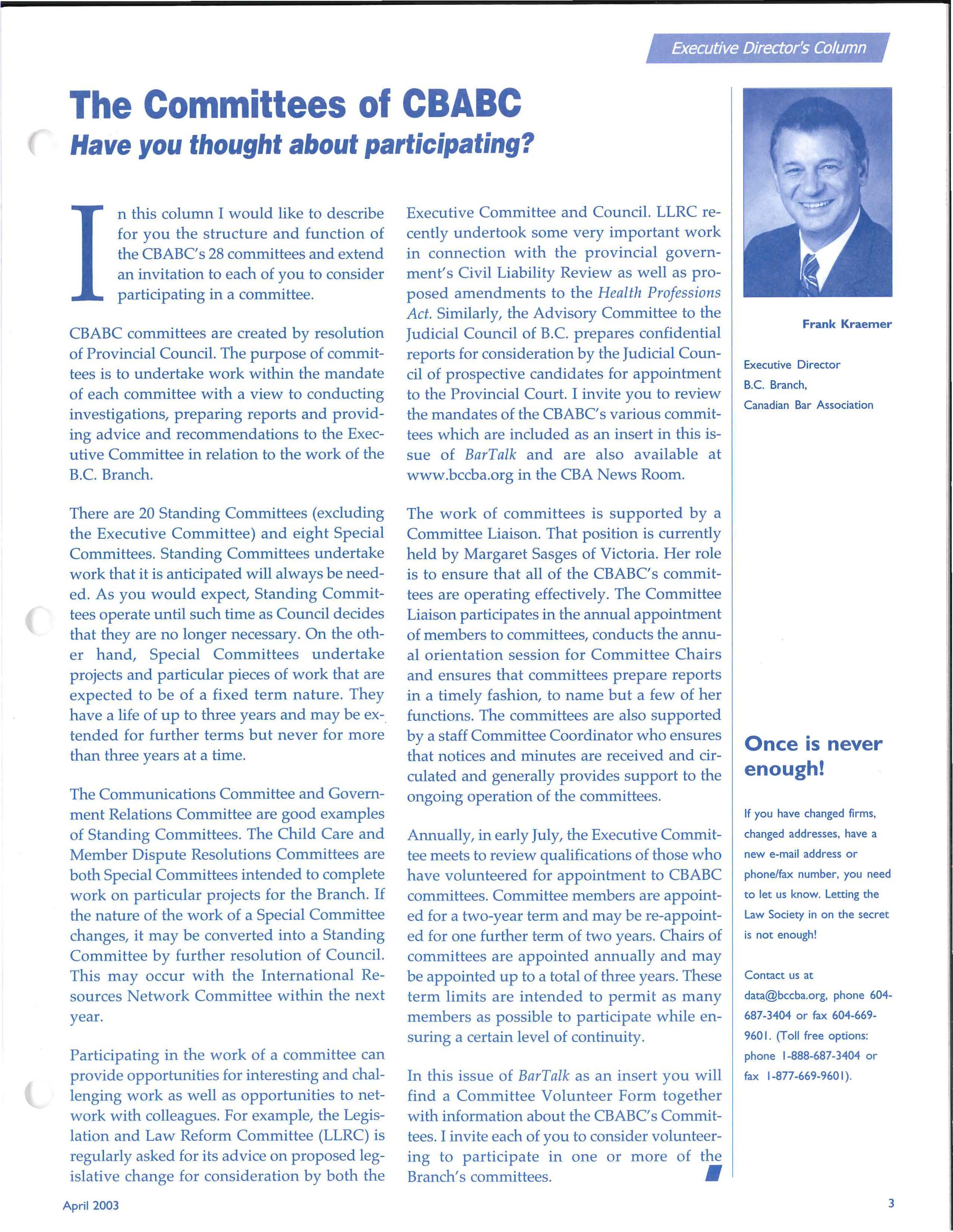 In this issue of BarTalk as an insert you will find a Committee Volunteer Form together with information about the CBABC's Committees. I invite each of you to consider volunteering to participate in one or more of the Branch's committees. •