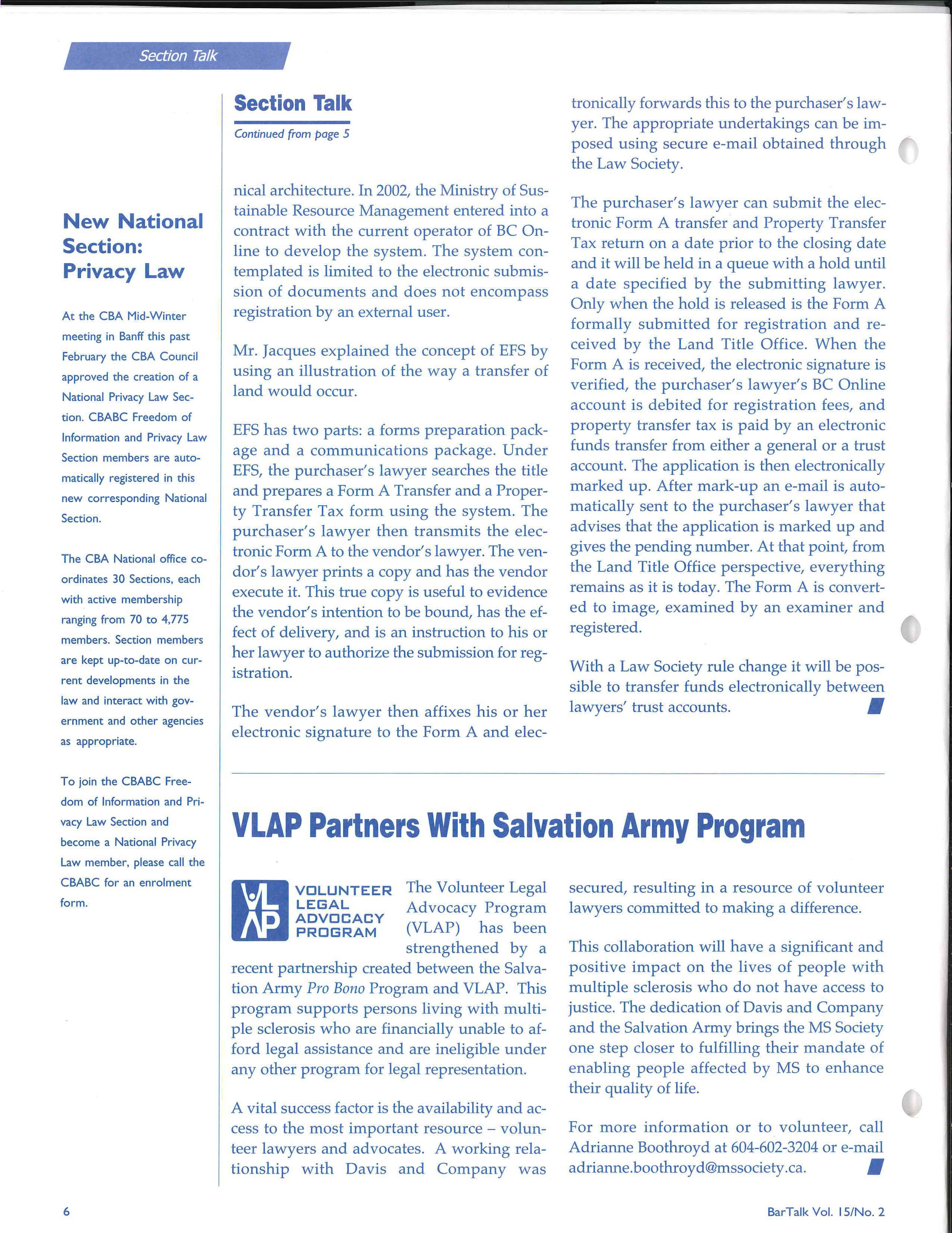 Kenneth Jacques of the Land Title Office and Ron Usher of the Law Society of B.C. spoke to Section members about electronic filing of documents at the Land Title Office, expected to be implemented in 2004 . In 1998, an electronic filing committee was formed with representatives from the Law Society of B C., the CBABC, the Society of Notaries Public, CLE and the Land Title Branch . Its purpose was to assist in the development of the Electronic Filing System (EFS) by providing input on legislation and regulatory policy and to ensure that the design of the system met user and legislative requirements. In 1999, legislation was passed to provide the legislative framework for an EFS. In 2000 and 2001 the Land Title Branch developed its EFS functional and tech-