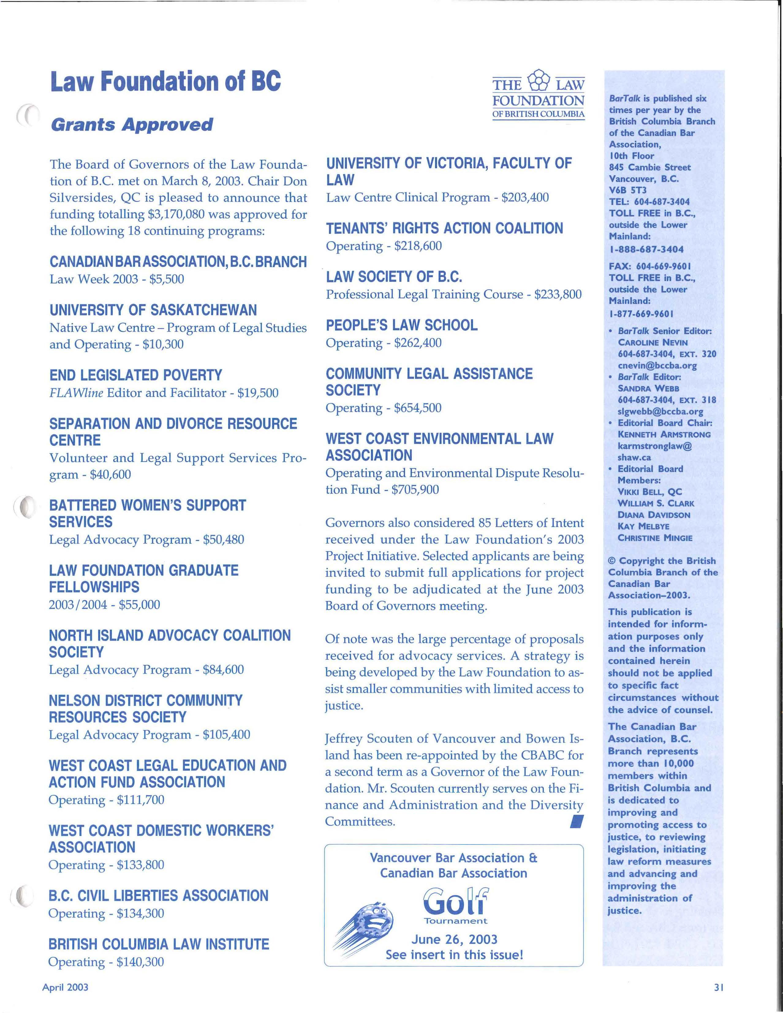 The Board of Governors of the Law Foundation of B.C. met on March 8, 2003. Chair Don Silversides, QC is pleased to announce that funding totalling $3,170,080 was approved for the following 18 continuing programs:
