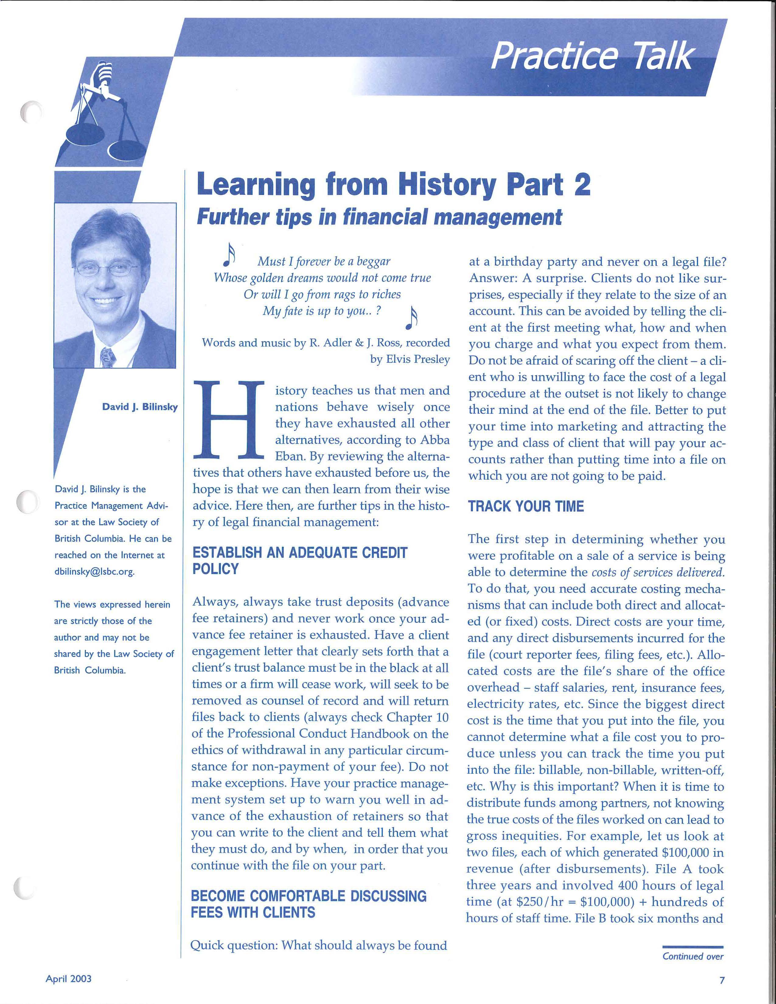 David J. Bili nsky is t he Pract ice Management Advisor at the Law Society of British Columbia He can be reached on the Internet at dbi linsky@ lsbc org.